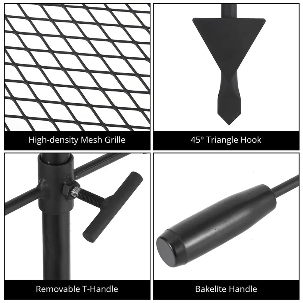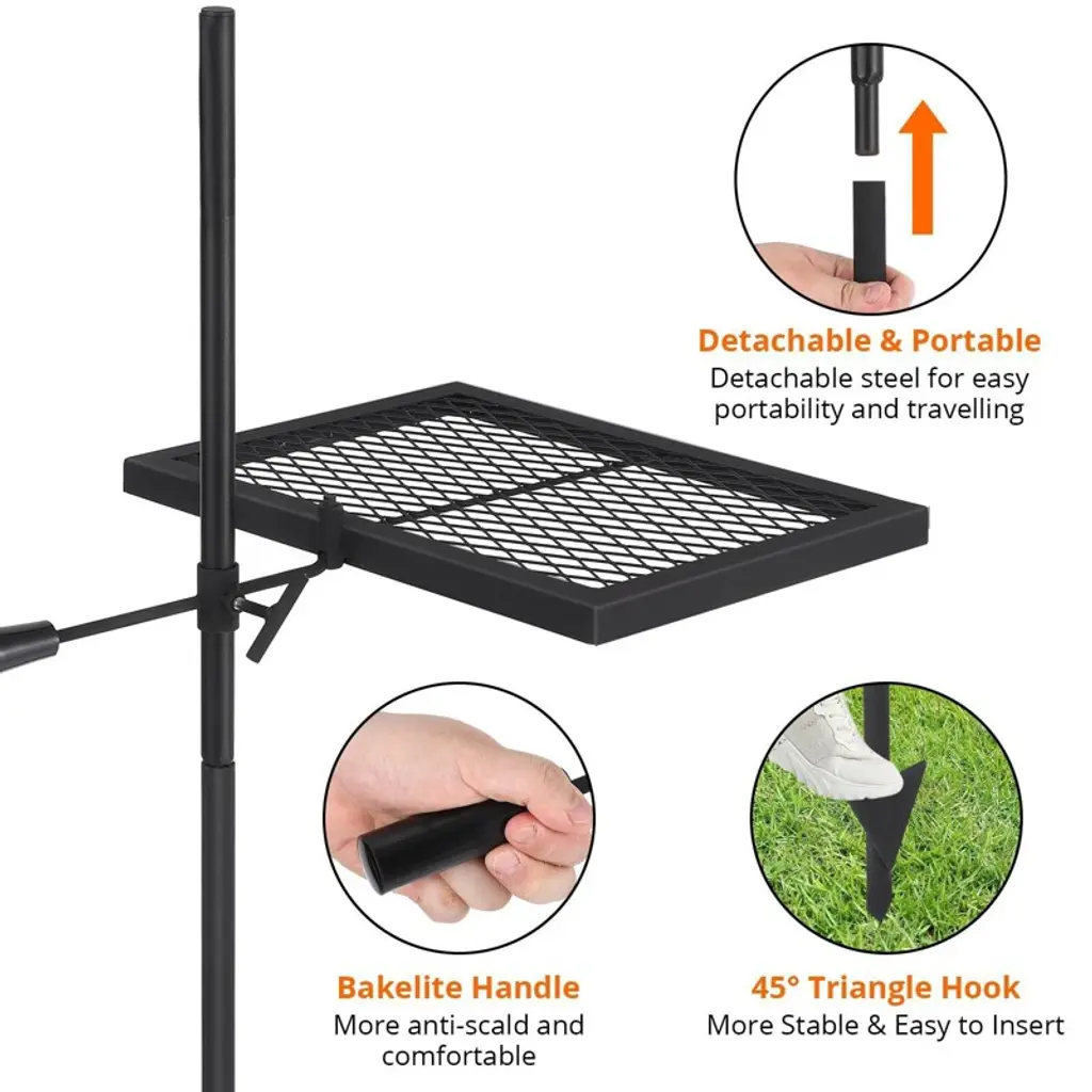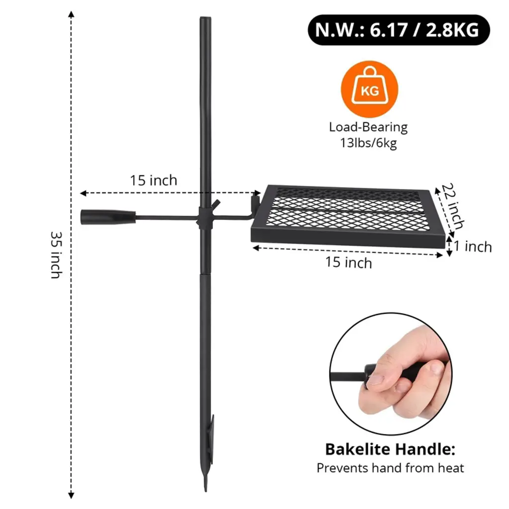 Enhance your outdoor cooking experience with our over-fire grill grate, crafted from durable steel with a rust-resistant coating. This versatile grill grate withstands high temperatures without warping, making it perfect for grilling everything from juicy steaks to vegetables and kabobs. Durable Construction: Made from robust steel with a protective surface coating, this grill grate resists rust and endures high temperatures without deformation or cracking, ensuring long-lasting performance for all your outdoor cooking needs. Adjustable Height and 360� Rotation: The portable barbecue swivel design allows for easy customization of height and angle, offering precise heat control and effortless rotation for perfect grilling results. Quick and Simple Setup: Set up your outdoor campfire grill in under 3 minutes with just a few easy steps. For optimal stability, ensure the bottom rod is inserted at least 11 inches deep into the ground. Detachable & Portable: Featuring a convenient detachable design and a stylish storage bag, this lightweight and compact grill is ideal for RV camping, hiking, and other outdoor adventures. Versatile Use: This heavy-duty grill is perfect for both camping and backyard fire pits, making it an excellent solution for outdoor cooking, grilling, and BBQs.