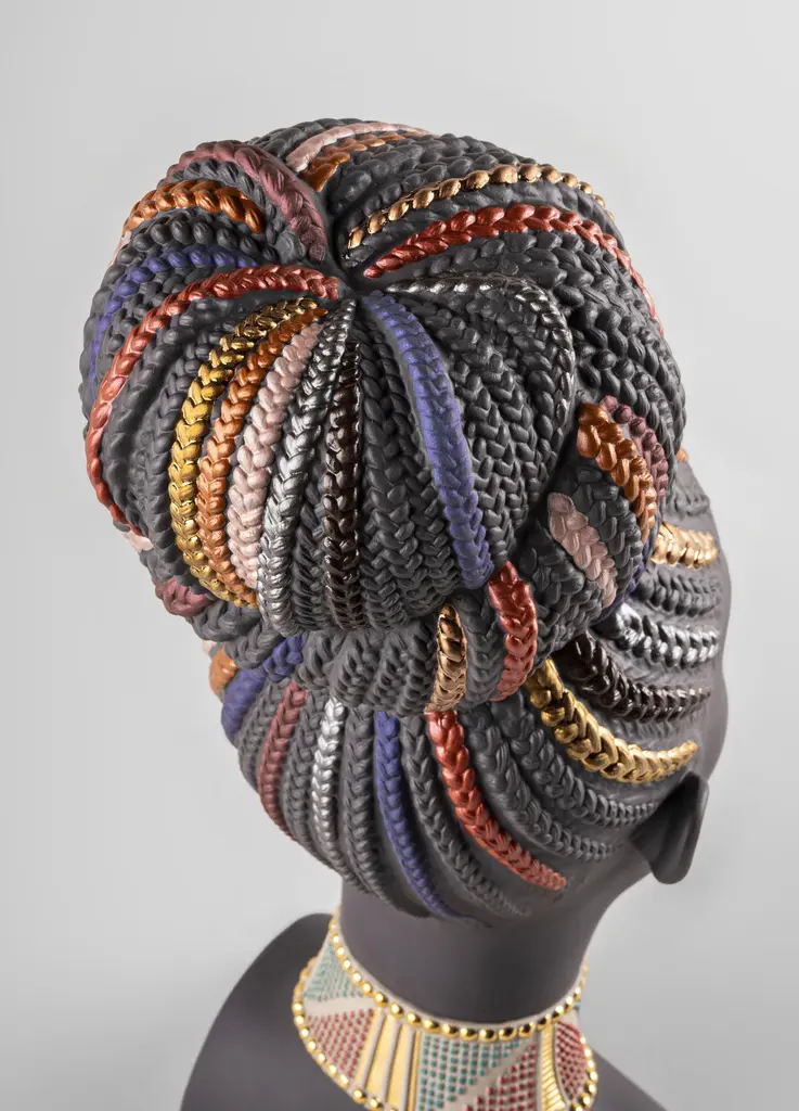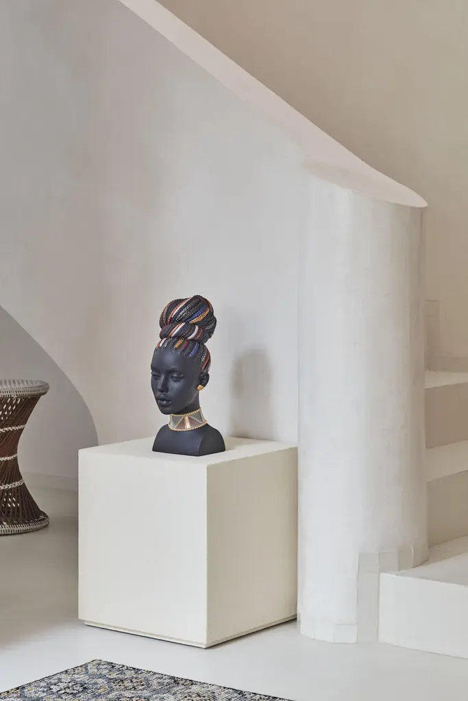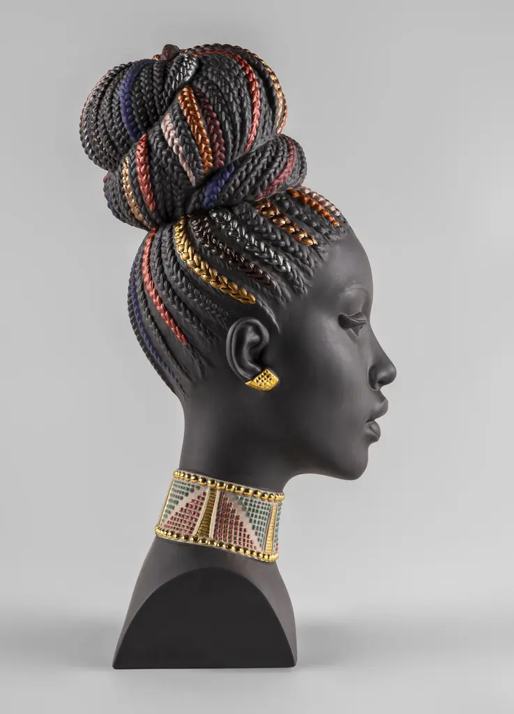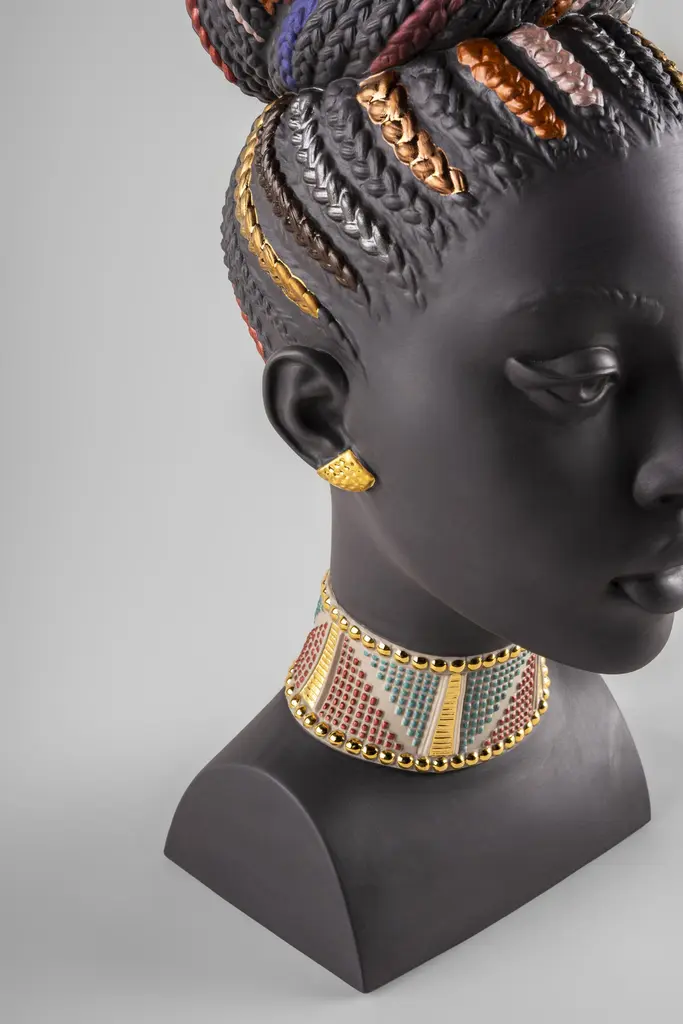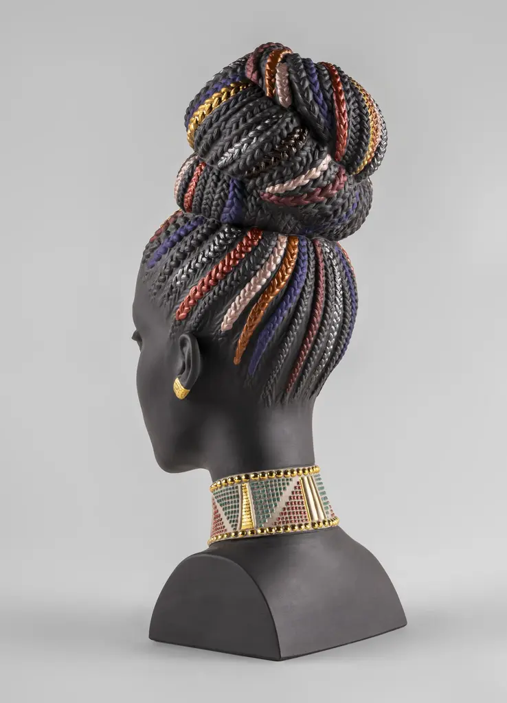 Made in matte black porcelain, this bust of a woman borrows its inspiration from the symbolism and intense coloring of African culture. The serene facial features, masterfully sculpted, are rounded off with a decoration using luster and metallic colors. Particularly noteworthy are the details etched in the earrings and pendant and the ornamental work recreating the intricate braiding of the hair. The result is a creation with great expressive strength that speaks to the character of African art.