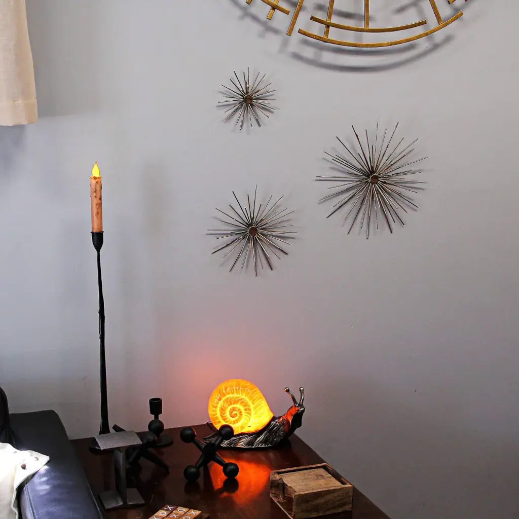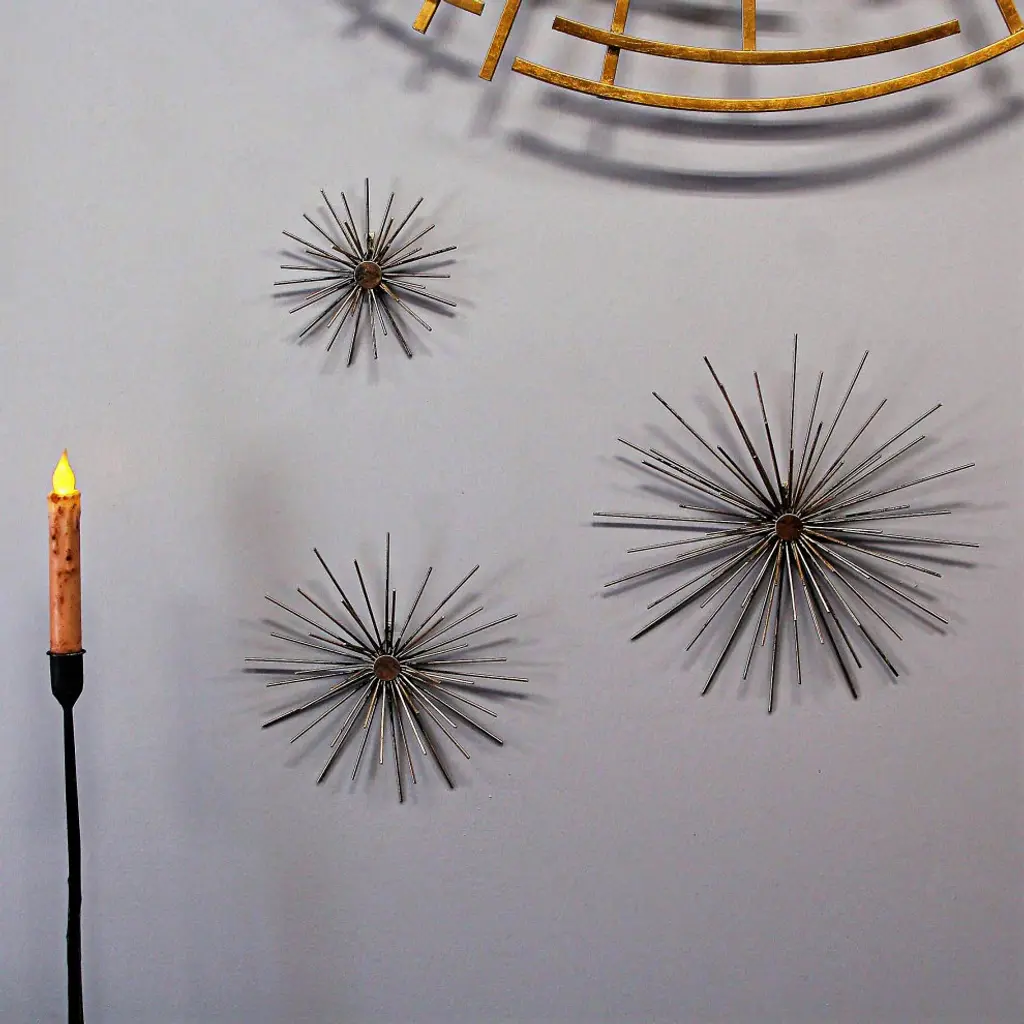 Impressive Dimensions - Revel in the diverse sizes of these wall accents - Large - 12 inches, Medium - 9 inches, and Small - 6 inches in diameter. Each sphere showcases intricate metal craftsmanship, creating a mesmerizing focal point that captivates any observer.Long-Lasting Quality - Crafted from durable metal, these sculptures guarantee years of maintenance-free display. Their sturdy construction ensures they remain a timeless adornment, adding an artistic allure to your space without worrying about wear and tear.Elegant Brass Finish - Embrace the charm of antiqued brass, which gracefully illuminates any room. The warm, golden tones add a touch of sophistication, lending a cozy ambiance to your space while effortlessly enhancing your decor''s aesthetic appeal.Effortless Installation - Designed with triangular metal hangers on their backs, these accents are a breeze to hang. Transform your room swiftly, letting the captivating starburst design take center stage, captivating onlookers with its celestial beauty.Chic Room Enhancements - Elevate your decor effortlessly with these stylish accents. Their elegant presence transforms any space, infusing it with a sense of wonder and refinement. Let the interplay of light and metal redefine your room, creating an ambiance of timeless elegance and artistic brilliance.Transform your walls with these captivating antiqued gold finish wall accents, reminiscent of spiny sea urchins or radiant fireworks. Crafted from thin metal rods, each piece forms a mesmerizing sphere bursting outward from the center. They infuse any room with visual excitement and effortless style, harmonizing seamlessly with other wall decor. Whether hung individually for a focal point or arranged in a series for a sophisticated look, these wall sculptures add a touch of modern charm. The largest sphere boasts a 12-inch diameter, the medium one measures 9 inches, and the smallest stands at 6 inches in diameter. Each sculpture protrudes 1.25 inches from the wall, creating a dynamic three-dimensional effect. These pieces evoke a midcentury modern vibe, blending timeless elegance with contemporary flair. Elevate your home decor with these unique and versatile wall art sculptures, showcasing your taste for the extraordinary and your love for all things modern and artistic. Perfect for making a bold statement and adding a touch of celestial elegance to your space.
