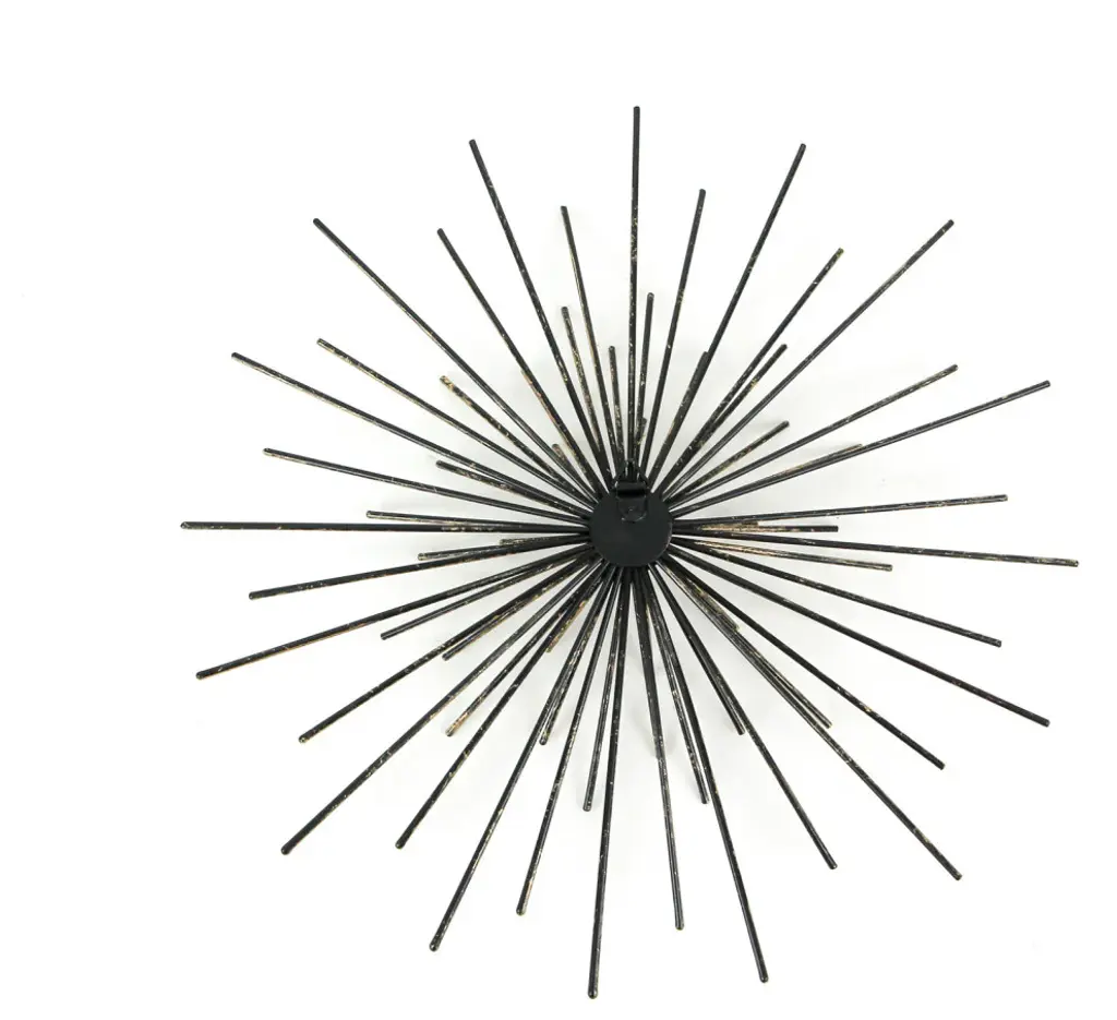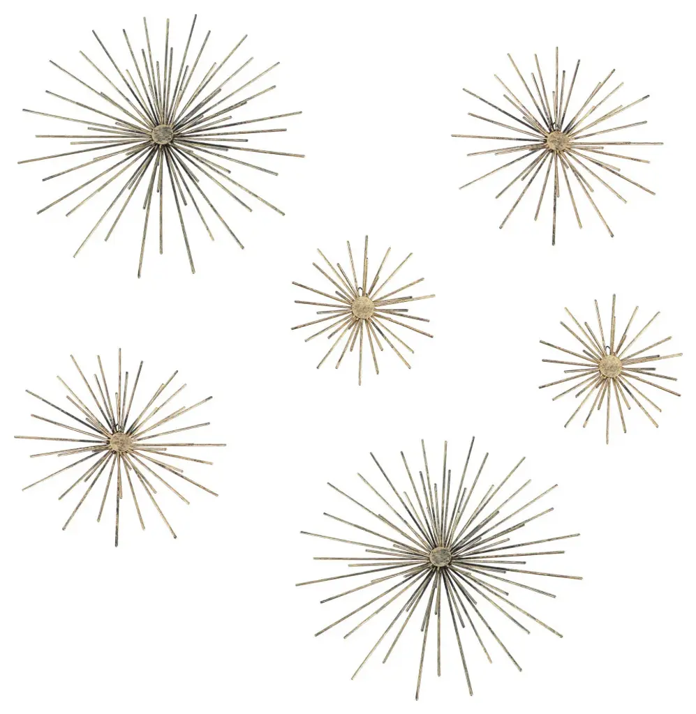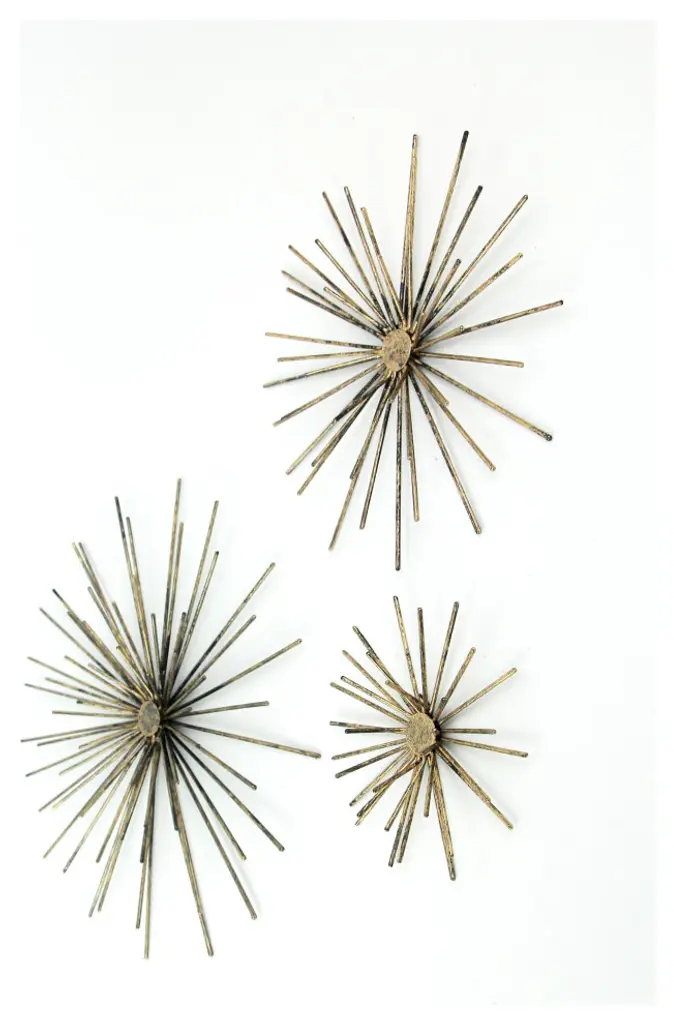 Sculpture Sizes - Large Burst - 12 Inches in Diameter; Medium Burst - 9 Inches in Diameter; Small Burst - 6 Inches in Diameter.Robust Construction - Made from Durable Metal, Ensuring Long-Lasting and Maintenance-Free Display.Antique Brass Elegance - The Antiqued Brass Finish Radiates Timeless Charm, Illuminating Every Space.Hassle-Free Installation - Equipped with Triangular Metal Hangers on the Backs for Easy Hanging on Any Wall.Elegant Statement - This Set Enhances the Décor of Any Room, Adding a Touch of Class and Sophistication.Elevate your home decor with these captivating metal wall sculptures featuring a mesmerizing burst of rays in an antiqued brass finish. Inspired by midcentury modern aesthetics, these starburst accents evoke a sense of timeless elegance. Resembling spiny sea urchins or floating dandelions, these pieces consist of thin metal rods radiating from the center, creating a visually stimulating effect. Whether adorning your living room, bedroom, or any other space, these wall sculptures bring an air of sophistication and artistic charm. Their unique design offers a versatile style, blending seamlessly with various decorative themes. Hang them individually to add a touch of modernity to specific spots or arrange them as a series for a cohesive look across your walls. The set includes three sizes: the largest measures 12 inches in diameter, the medium one is 9 inches, and the smallest is 6 inches, each protruding 1.25 inches from the wall. The warm antiqued brass finish adds a touch of glamour, while the intricate detailing showcases exceptional craftsmanship. These wall sculptures are perfect for those appreciating the unconventional, offering a striking focal point and infusing your home with a sense of contemporary elegance.