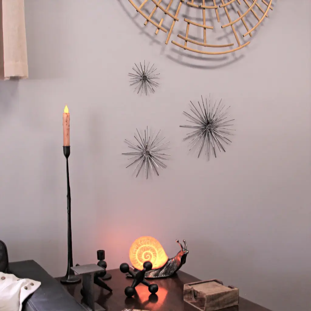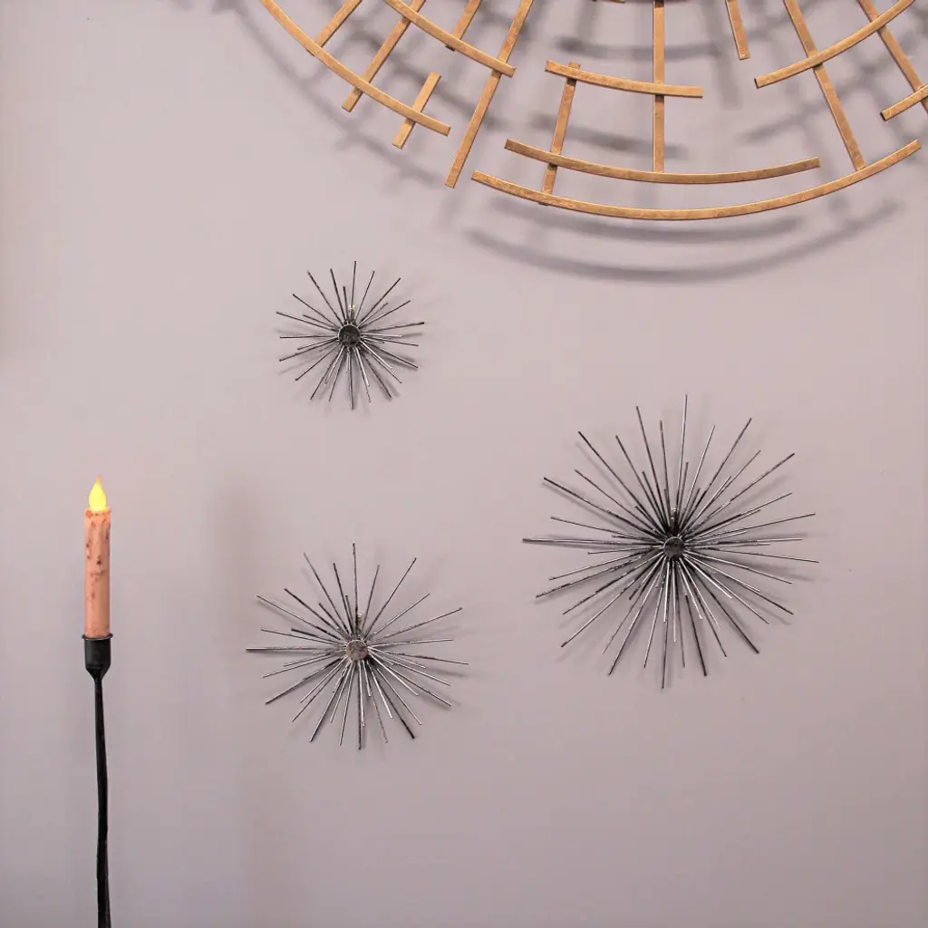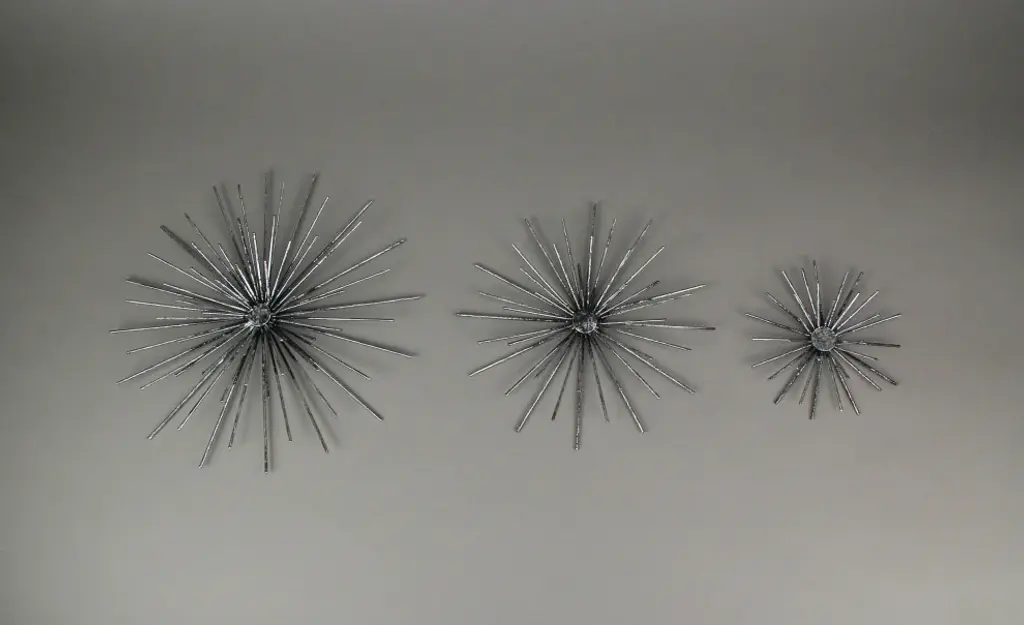 Impressive Dimensions - Revel in the diverse sizes of these wall accents - Large - 12 inches, Medium - 9 inches, and Small - 6 inches in diameter. Each sphere showcases intricate metal craftsmanship, creating a mesmerizing focal point that captivates any observer.Long-Lasting Quality - Crafted from durable metal, these sculptures guarantee years of maintenance-free display. Their sturdy construction ensures they remain a timeless adornment, adding an artistic allure to your space without worrying about wear and tear.Elegant Silver Finish - Embrace the charm of antiqued silver, which gracefully illuminates any room. The warm, dark grey tones add a touch of sophistication, lending a cozy ambiance to your space while effortlessly enhancing your decor''s aesthetic appeal.Effortless Installation - Designed with triangular metal hangers on their backs, these accents are a breeze to hang. Transform your room swiftly, letting the captivating starburst design take center stage, captivating onlookers with its celestial beauty.Chic Room Enhancements - Elevate your decor effortlessly with these stylish accents. Their elegant presence transforms any space, infusing it with a sense of wonder and refinement. Let the interplay of light and metal redefine your room, creating an ambiance of timeless elegance and artistic brilliance.Elevate your space with this exquisite Radiant Starburst Wall Sculptures Set, featuring midcentury modern metal art accents in antique silver finish. Crafted with precision, these sculptures come in large, medium, and small sizes, measuring 12 inches, 9 inches, and 6 inches in diameter, respectively. The intricate design mimics spiny sea urchins and floating dandelions, adding a touch of whimsy to your decor. Made from durable metal, these sculptures promise years of maintenance-free display. The antique silver finish lends a timeless and sophisticated charm, brightening up any room with its elegant appeal. Each piece is equipped with triangular metal hangers on the back, ensuring easy and secure hanging. These starburst sculptures serve as perfect accents, infusing your space with elegance and modern allure. Whether displayed individually or arranged in a series, they create a visually exciting atmosphere, harmonizing with various decor styles. Make a statement in your home with these captivating starburst wall sculptures, transforming your walls into an art gallery of timeless beauty and sophistication.