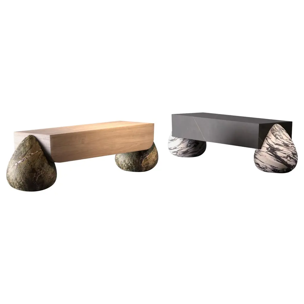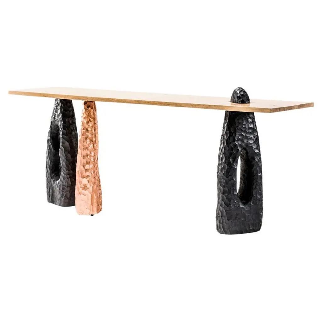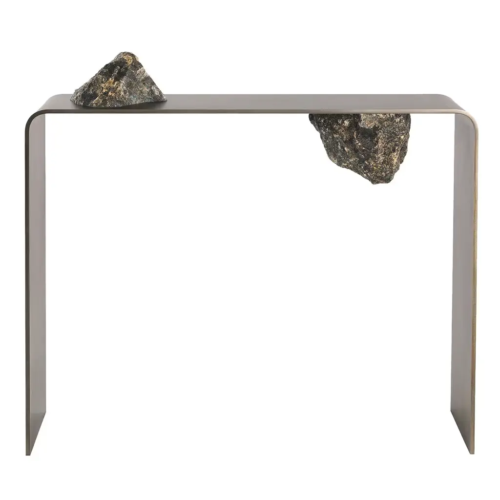 "A fragment from distant planets segmented in two parts intersects an archetypal plane conveying a cosmic sense of transformation. Stone and metal combined create functional sculptures, unique in their essence, simulating otherworldly landscapes." Centerpiece made of calendered metal structure in bronze finishing with manganese salt treatment. Natural Lapis Lazuli elements fixed to the structure. Variation Details: Centerpiece made of calendered metal structure in bronze finishing with manganese salt treatment. Natural stone elements fixed to the structure to choose from Obsidian, raw Labradorite, raw Amethyst, Lapis Lazuli.