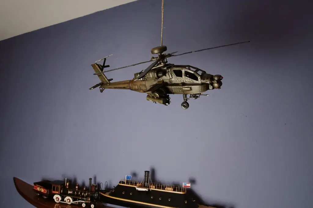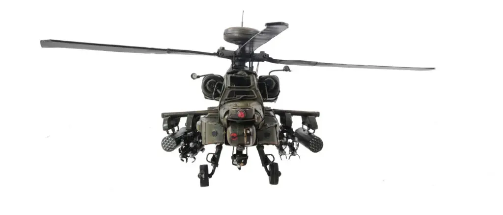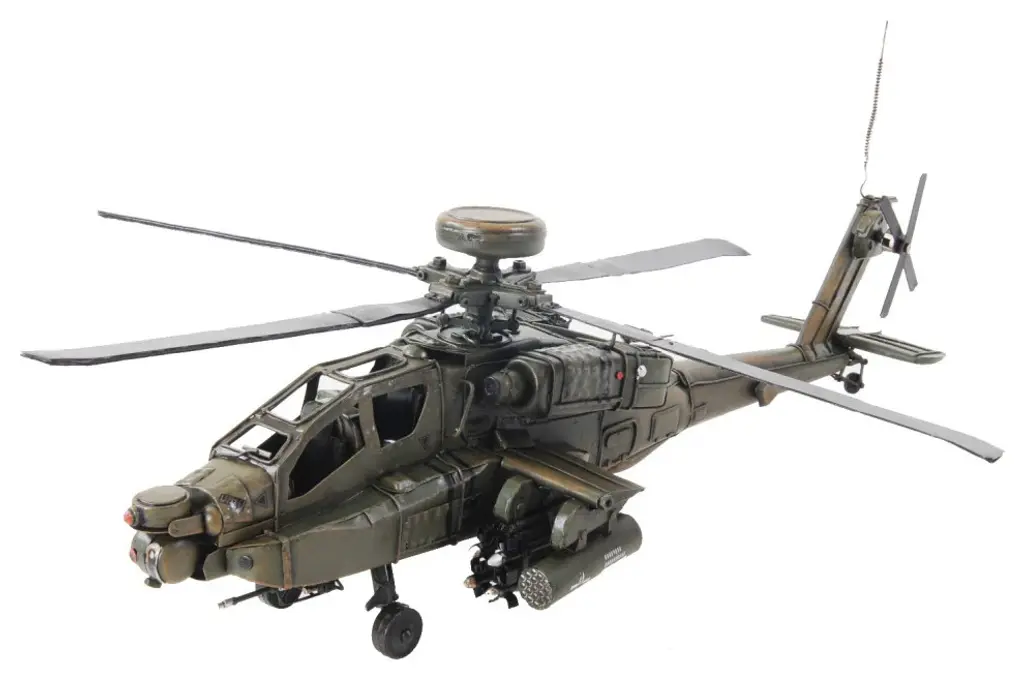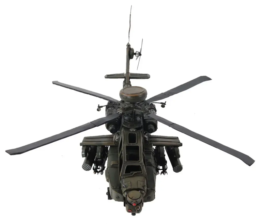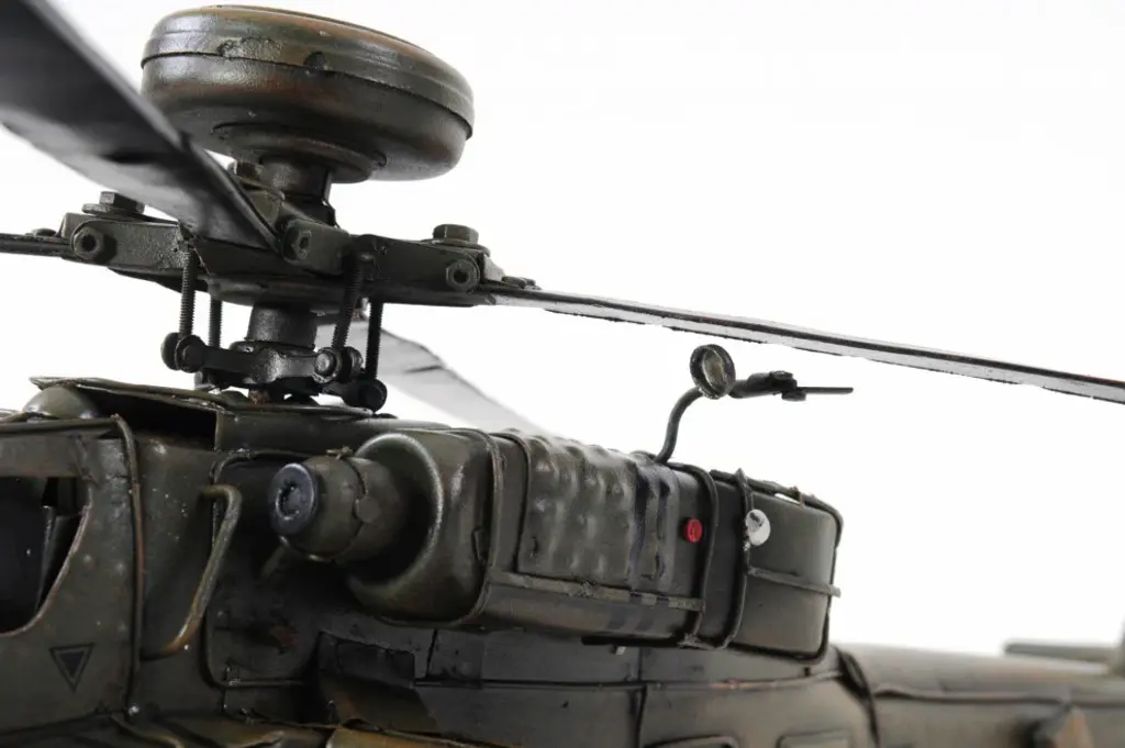 A beautiful replica of the iconic US Army attack helicopter, the Ah-64 Apache Helicopter Sculpture is handmade out of metal and accurately detailed. It comes with remarkable details such as landing skids, a cockpit, tail rotor, spinning propeller, cannons, and missiles. It is a sought-after piece for aviation enthusiasts and collectors. 9" x 18" x 17"