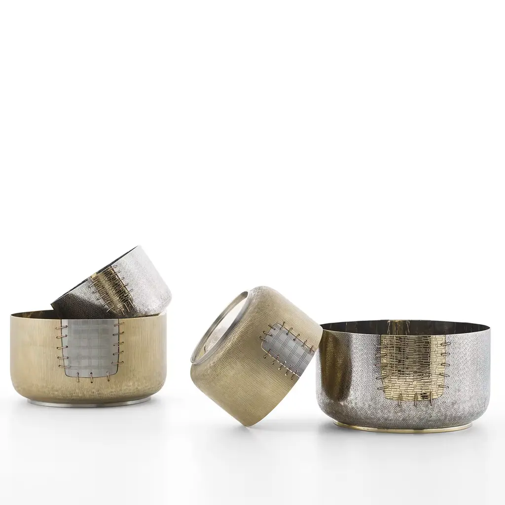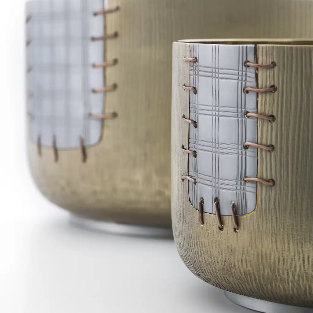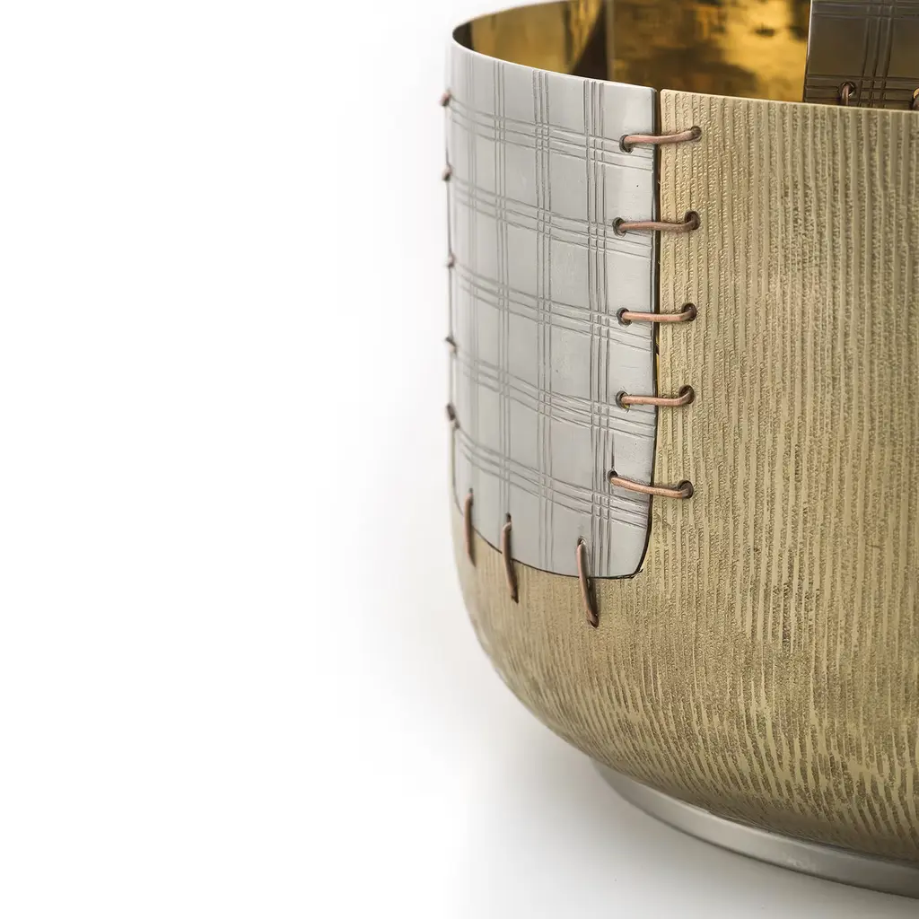 Inspired by Kintsugi - a Japanese philosophy that considers any cut and damage to an objects an enriching element that makes it unique and precious - this large bowl is made of brass, white bronze, and copper and boasts a patch that seems to have been sewn in to repair the piece. Its simple silhouette and generous size give the piece a versatile quality that allows it to be a vase, a centerpiece, or a decorative sculpture to display anywhere at home.