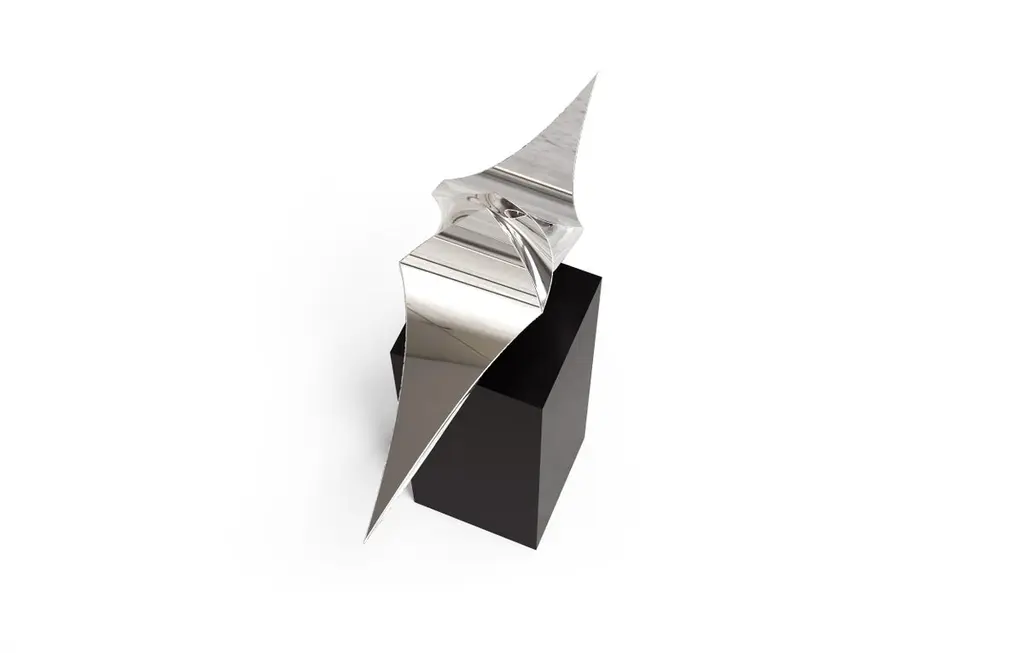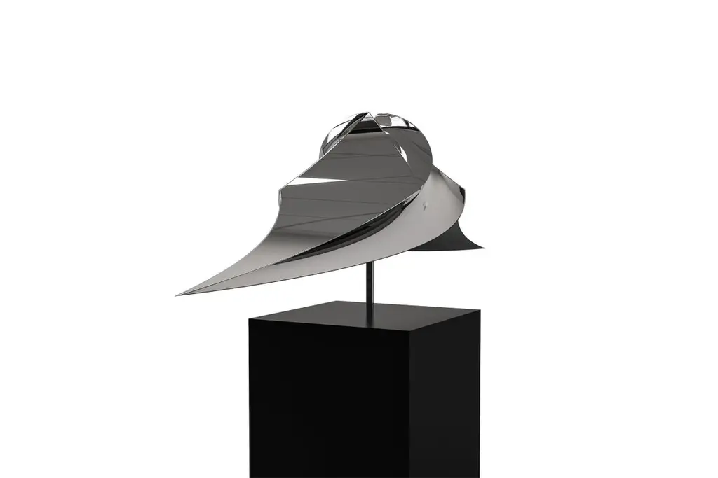 "Alata Cubus" from Katz Studio's Geometra Collection is a striking sculptural work that embodies the intersection of mathematical precision and organic flow. This forged mirror-polished stainless steel piece soars with a sense of aerodynamic grace, its sweeping curves and sharp angles creating a dynamic tension between movement and stability.The sculpture takes the form of an abstracted wing or fin-like shape, with a central spine that rises to a pointed apex before descending in a graceful arc. Multiple planes and facets intersect and merge, their highly polished surfaces reflecting and refracting light to create an ever-changing interplay of highlights and shadows. The precision of the geometric forms is softened by the fluid, almost liquid quality of the polished metal, giving the piece an otherworldly character that seems to hover between the realms of nature and technology.Crafted using Katz Studio's proprietary forging and fabrication techniques, "Alata Cubus" showcases the malleability and strength of stainless steel. The seamless construction and flawless mirror finish speak to the studio's mastery of metalworking, allowing the material to transcend its industrial origins and take on an almost ethereal quality.Conceptually, the piece explores themes of flight, aspiration, and the human desire to harness the forces of nature through technological innovation. Its wing-like form evokes images of aircraft and space exploration, while the organic curves suggest the sleek efficiency of creatures adapted for swift movement through air or water. This duality invites contemplation on the relationship between human invention and the natural world that inspires it.As part of the Geometra Collection, "Alata Cubus" exemplifies Katz Studio's ongoing exploration of form, material, and mathematical principles in sculptural art. The piece's elegant proportions and precise angles reflect an underlying geometric framework, transformed through artistic vision into a work of captivating beauty and symbolic resonance.Presented on a minimalist black pedestal, "Alata Cubus" commands attention as a standalone sculptural statement. Its reflective surfaces engage with the surrounding environment, making it a dynamic presence in any space. Like other works in the Katz Studio oeuvre, this piece offers potential for customization in size and finish, allowing collectors to tailor the work to their specific aesthetic vision or spatial requirements.