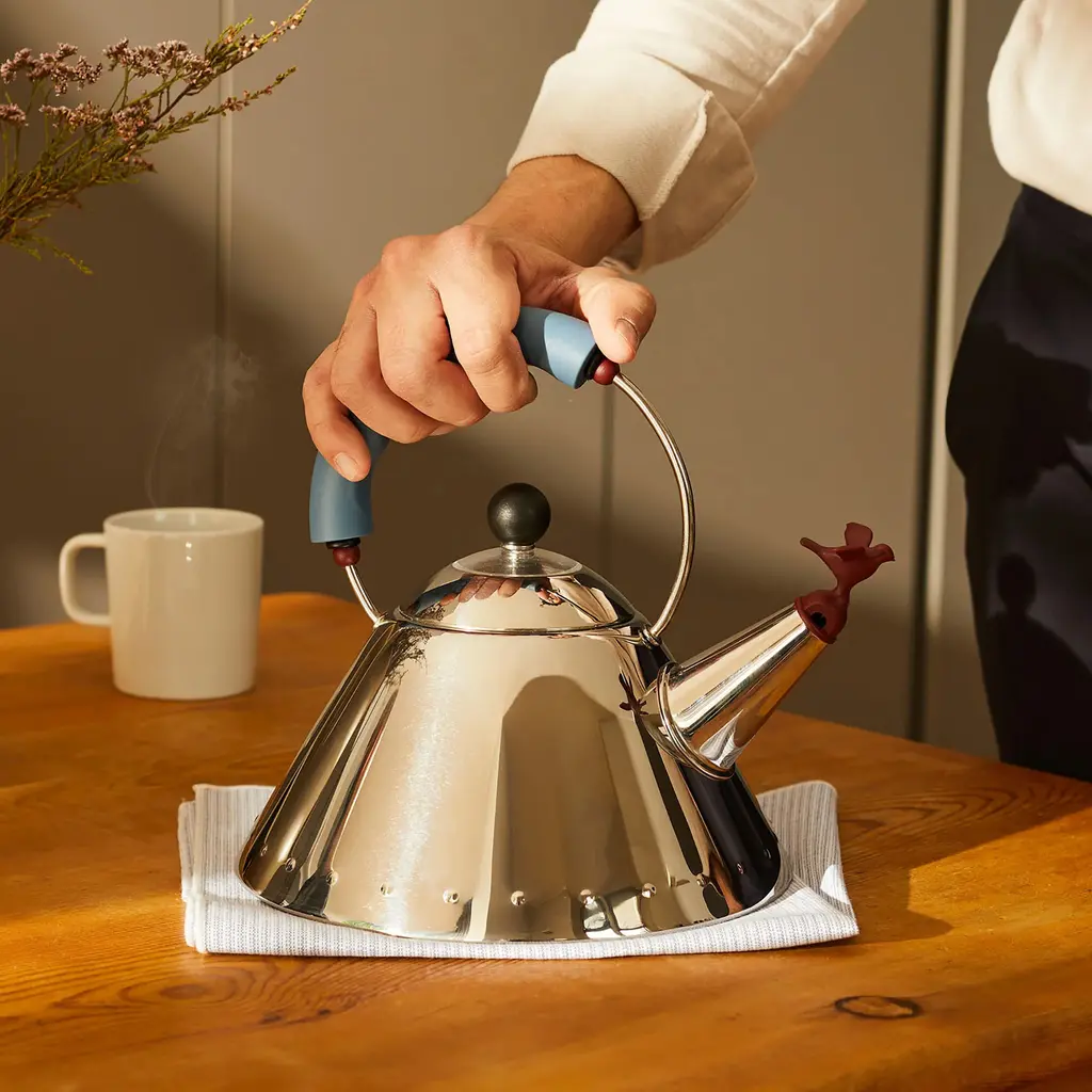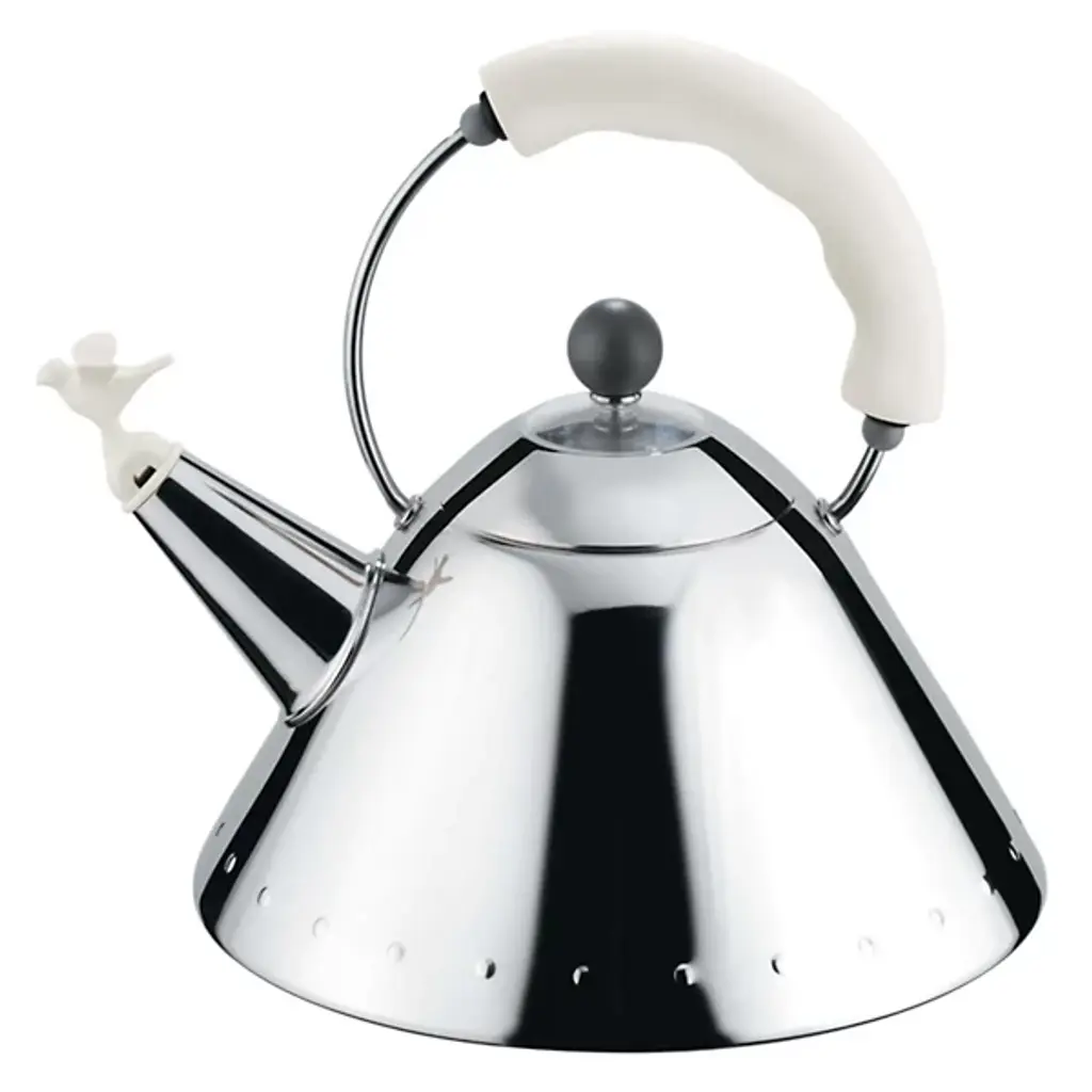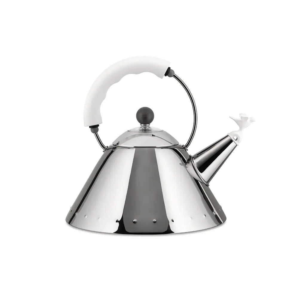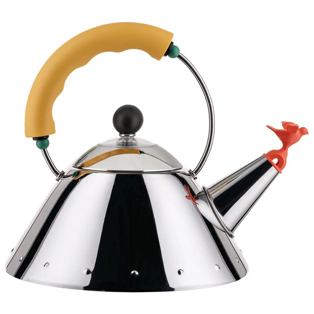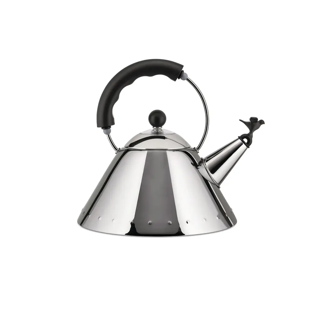 Bring playfulness to your daily tea-making routines with this Michael Graves tea kettle. Created in 1985 by the renowned architect and designer, the Alessi 9093 Kettle has a distinctive design that stimulates the senses of sight, hearing and touch. Referencing European art, American pop art, and pre-Columbian cultures, the elegant kettle looks like a sculpture made of polished stainless steel, adorned with charming details. The bird-shaped whistle “sings” when the water starts boiling, bringing a smile on your face. Additionally, the thermoplastic resin handle has a tactile surface and an ergonomic shape, for a great grip and extra comfort while pouring water. Crafted from high-quality 18/10 stainless steel and thermoplastic resin, this Michael Graves tea kettle also comes with a magnetic steel bottom for induction stoves.