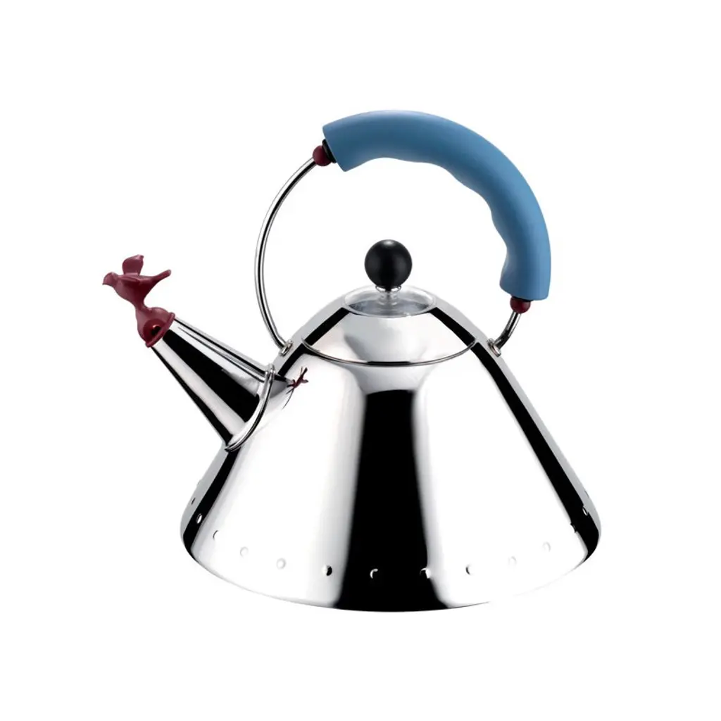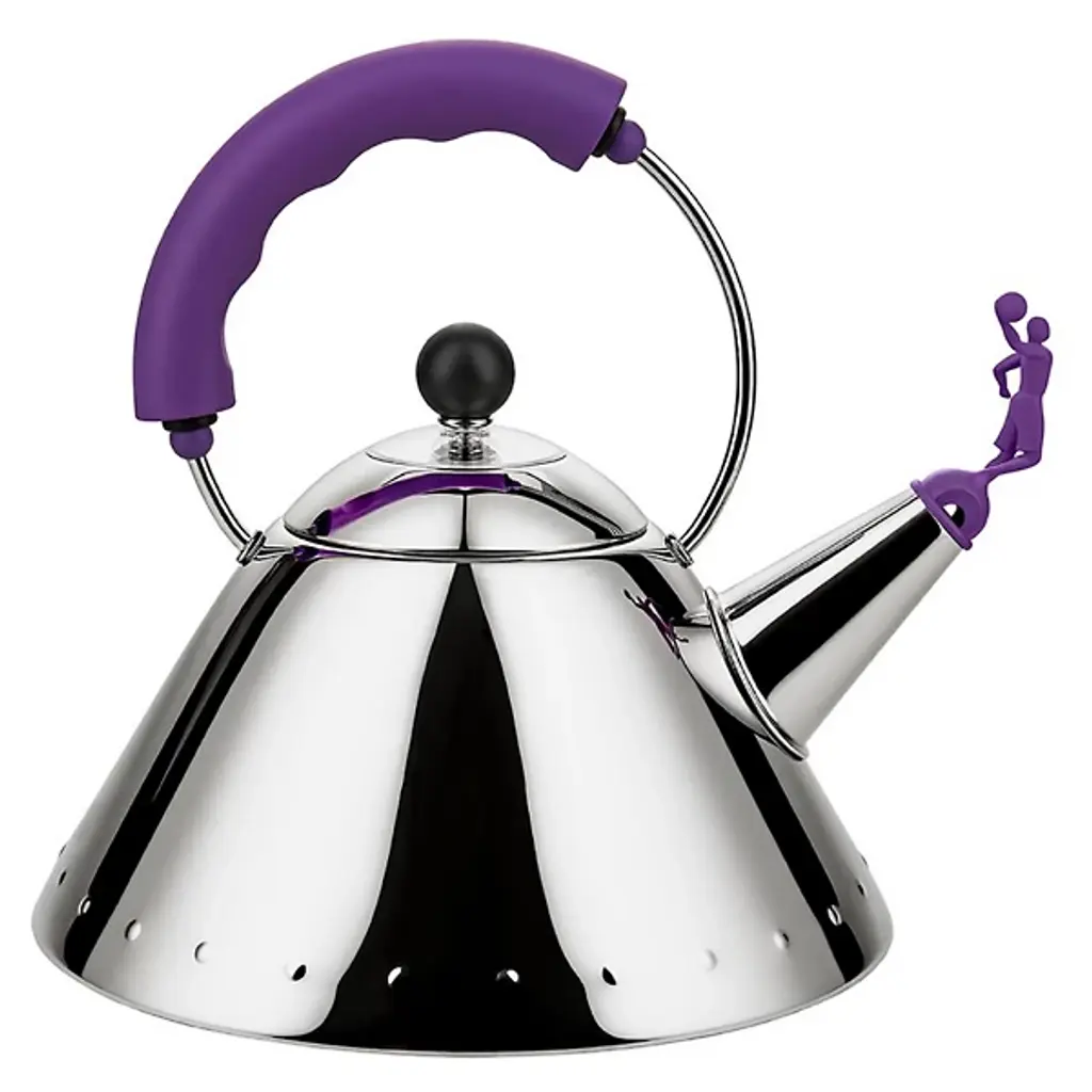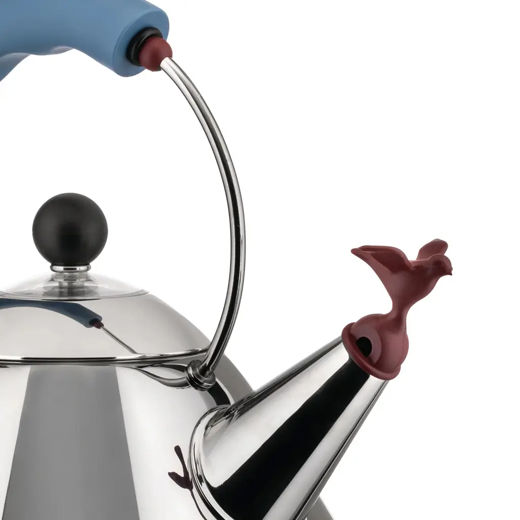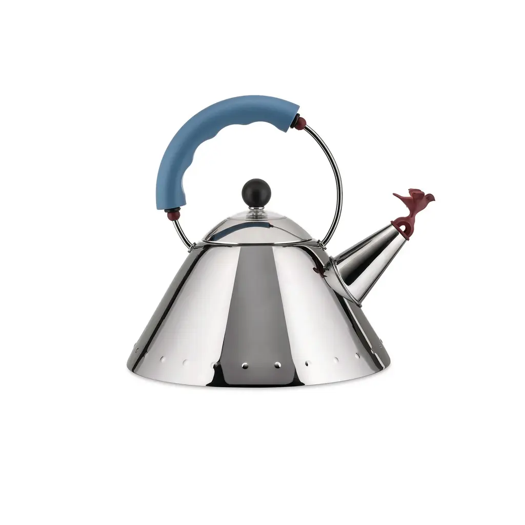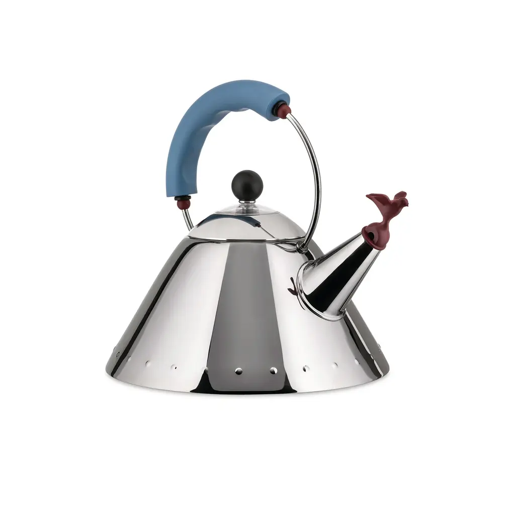 Bring playfulness to your daily tea-making routines with this Michael Graves tea kettle. Created in 1985 by the renowned architect and designer, the Alessi 9093 Kettle has a distinctive design that stimulates the senses of sight, hearing and touch. Referencing European art, American pop art, and pre-Columbian cultures, the elegant kettle looks like a sculpture made of polished stainless steel, adorned with charming details. The bird-shaped whistle “sings” when the water starts boiling, bringing a smile on your face. Additionally, the thermoplastic resin handle has a tactile surface and an ergonomic shape, for a great grip and extra comfort while pouring water. Crafted from high-quality 18/10 stainless steel and thermoplastic resin, this Michael Graves tea kettle also comes with a magnetic steel bottom for induction stoves.