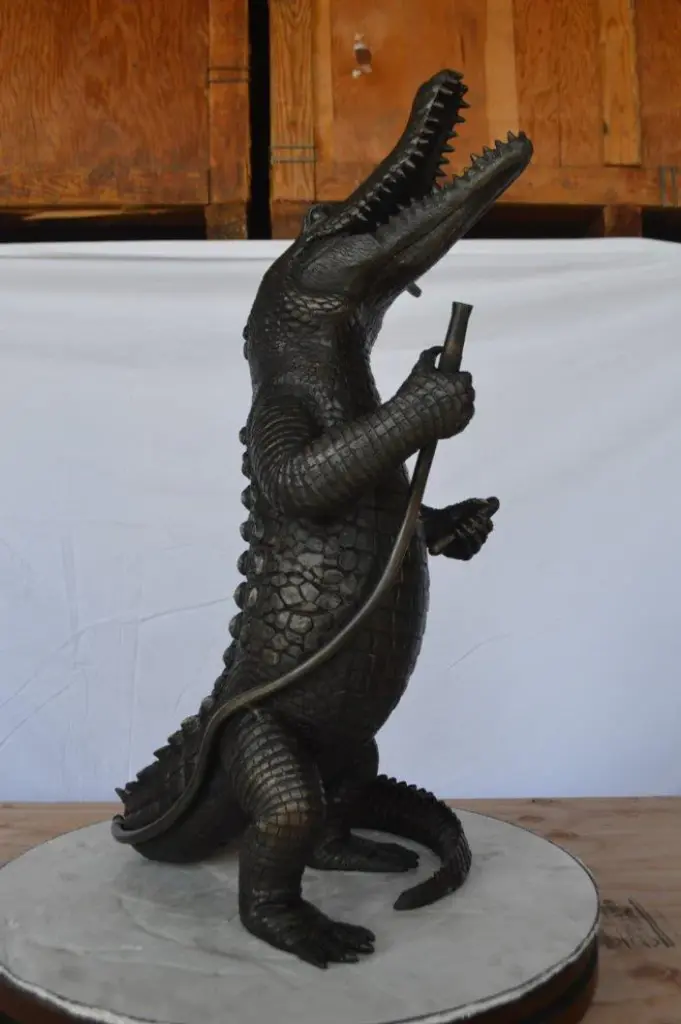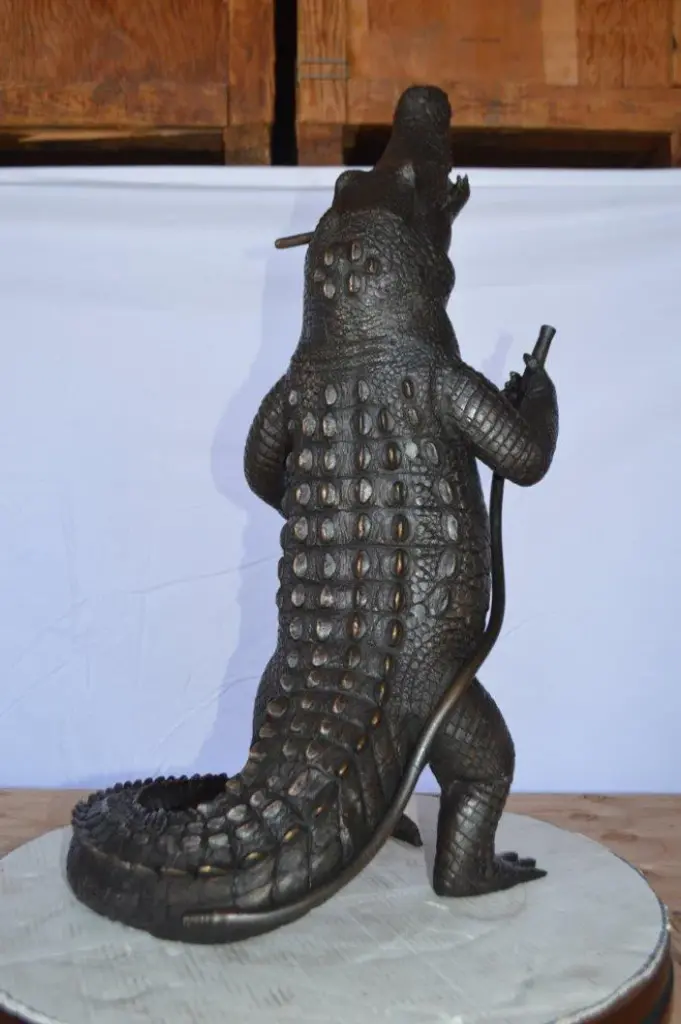 This life-like Large Alligator Bronze sculpture Fountain produced by the Lost Wax casting method would be an eye catching accent for any park or garden. A great alligator gift for Gator fans. Water sprays from the alligator''s mouth with the use of a fountain pump (not included). Size: 15"L x 15"W x 31"H. Weight is: 39Lb