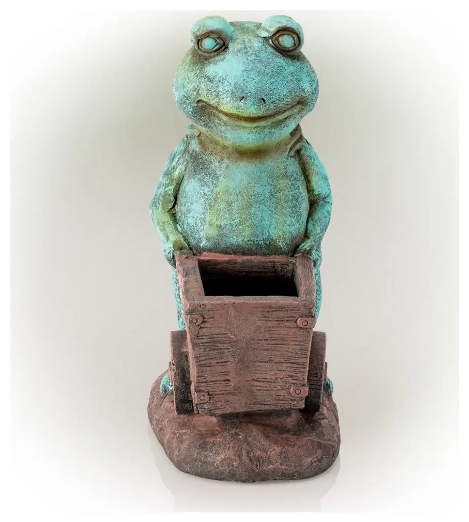Alpine Frog Holding A Wagon Statue, 15"tall