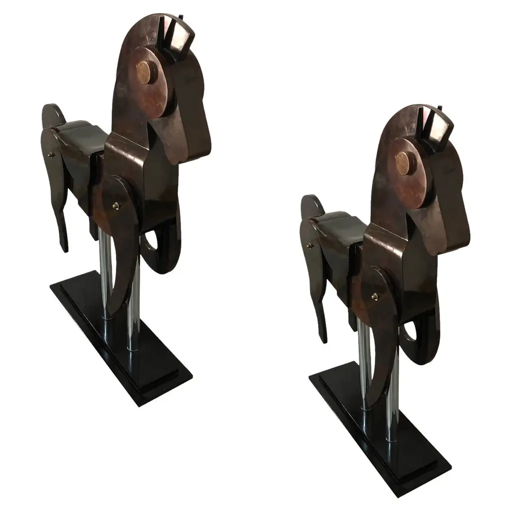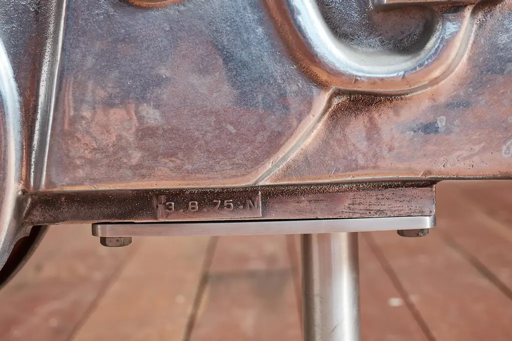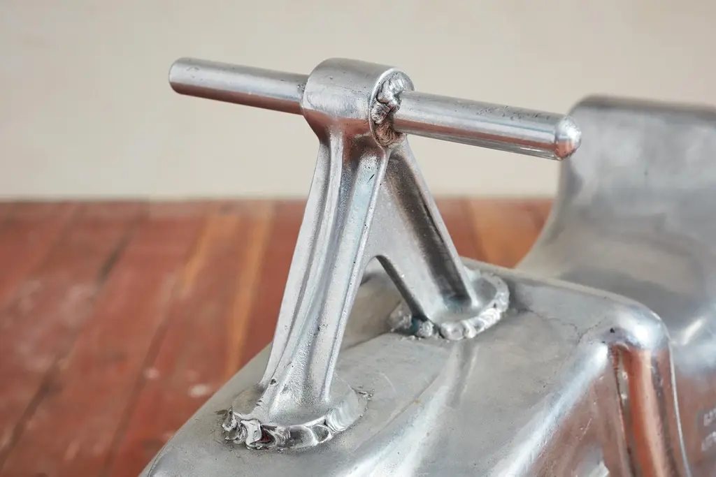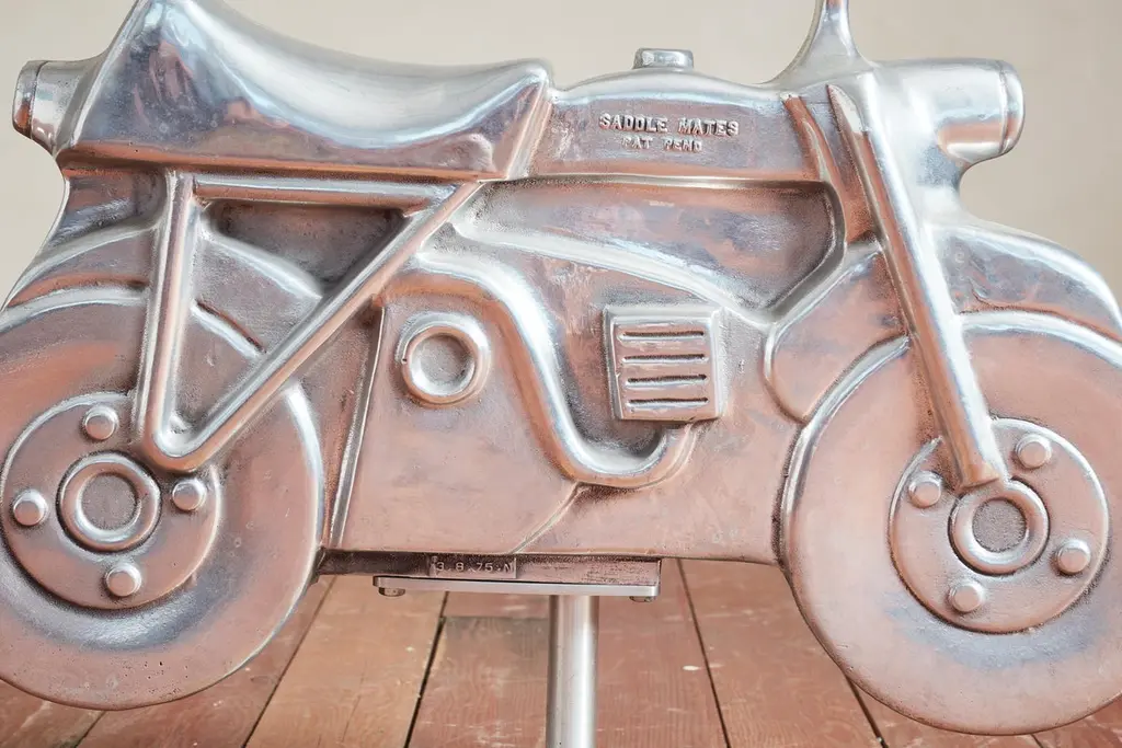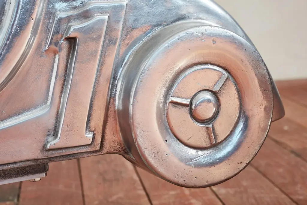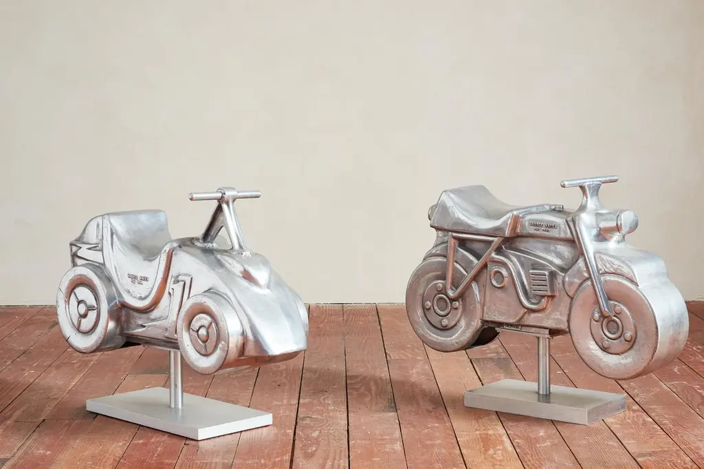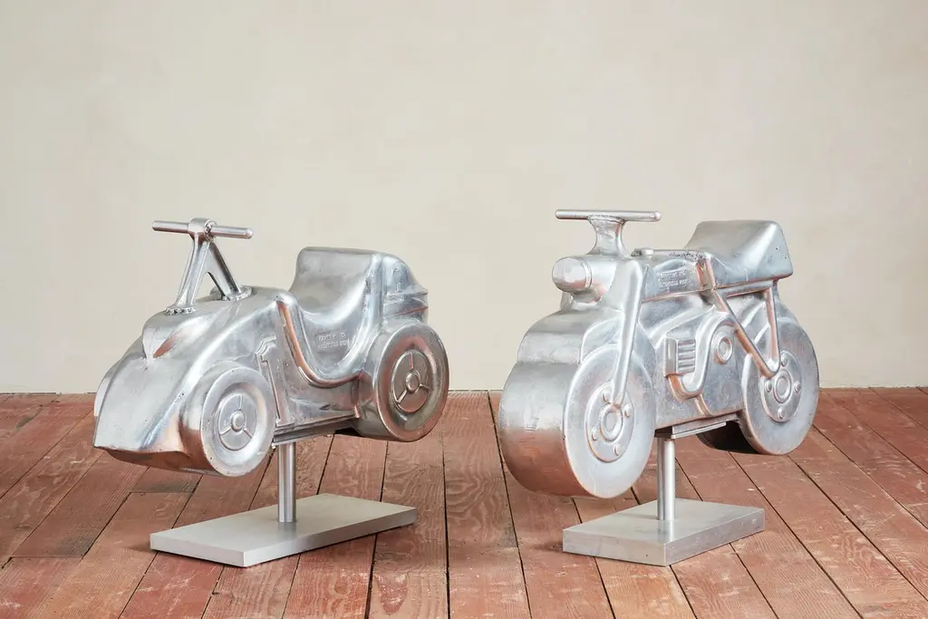 Unique aluminum sculpture originally from a playground - circa 1960sNewly polished aluminum and mounted on a solid steel stand Would be great for a nurseryPriced individually - Motorcycle and car Motorcycle: 30"W x 6.5"D x 23.5"H Car: 30"W x 10"D x 22.75"H