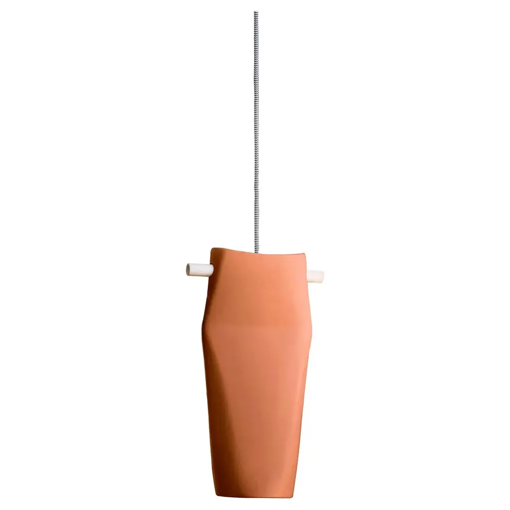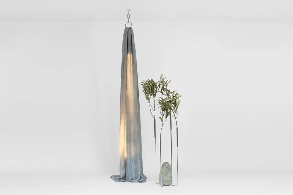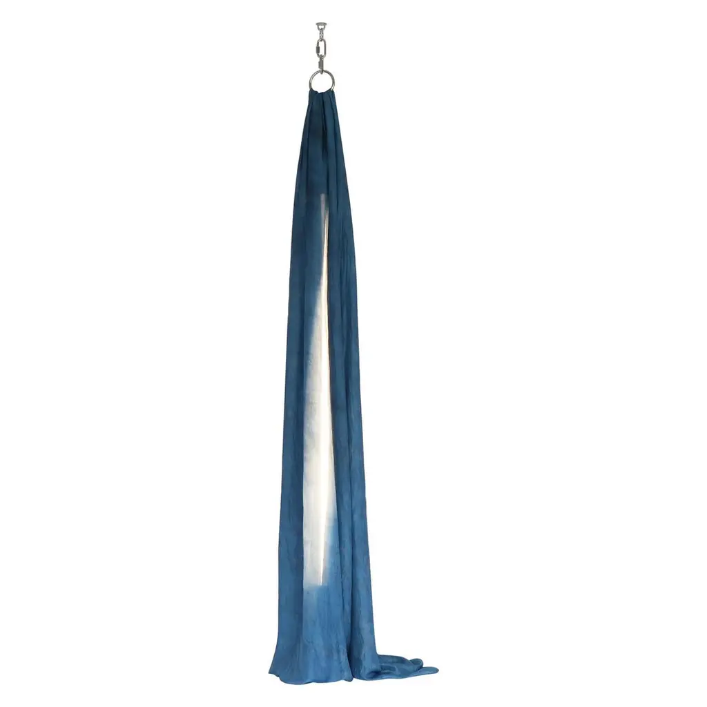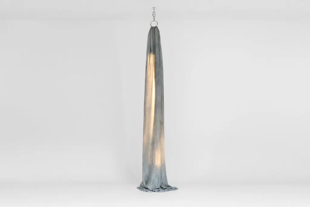 Amber rain sky light by Batten and KampSky Lights Collection2020Dimensions: Approximate W 40 x D 40 x H 260 cmMaterials: Silk, natural pigments, stainless steel hardware, Hay LED tubeEach silk is dyed by hand using natural pigment so there is variation between each piece. Sky Lights' are an attempt to capture the ethereal beauty of our ever changing skies in object form. They are an ode to sweltering amber rain, to the clear blues of June, to vibrant dawns, and the mystery of midnight. The design responds to the natural elegance of silk and the gentle luminous glow it casts when draped over a light source. Each piece of silk is hand dyed in the designers’ studio using pigments made of plants and insects. The dying process is slow, manual and unpredictable, making each Sky Light different from the last.Batten and Kamp is a creative partnership between interior architect Alexandra Batten and designer or artist Daniel Kamp. The duo creates one of a kind furniture, objects, installations, and interiors with clients and collaborators in Hong Kong, New Zealand and the wider Asia Pacific. Their projects have received accolades around the world, most recently their ‘Shelter to Ground’ collection was published in esteemed cultural publications such as Design Boom and Design Anthology.“Our work is a pursuit of raw beauty, of poetry in three dimensions. Art and design, creation and curation, product, sculpture, interiors, architecture - all of it - or none of it. Just beauty.”
