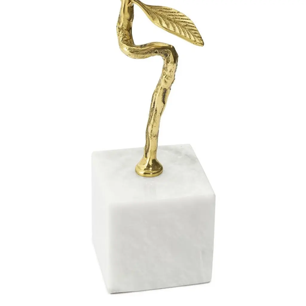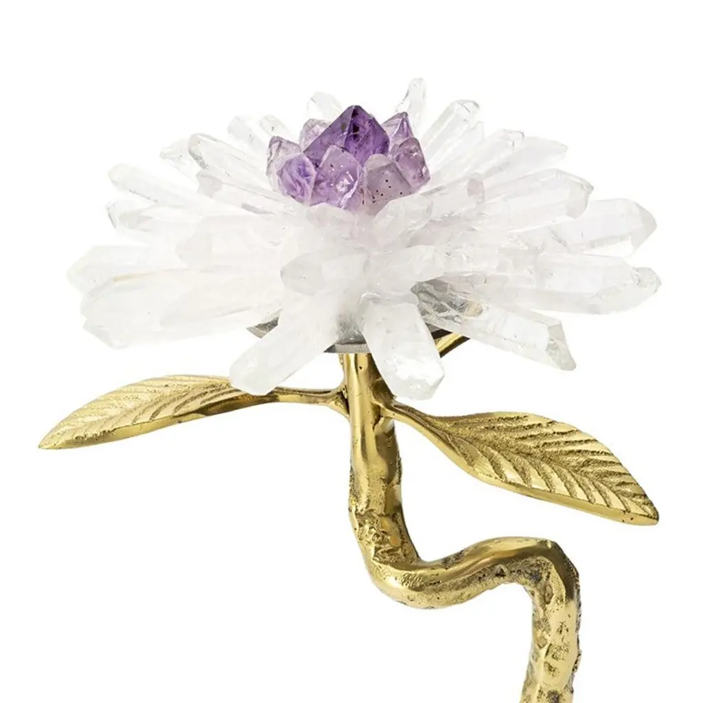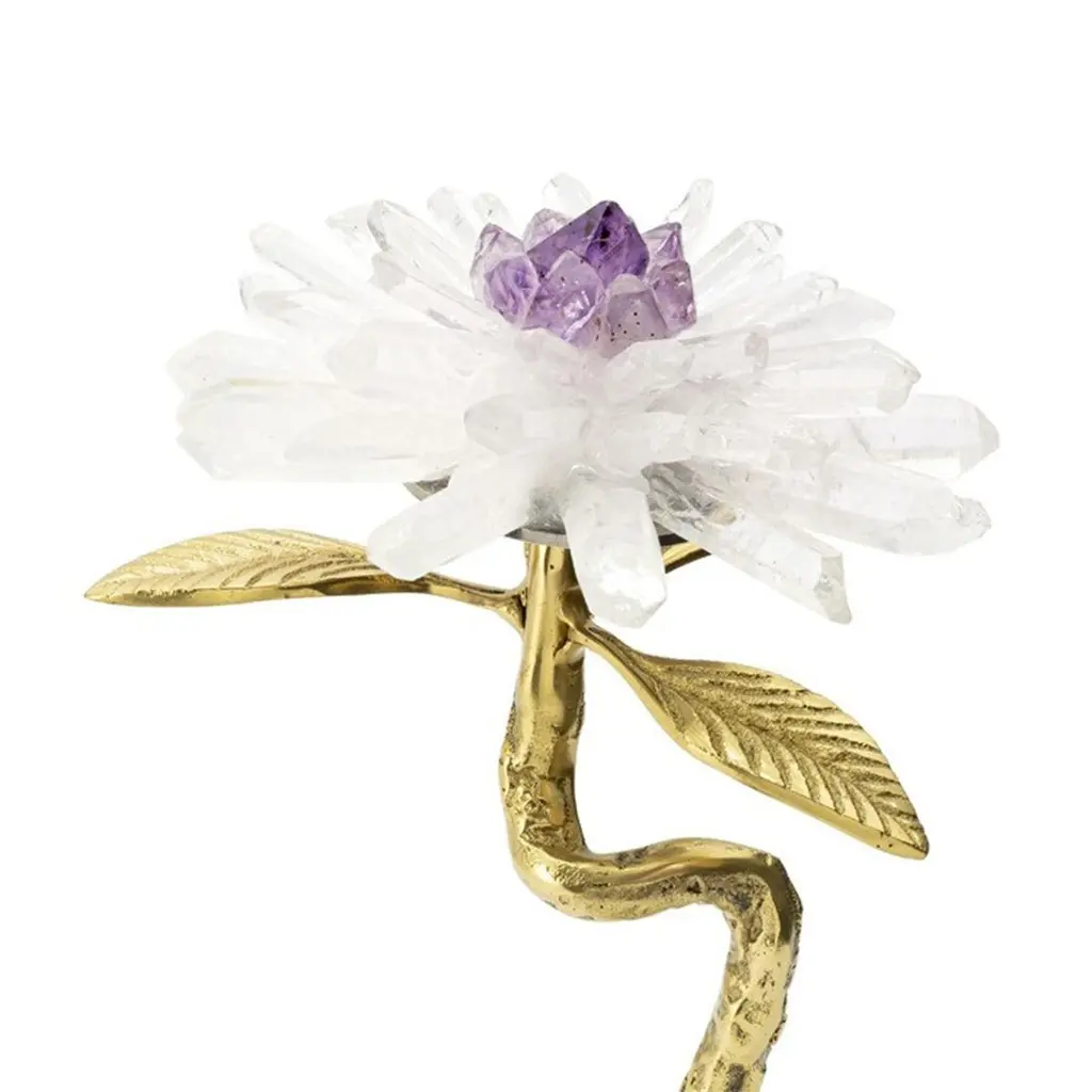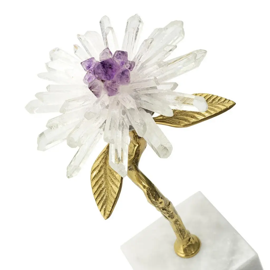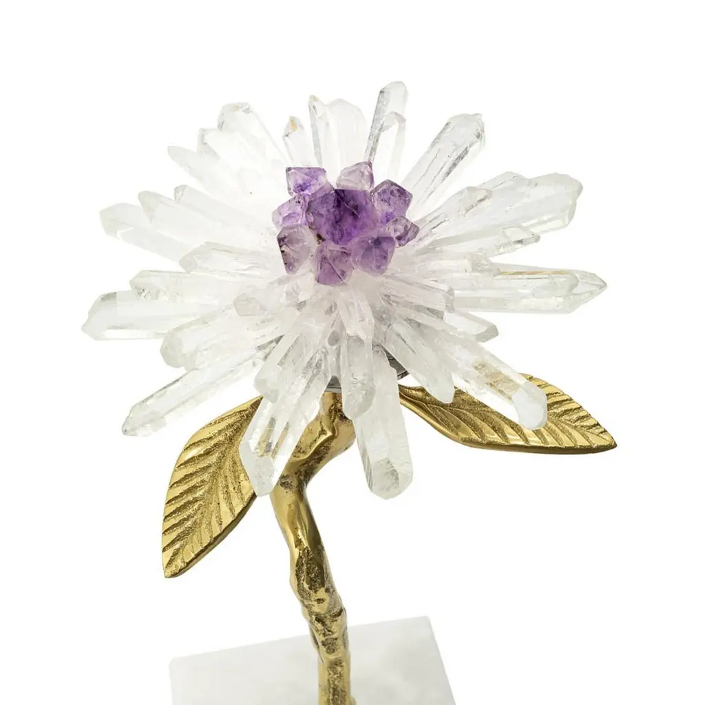 Sculpture amethyst flower I on marble basewith metal gold finish leaves, with minerals stones sticks and with amethyst stone in the heart of the flower.