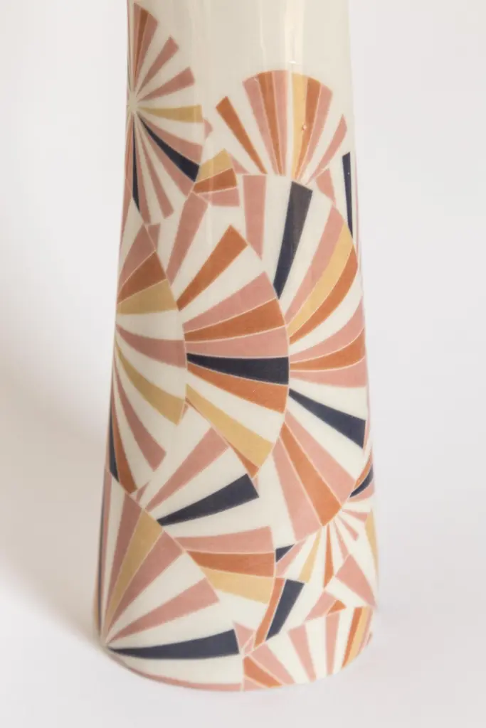 This striking sculpture is part of the Anatomica series by Vito Nesta, featuring decorative objects with simple and essential anatomical shapes characterized by bold, contrasting colors and modern flair. Made of Capodimonte porcelain with a glossy, white finish, this sculpture is shaped like a hand and features a lower section decorated with an abstract design of geometric fanned-out bands in cobalt, ocher, and pink.