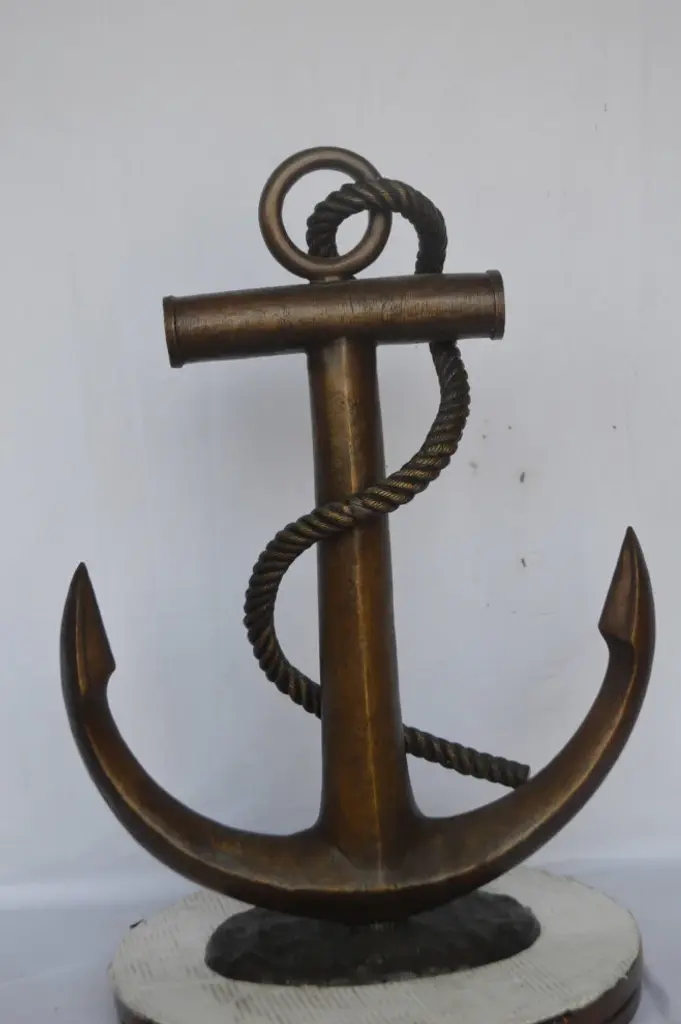 Bring your room to sea with this bronze statue of an anchor. The artist uses symmetry to create a clean and even look of the anchor, while adding volume to the work of art with the rope intertwined on the anchor, This piece would look wonderful in any room with a nautical theme. Size: 28"L x 11"W x 36"H. Weight is: 41Lb
