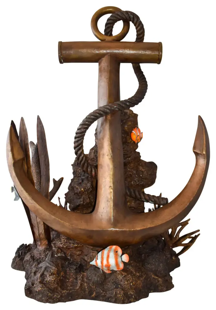 This bronze statue of an anchor on ocean floor among some little fish, striking colors and careful attention to detail. Handcrafted and casted using traditional lost wax method, the little fish stained with colors using polychrome technique referred to enameling over bronze. This expression of the world beneath the waves would look great in the home of any ocean life lover. Size: 32"L x 27"W x 41"H. Weight is: 102Lb