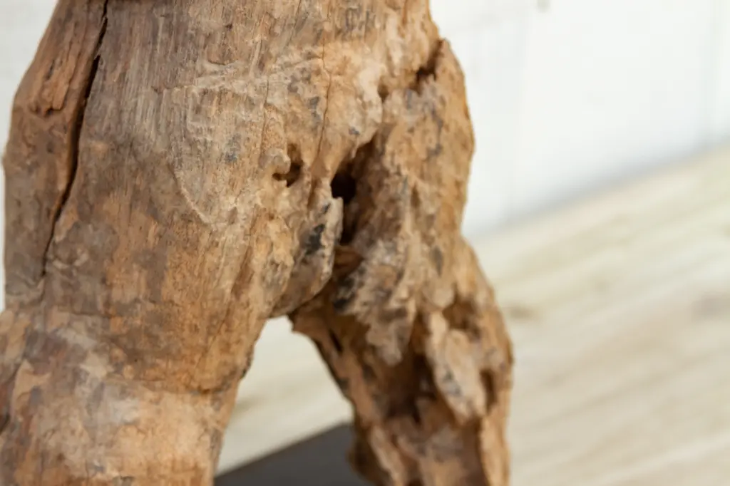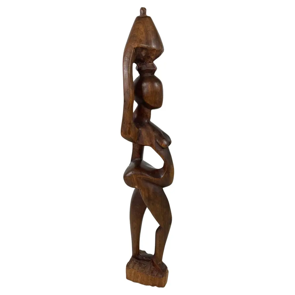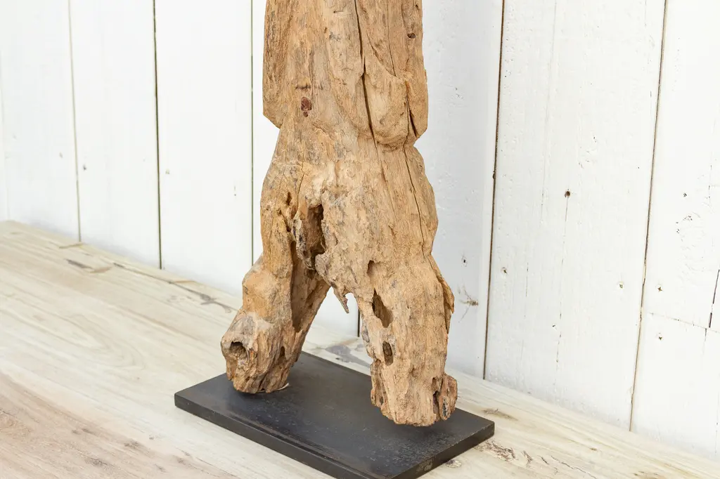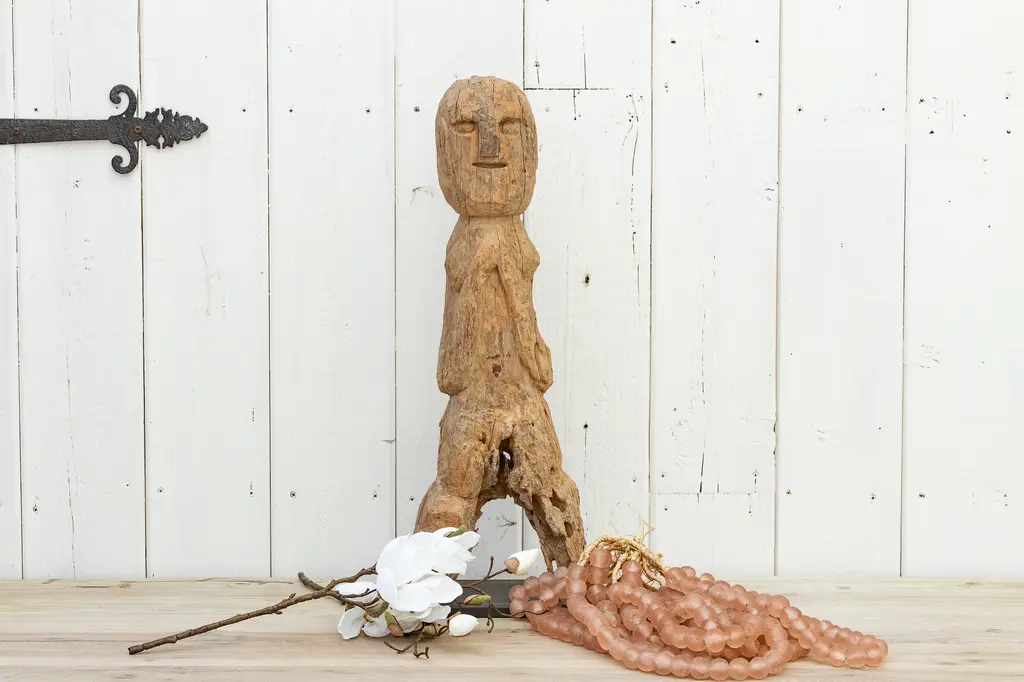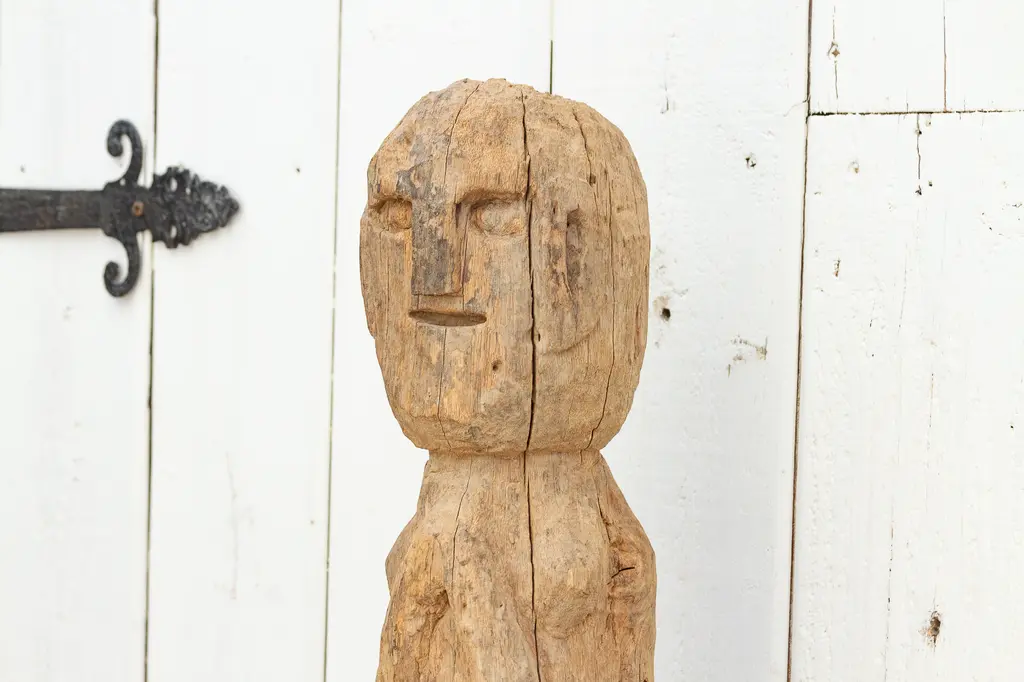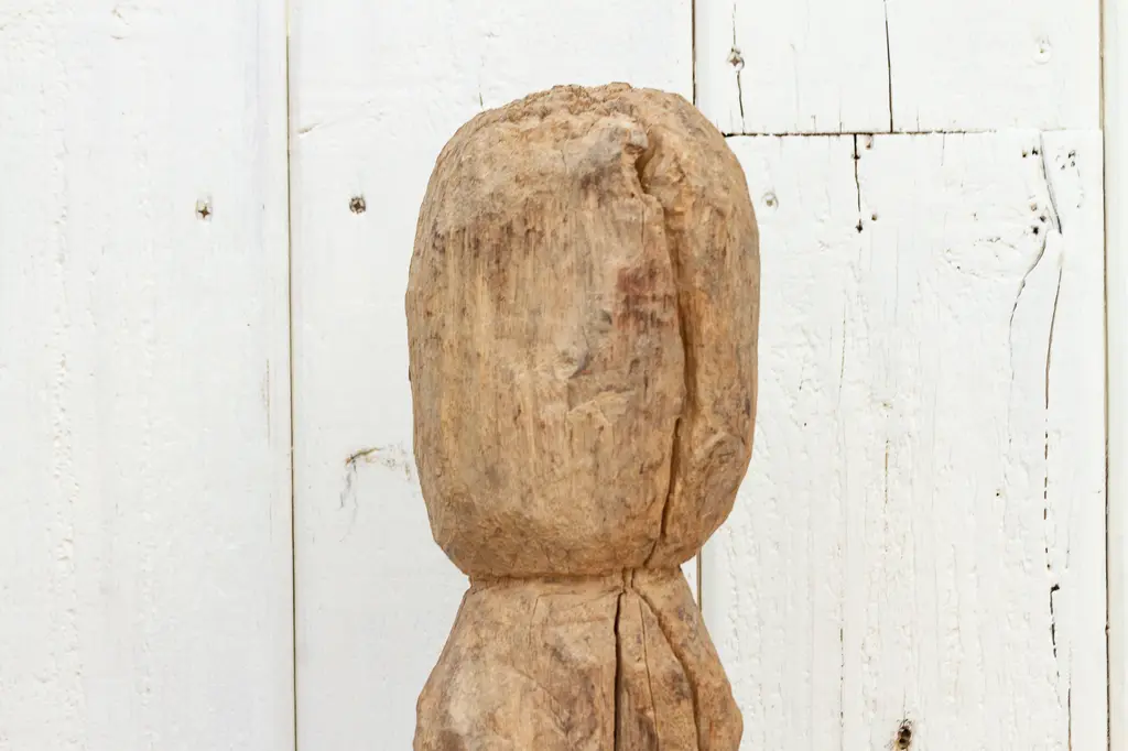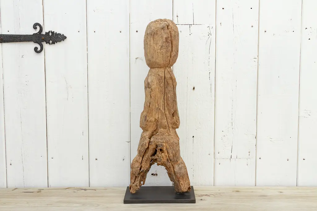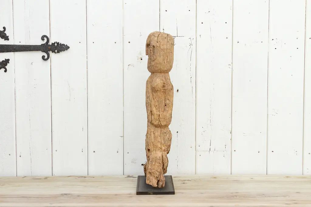 An antique Nepalese wooden statue from the Tharu people. This standing female figure from Nepal is hand-carved from wood and features a rounded head with primitive facial features. This antique tribal piece of art has been mounted on an iron stand so it can be properly displayed. The wood shows cracks, discoloration and erosion.