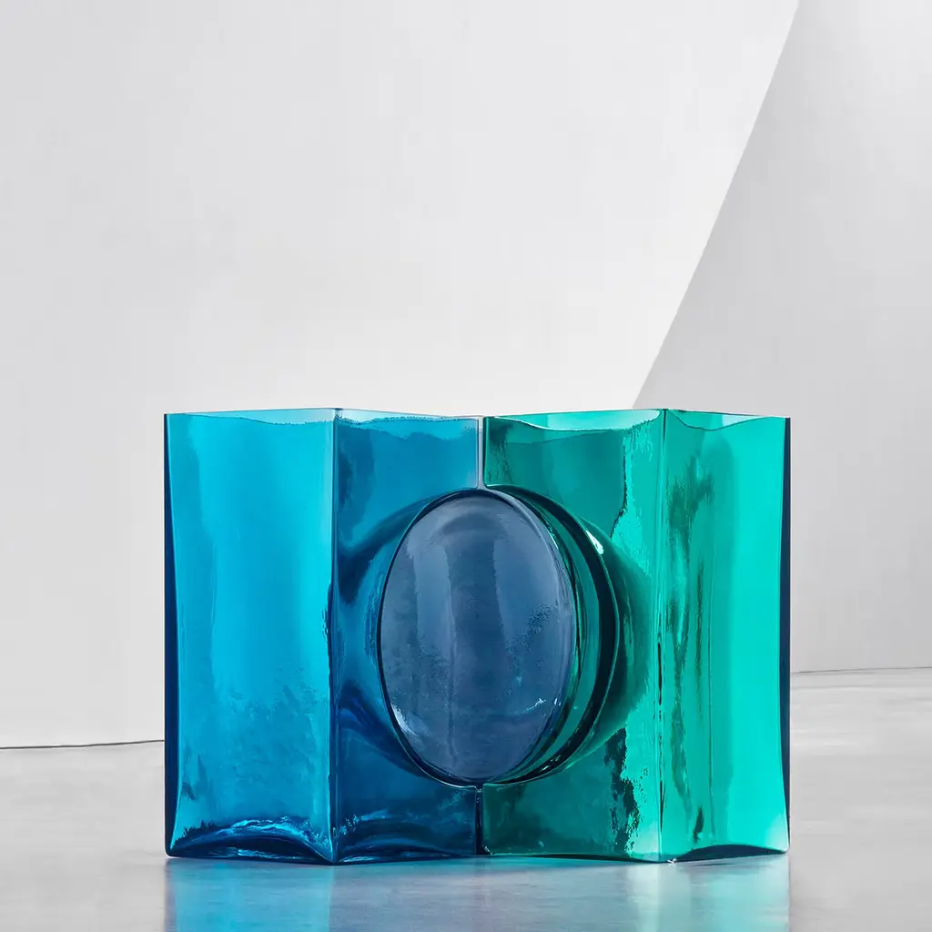This dynamic sculpture by artist Tadao Ando is a superb testament to the timelessness and versatility of blown glass. Two square planes in blue and mint-green meet at a right angle to reveal a sphere seemingly emerging from the intersection. This sculpture is part of a limited edition series of 30 pieces made by the artist.