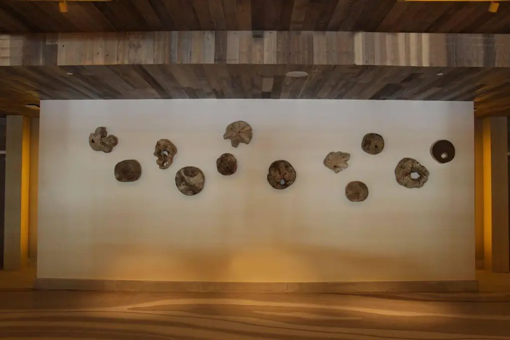 Erosion organic teak sculptures burnt black. Great as art installations in sets of three or more. Please view the final image of a collection in 1 Hotel South Beach, Miami, which we installed.The Triple Burnt Collection represents a unique line of modern furniture made from solid organic wood. Burnt three times to produce a rich, charcoal finish with impressive depth-a result unachievable using standard stains and finishes. A perfect combination of modern and organic. Own an Andrianna Shamaris original.Andrianna Shamaris. The Leader In Modern Organic Design