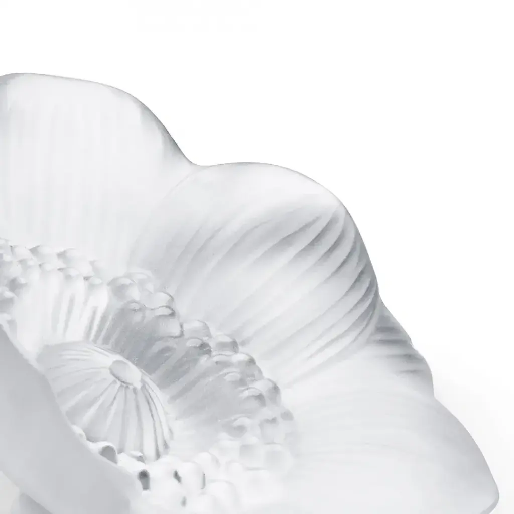 A delicate flower and the symbol of purity and innocence, the anemone inspired René Lalique for this design in 1931, originally created in glass. A vision of crystal, both romantic and contemporary, that shows that nature and modernity in harmony when fashioned by the hands of artists. Trained as a jeweler at the Ecole des Arts Decoratifs in Paris in the late 1880's, Rene Lalique gained recognition as an independent designer for some of the era's great jewelry houses including Cartier and Boucheron. Eventually, he turned to glassmaking, and his techniques were a triumph for the Art Deco movement. Every piece of Lalique is finely detailed and produced by hand in Alsace, France.