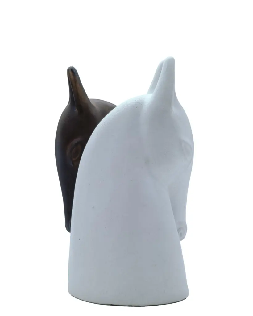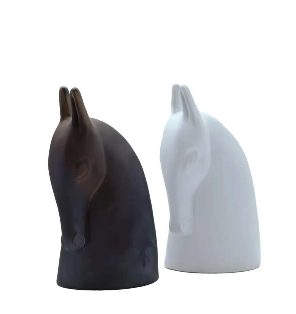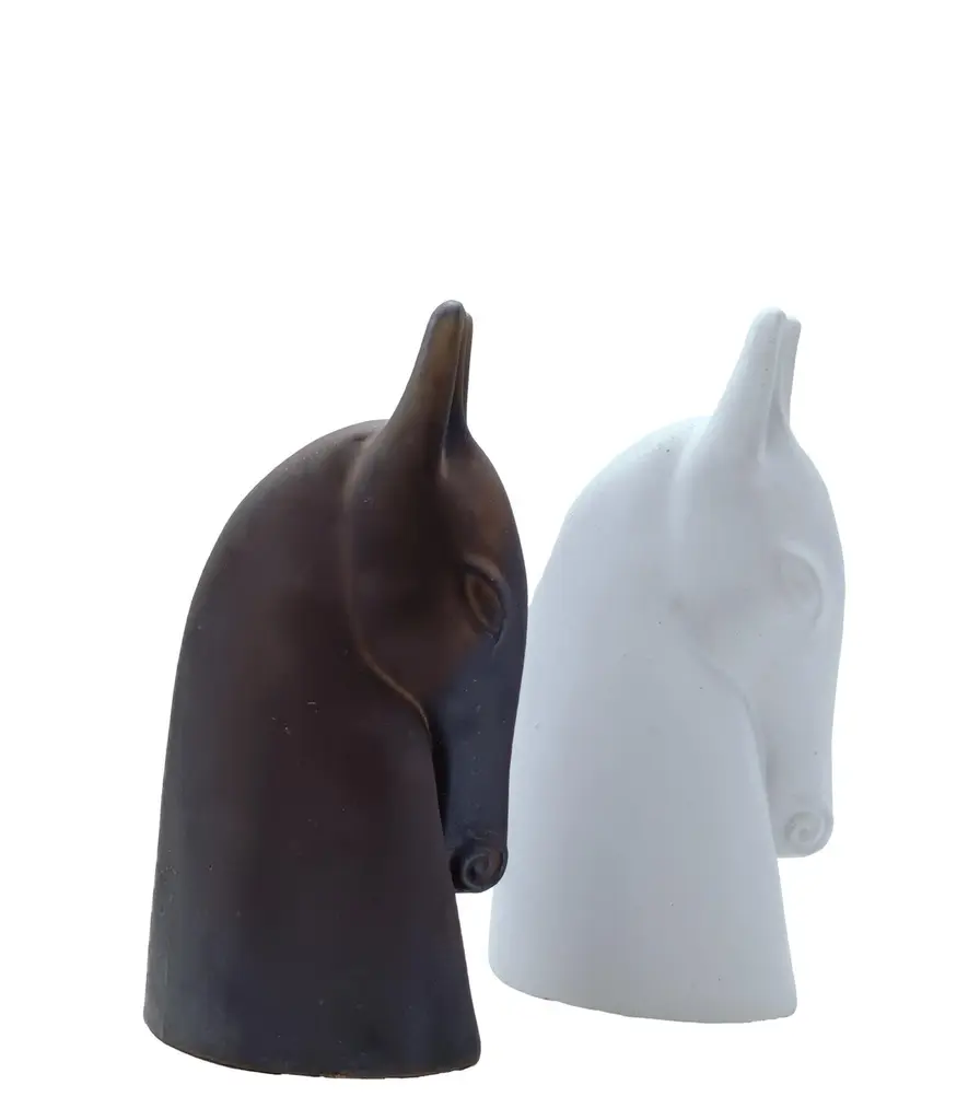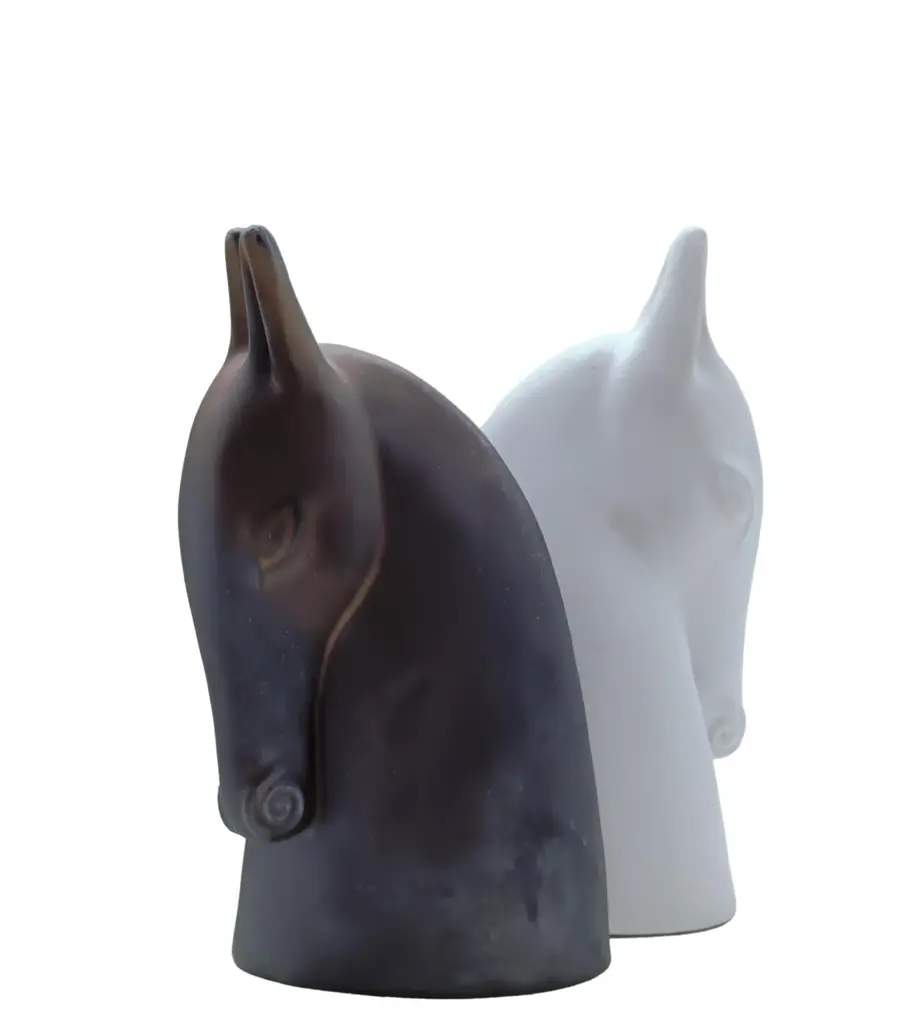 Pair of ceramic/earthenware sculptures created by Danish artist Anette Edmark, the sculptures have a horse head shape, one with dark glaze and the other with light almost white glaze