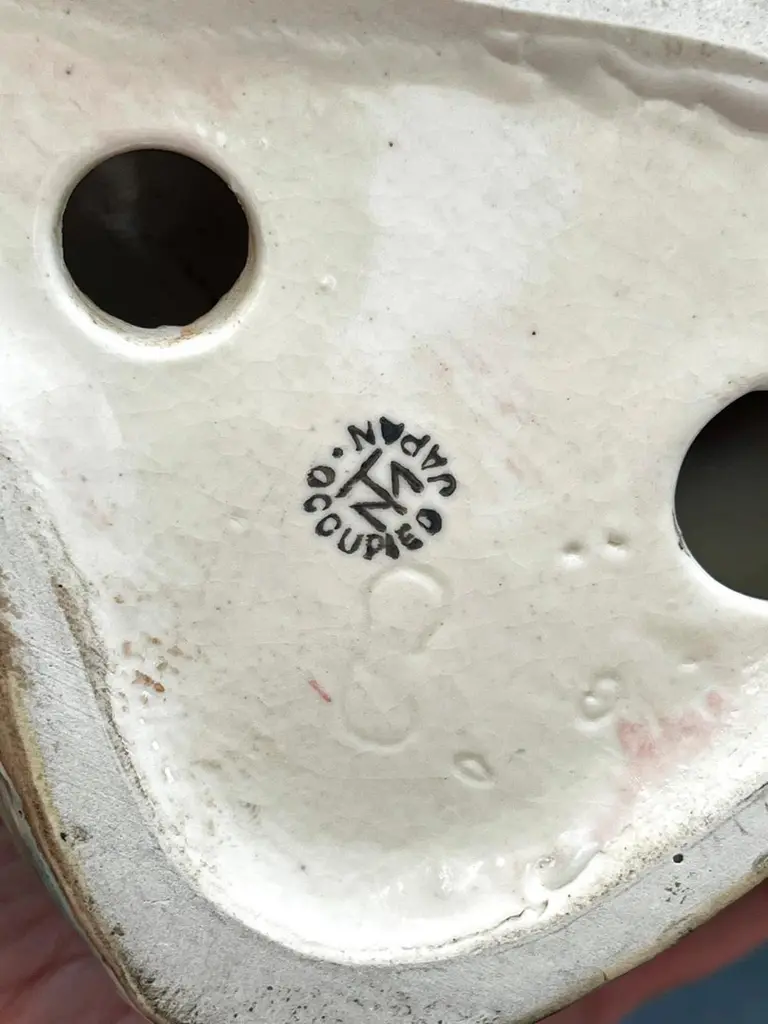 This pair of technicolor-hued Art Deco angel fish sculptures -- glazed in hues of gold, dark pink, cobalt, sea green and canary -- was made in Japan between 1945 and 1951, when American forces occupied the nation after World War II and required that goods made there be marked "Occupied Japan." The "TM" mark indicates the maker, which clearly made a series of ambitious, boldly-decorated items for the home in the late 1940s. We have never seen anything like these before.