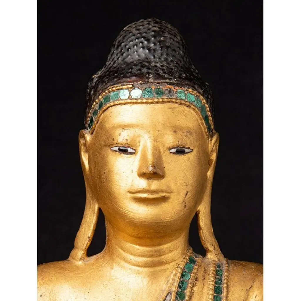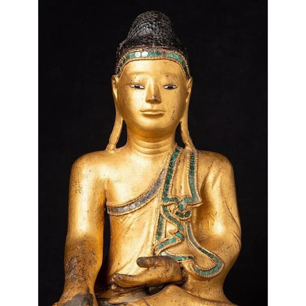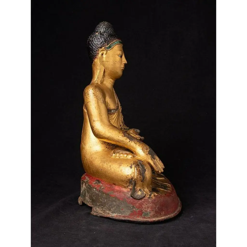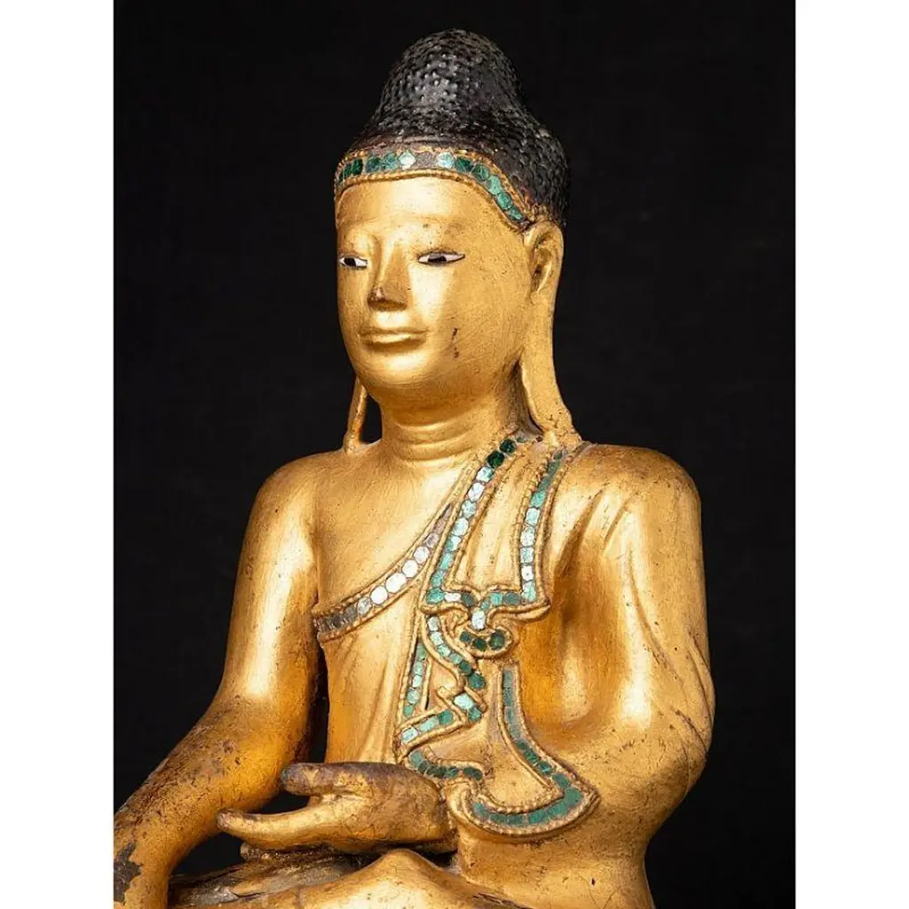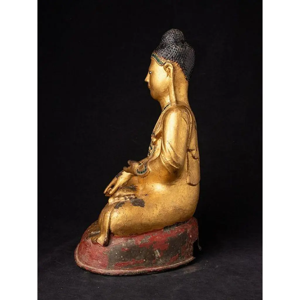 Material: bronze35,7 cm high 24 cm wide and 20,5 cm deepWeight: 5.35 kgsGilded with 24 krt. goldMandalay styleBhumisparsha mudraOriginating from BurmaEarly 19th centuryWith inlayed eyes