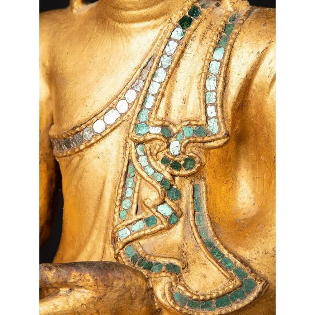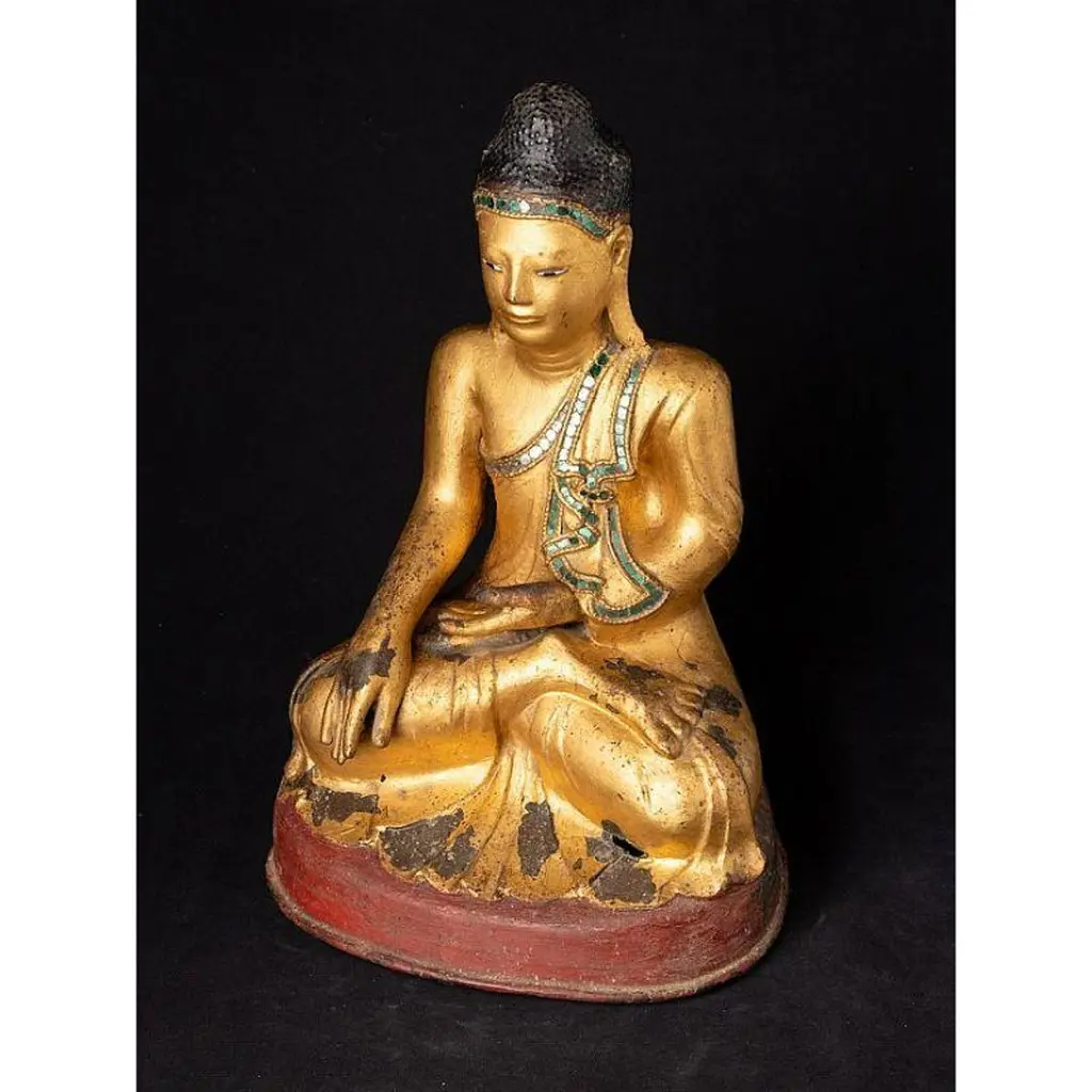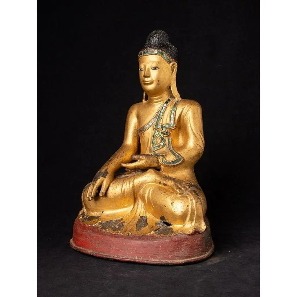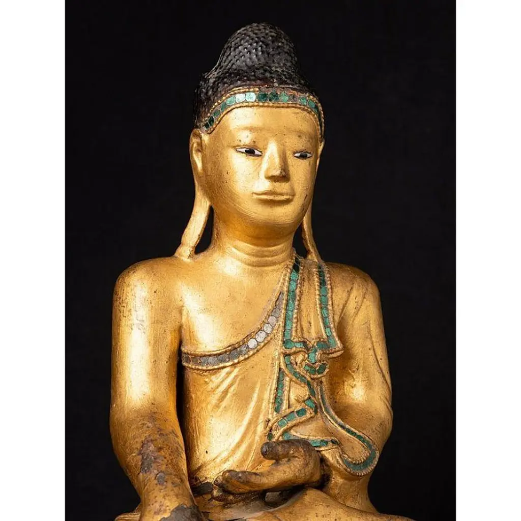 Material: bronze35,7 cm high 24 cm wide and 20,5 cm deepWeight: 5.35 kgsGilded with 24 krt. goldMandalay styleBhumisparsha mudraOriginating from BurmaEarly 19th centuryWith inlayed eyes