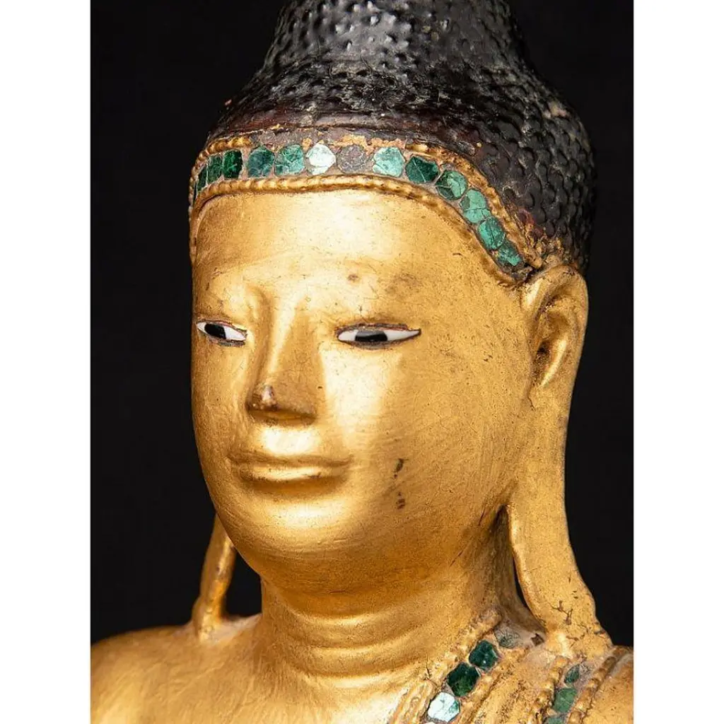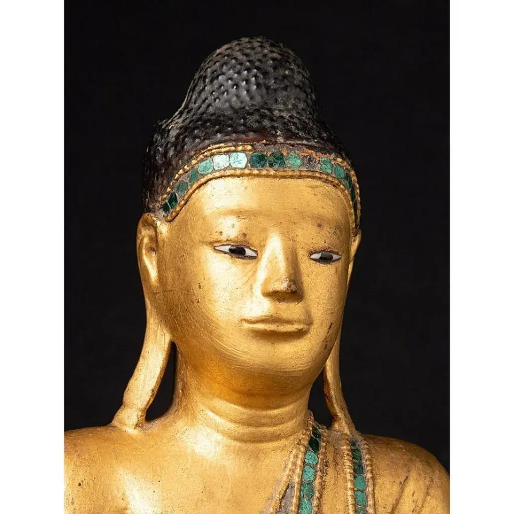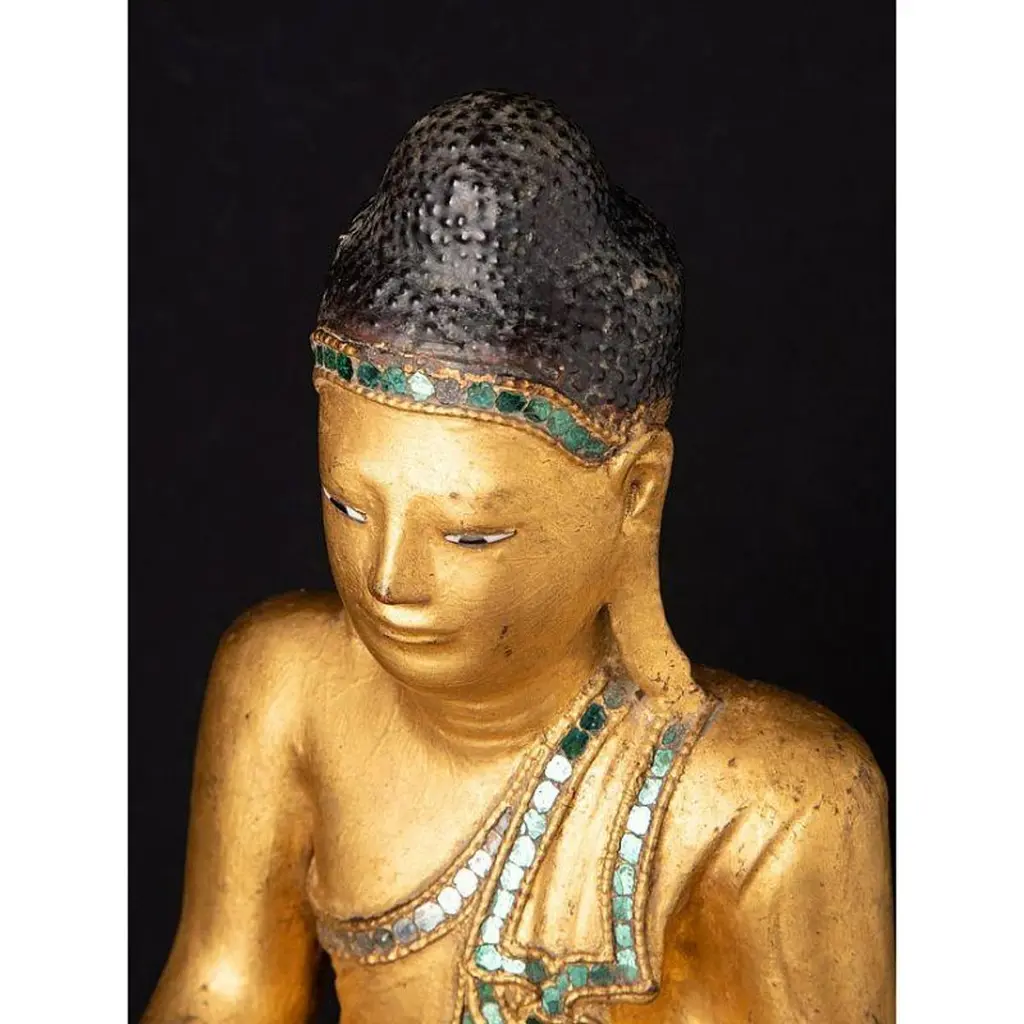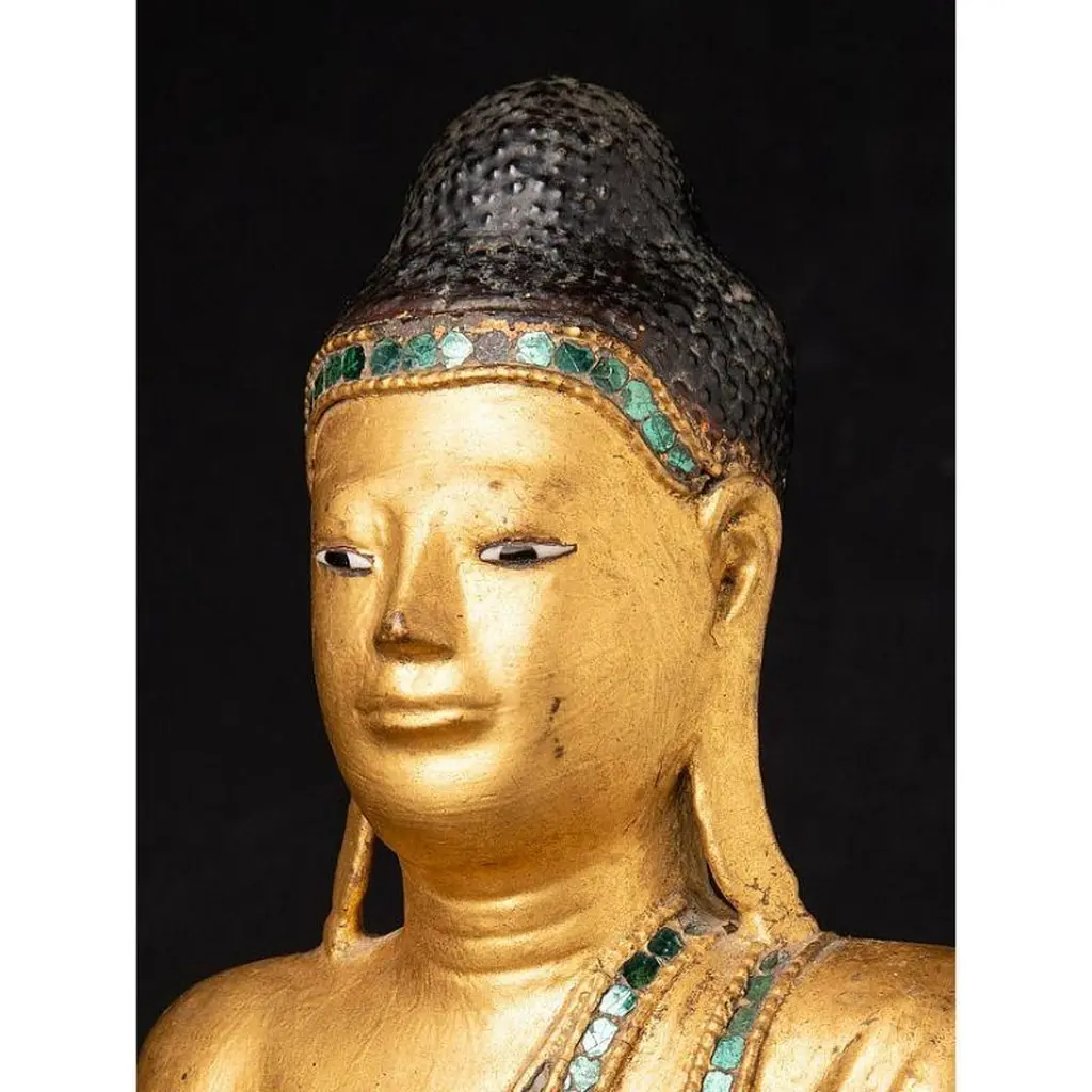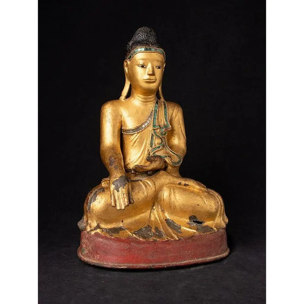 Material: bronze35,7 cm high 24 cm wide and 20,5 cm deepWeight: 5.35 kgsGilded with 24 krt. goldMandalay styleBhumisparsha mudraOriginating from BurmaEarly 19th centuryWith inlayed eyes