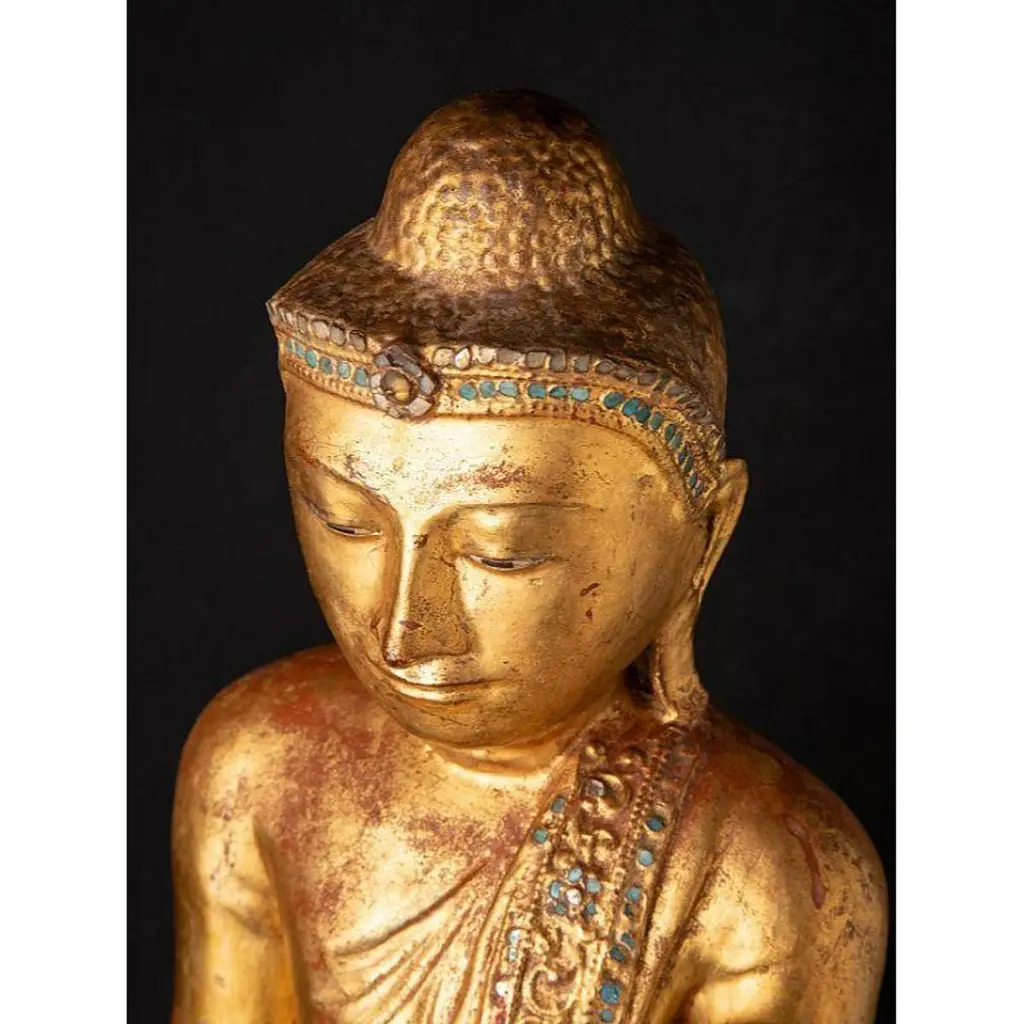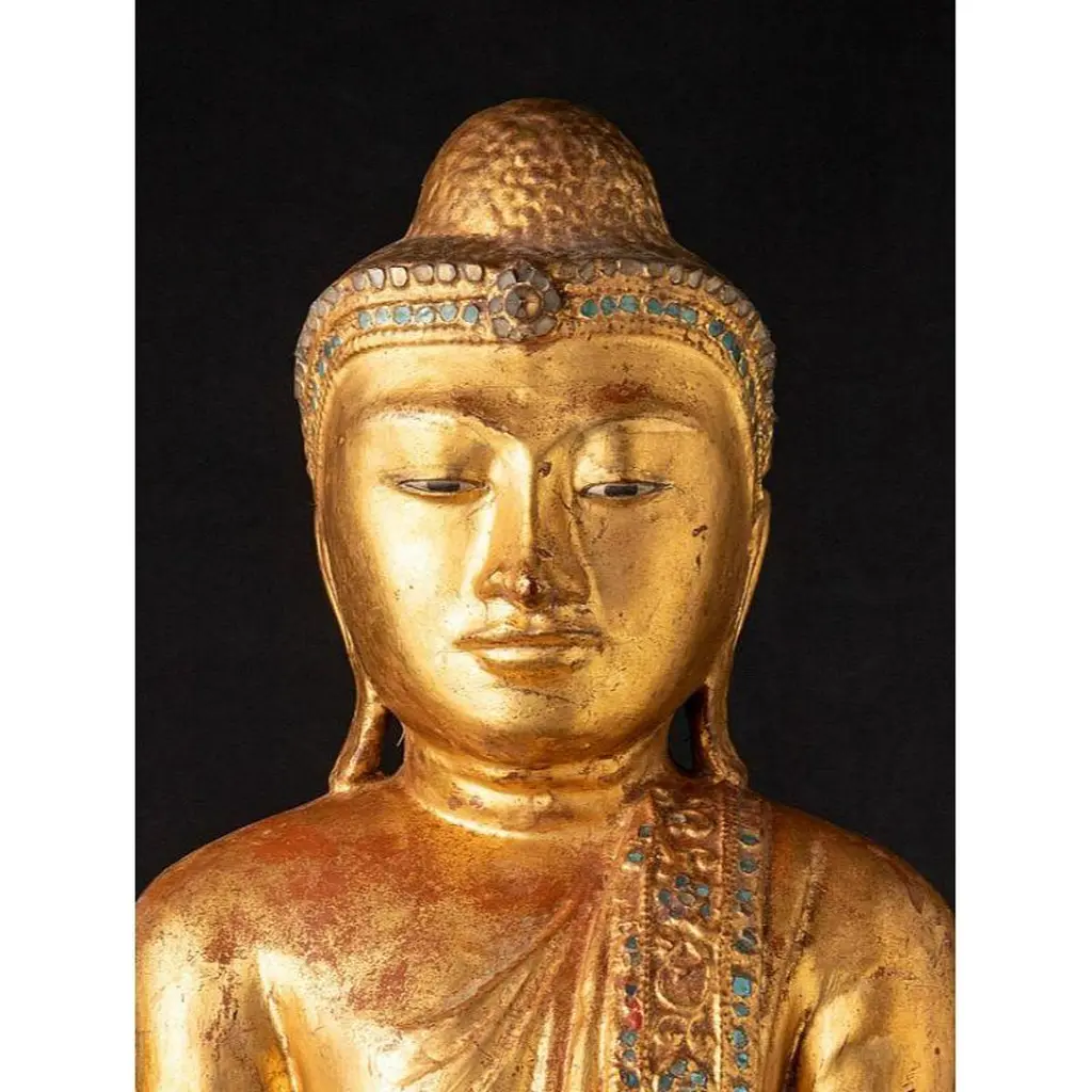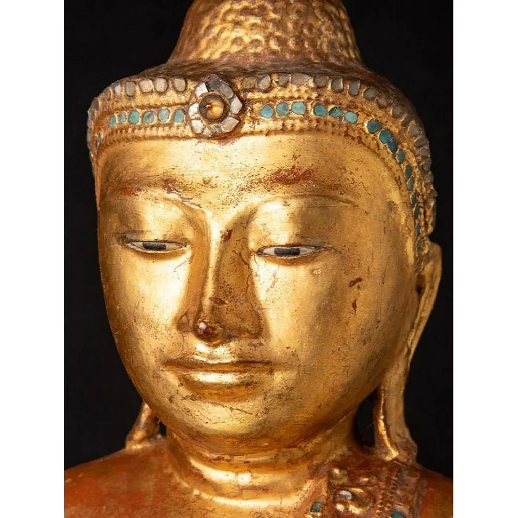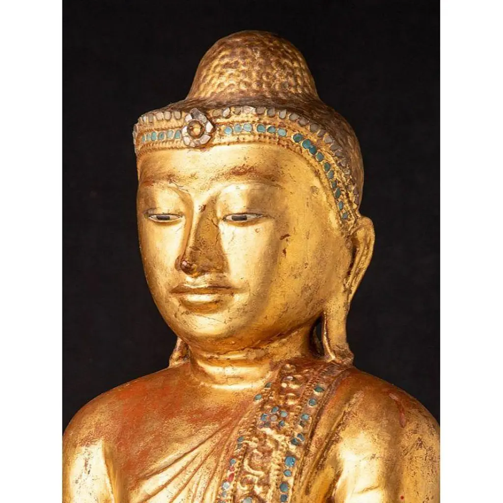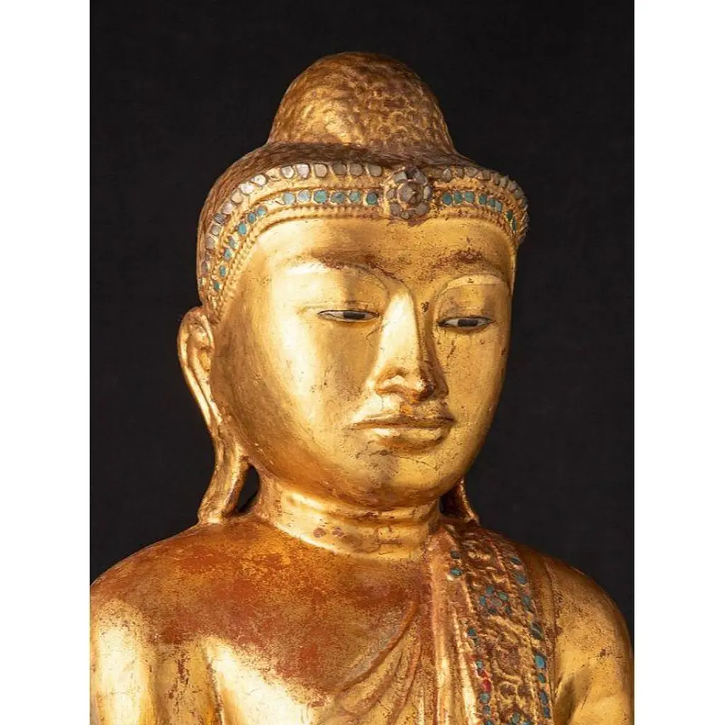 Material: wood84 cm high 39,5 cm wide and 22 cm deepWeight: 7.05 kgsGilded with 24 krt. goldMandalay styleOriginating from Burma19th centuryWith inlayed eyes