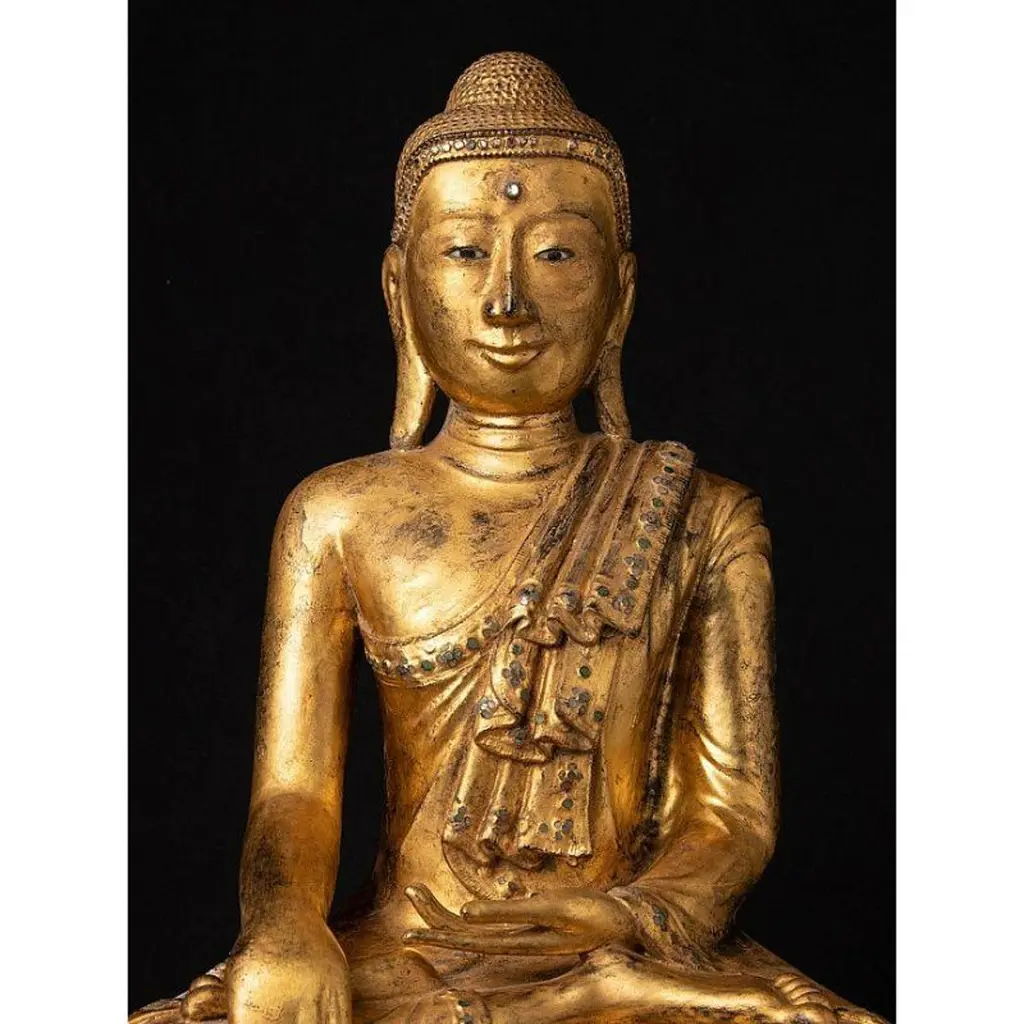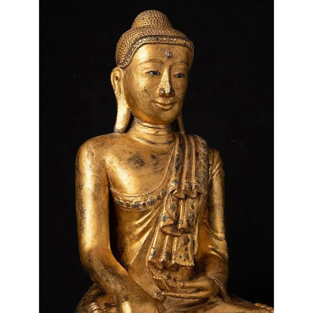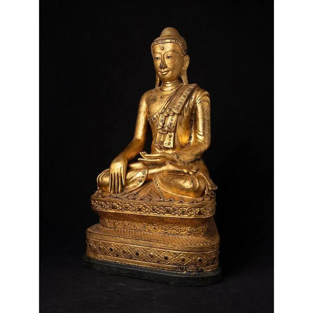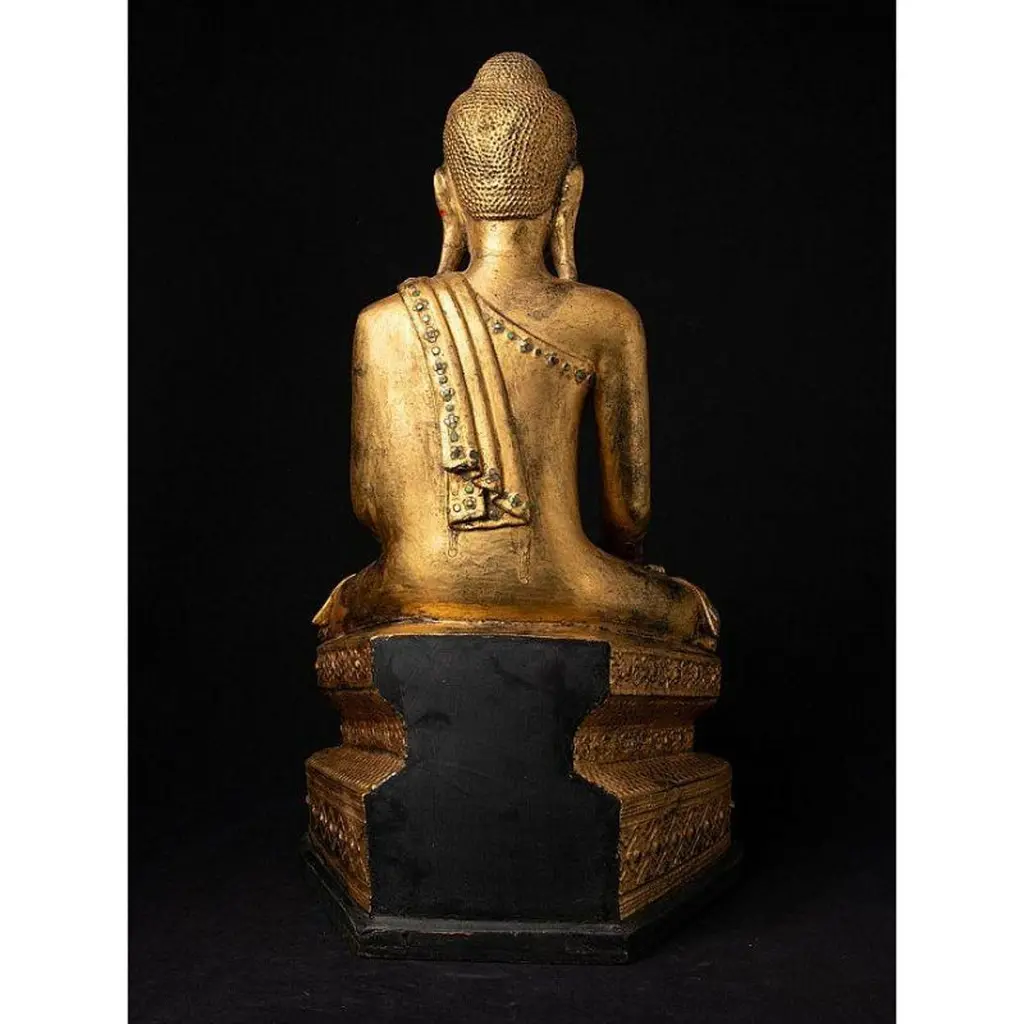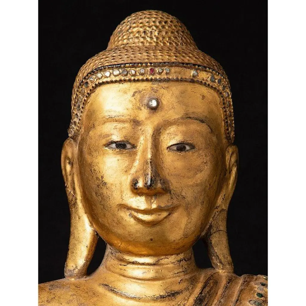 Material: lacquerwareMeasures: 62 cm high 36,8 cm wide and 28,5 cm deepWeight: 3.45 kgsGilded with 24 krt. goldMandalay styleBhumisparsha mudraOriginating from BurmaEarly 19th centuryWith inlayed eyes