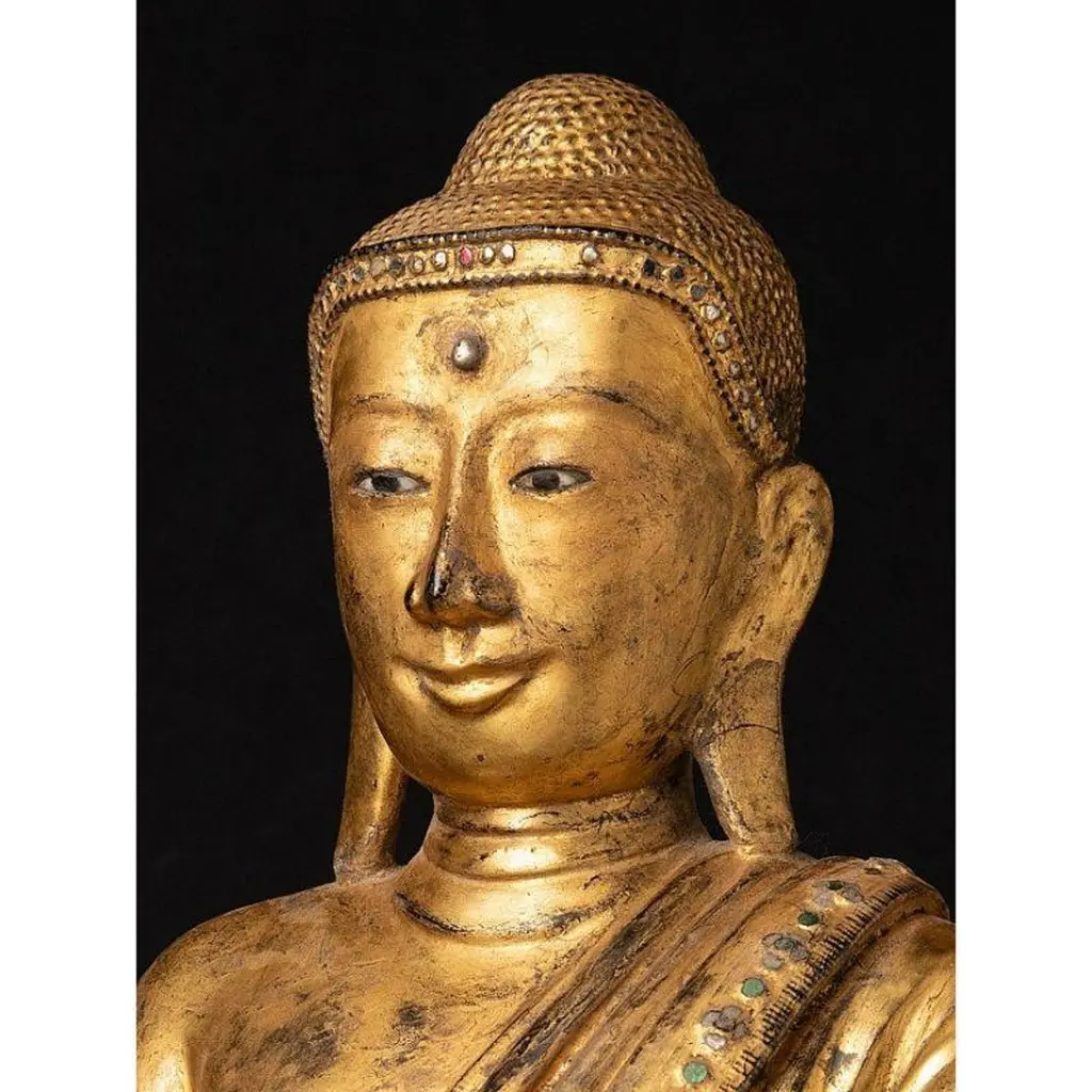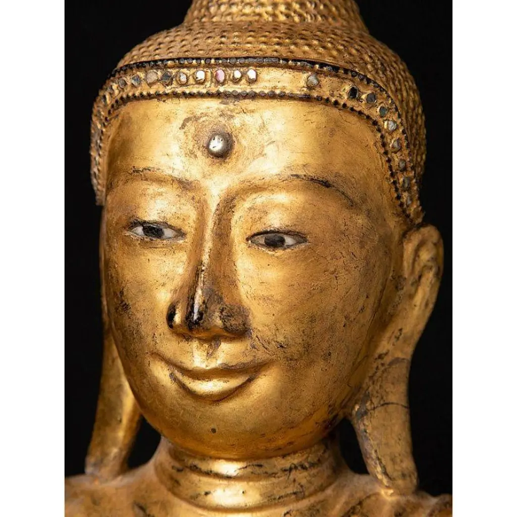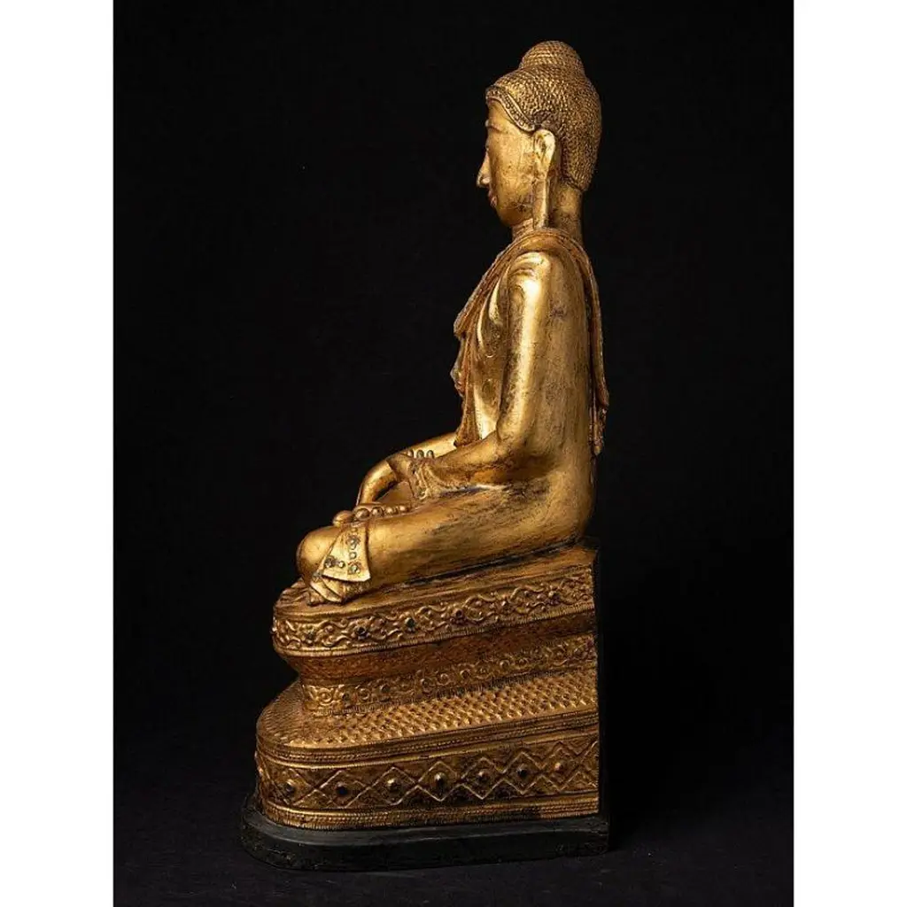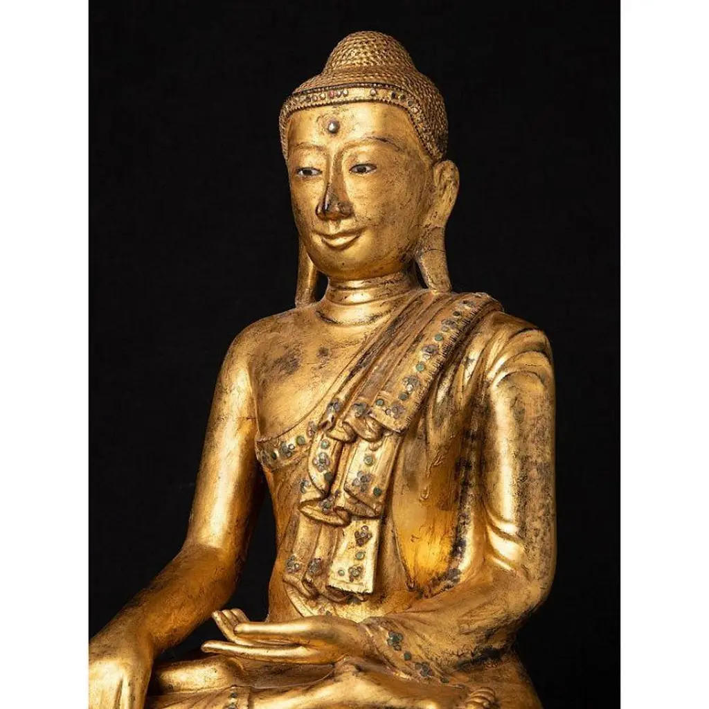 Material: lacquerwareMeasures: 62 cm high 36,8 cm wide and 28,5 cm deepWeight: 3.45 kgsGilded with 24 krt. goldMandalay styleBhumisparsha mudraOriginating from BurmaEarly 19th centuryWith inlayed eyes