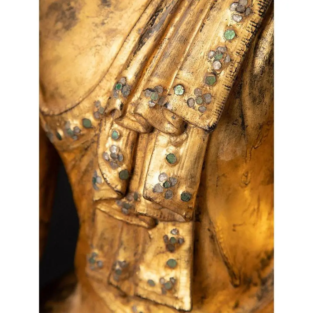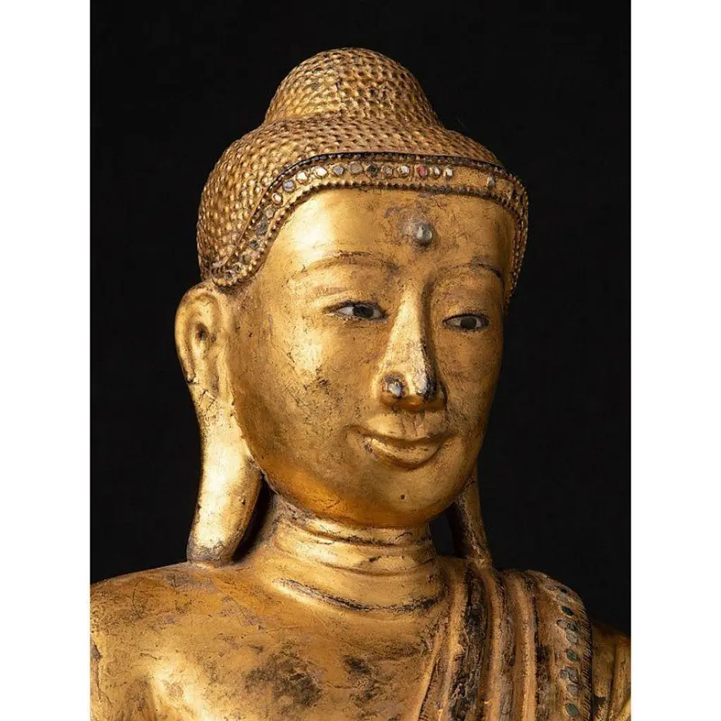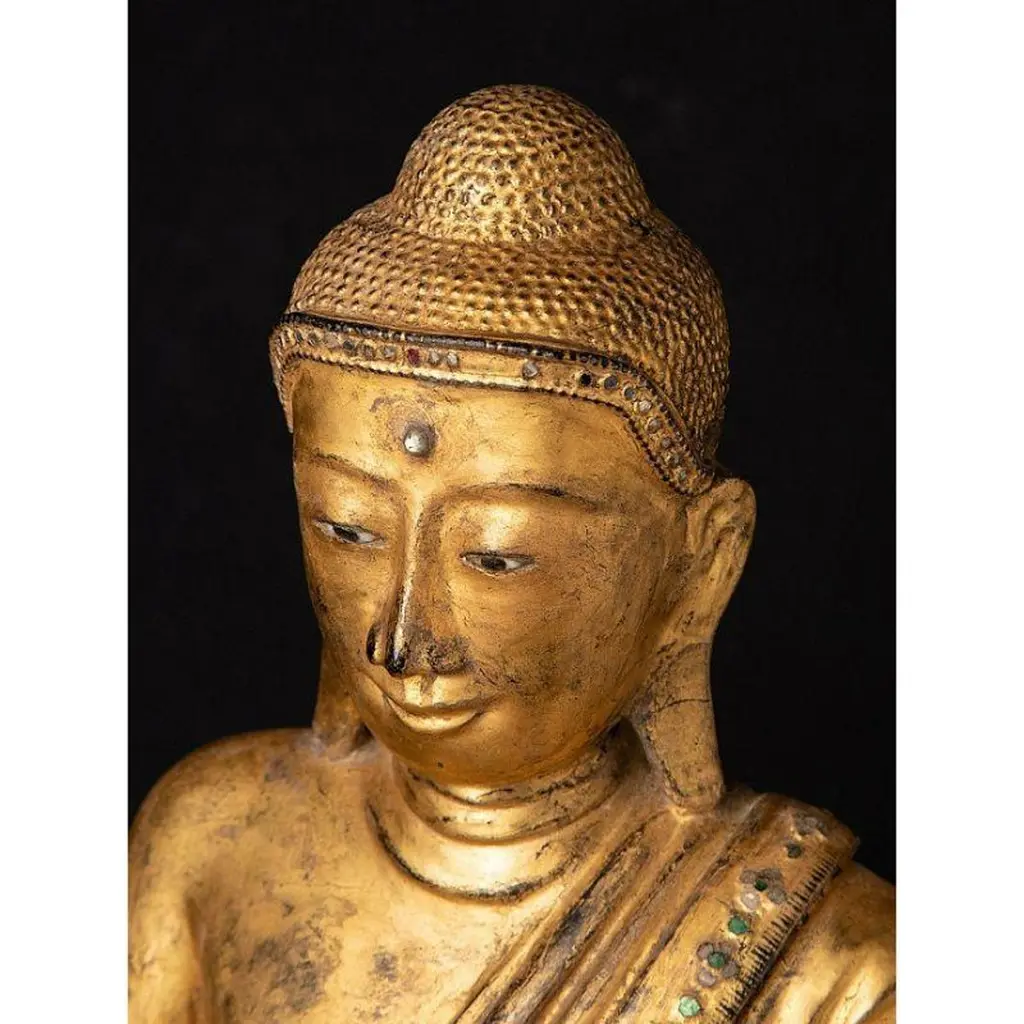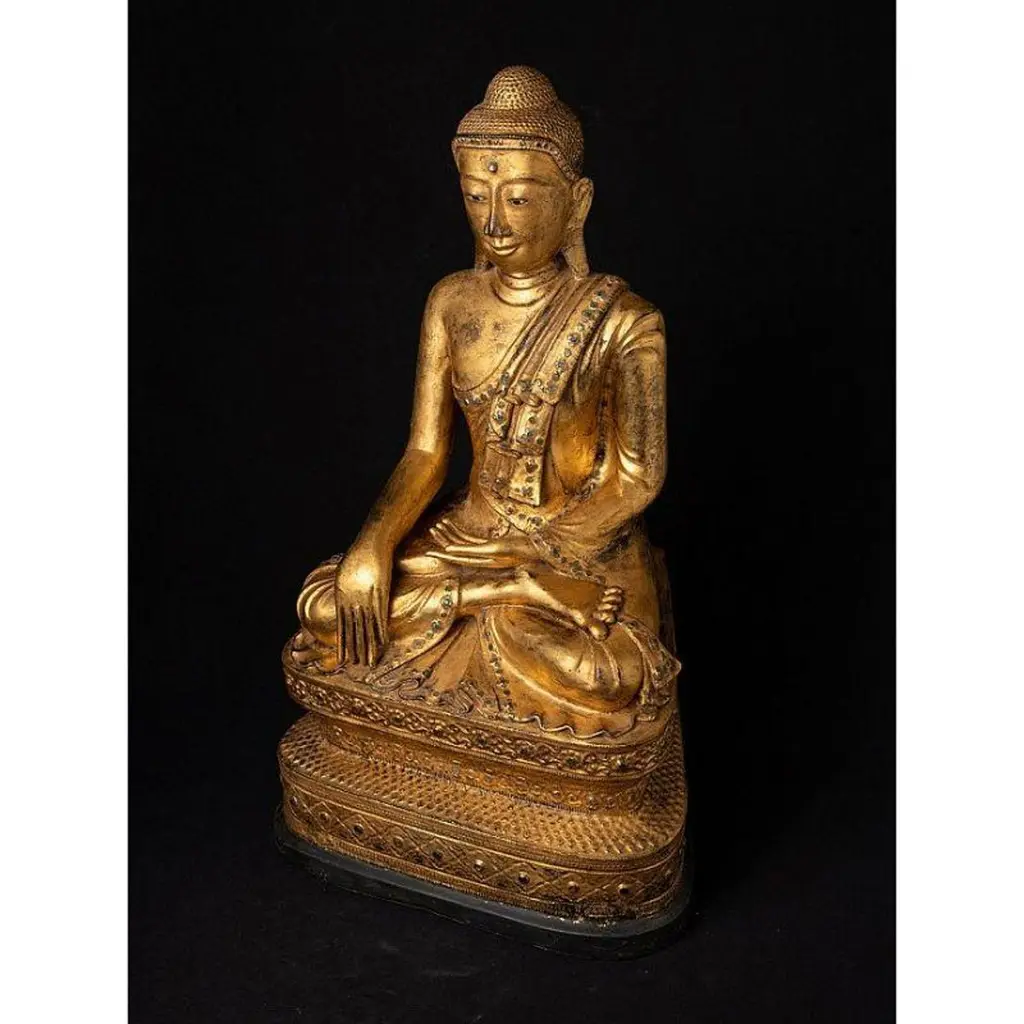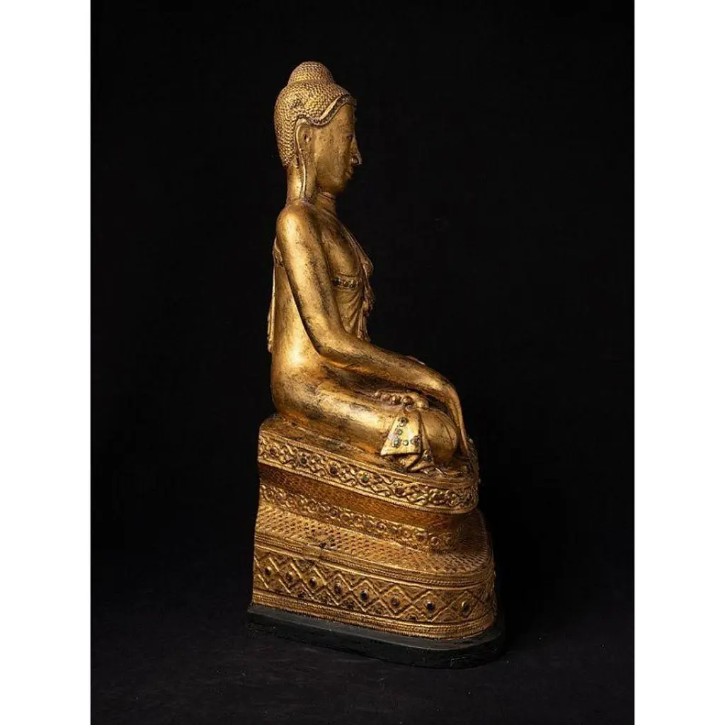 Material: lacquerwareMeasures: 62 cm high 36,8 cm wide and 28,5 cm deepWeight: 3.45 kgsGilded with 24 krt. goldMandalay styleBhumisparsha mudraOriginating from BurmaEarly 19th centuryWith inlayed eyes