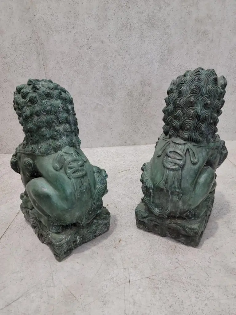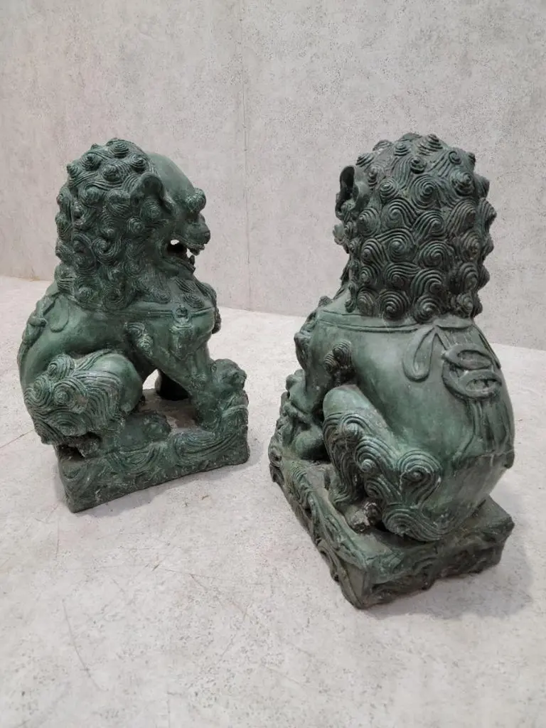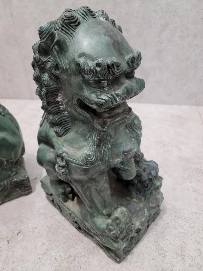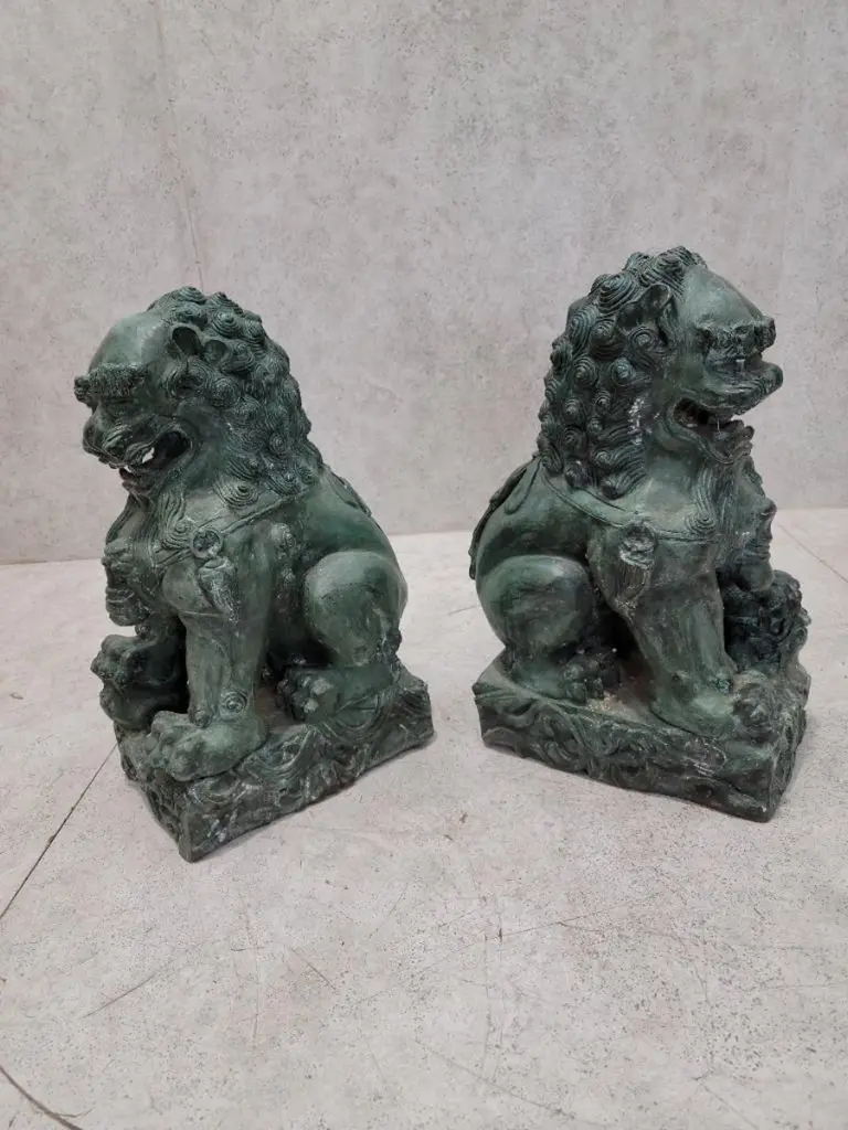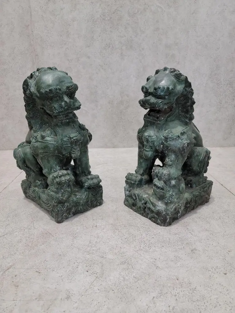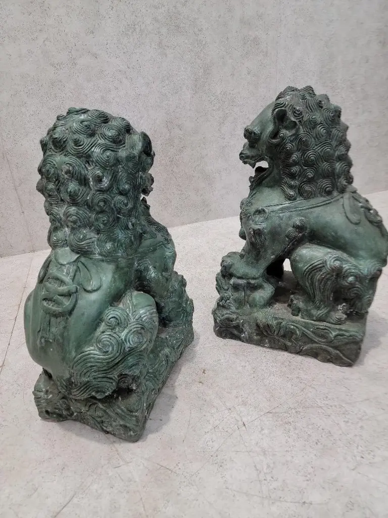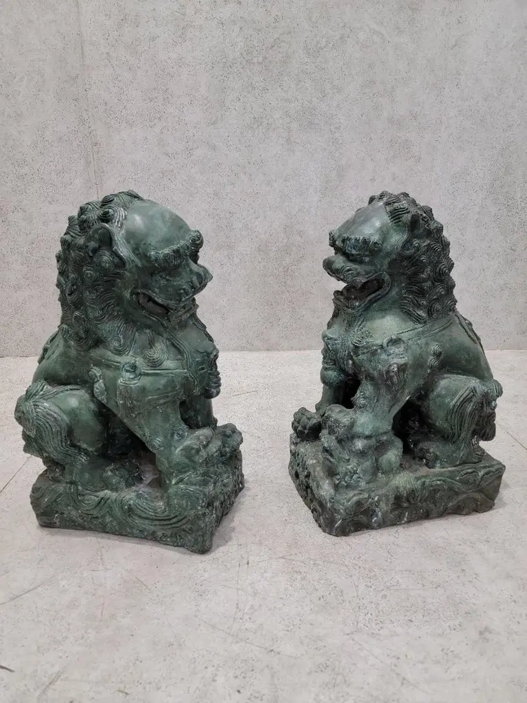 Antique Fengshui Chinese Bronze Guardian Lion Foo Dog Statue Sculpture - Pair Chinese guardian lions, also called Fu (Foo) Lions, lions of Buddha, are a common representation of the lion in pre-modern China, which is believed to have powerful mythic protective powers that has traditionally stood in front of Chinese Imperial palaces, temples, emperors' tombs, government offices and the homes of government officials and the wealthy from the Han Dynasty (206 BC-220 AD), until the end of the empire in 1911.Lions of Fo are always created in pairs, with the male playing with a ball and the female with a cub. Pairs of Chinese guardian lions, also called Chinese stone lions are still common decorative and symbolic elements at the entrances to restaurants, hotels, supermarkets and other structures, with one sitting on each side of the entrance.