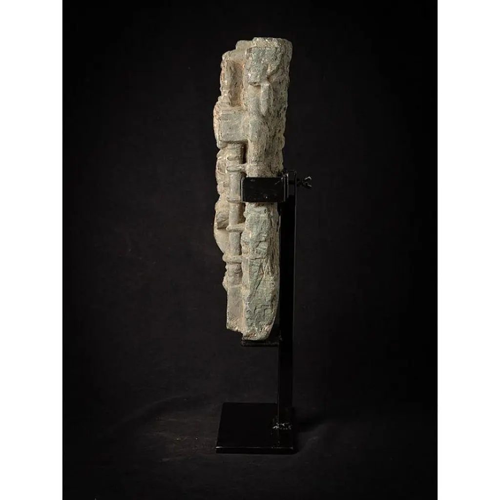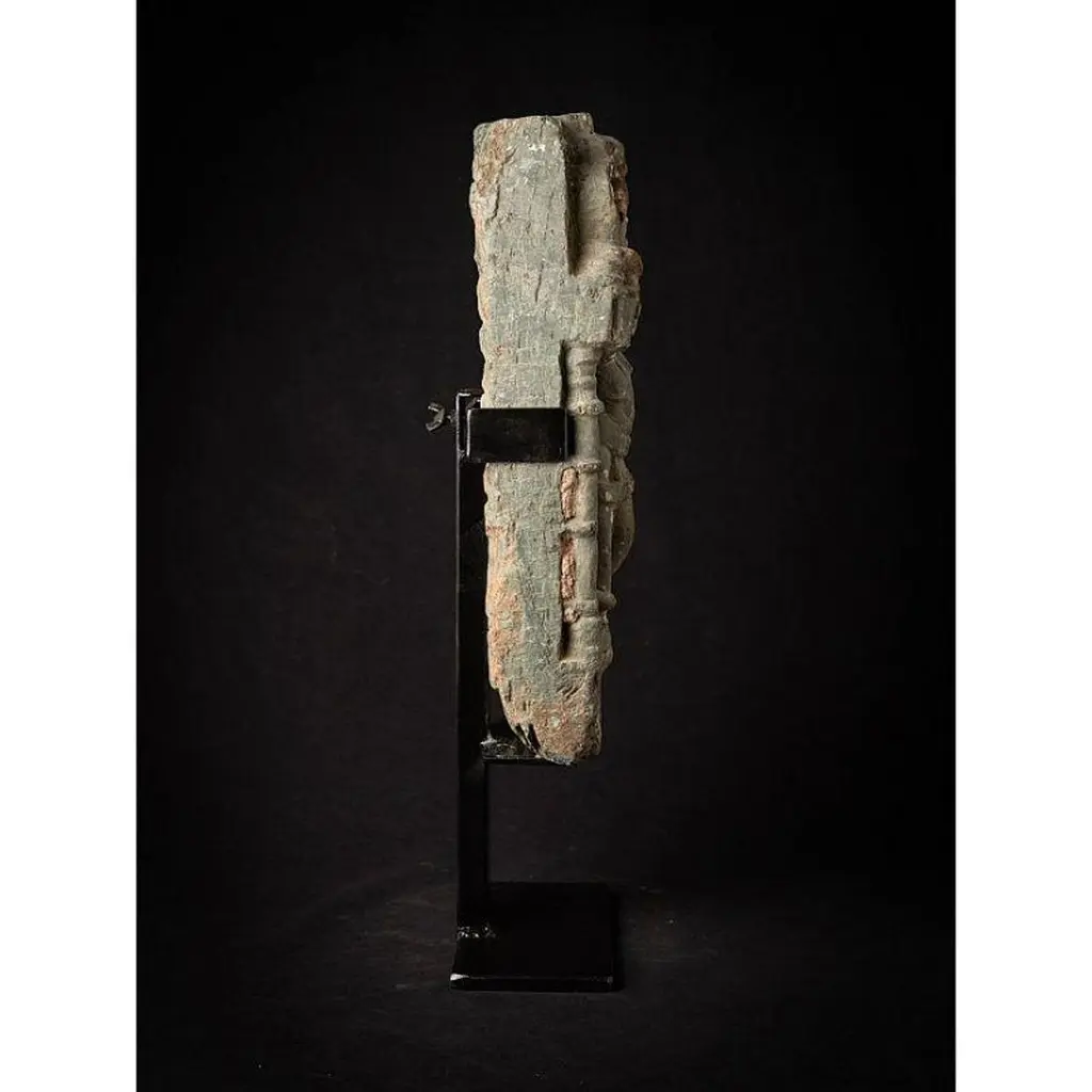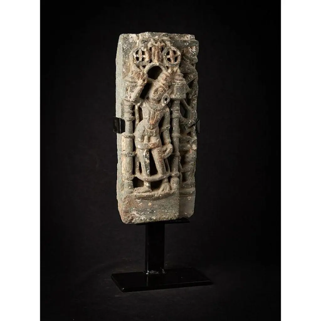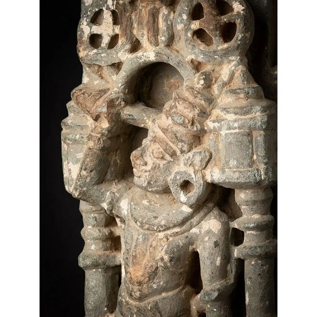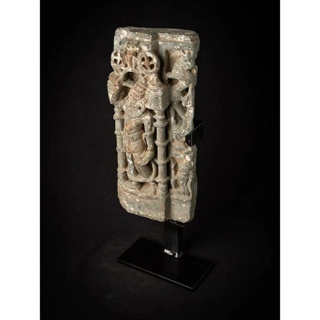 Material: GraniteMaterial: wood53,5 cm high 19,8 cm wide and 13,5 cm deepWeight: 12.9 kgsThe height is measured including the stand. Just the granite figure is 39 cm highOriginating from India14th centuryOriginating from a temple in RajasthanIndra as a carrier of a flyfan. Is a permanent companion of Jina images