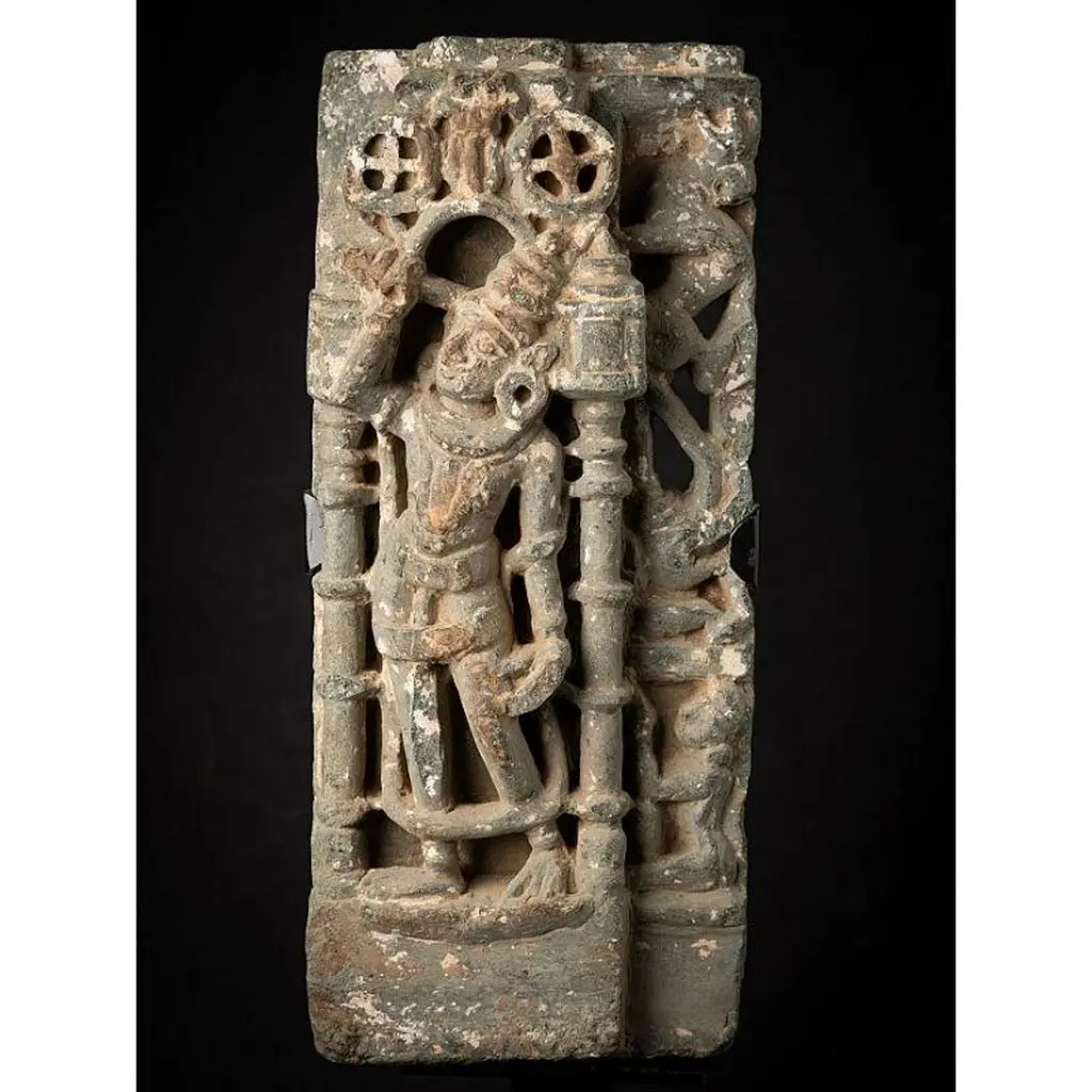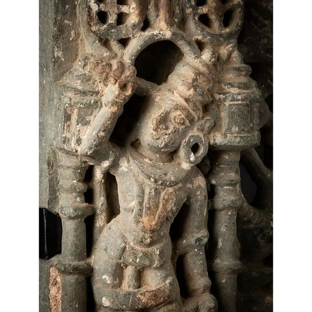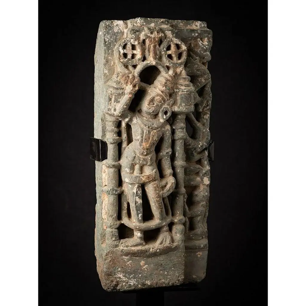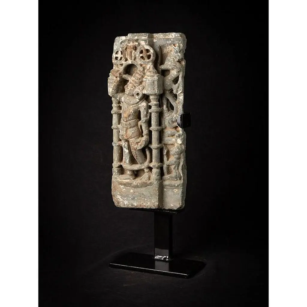 Material: GraniteMaterial: wood53,5 cm high 19,8 cm wide and 13,5 cm deepWeight: 12.9 kgsThe height is measured including the stand. Just the granite figure is 39 cm highOriginating from India14th centuryOriginating from a temple in RajasthanIndra as a carrier of a flyfan. Is a permanent companion of Jina images