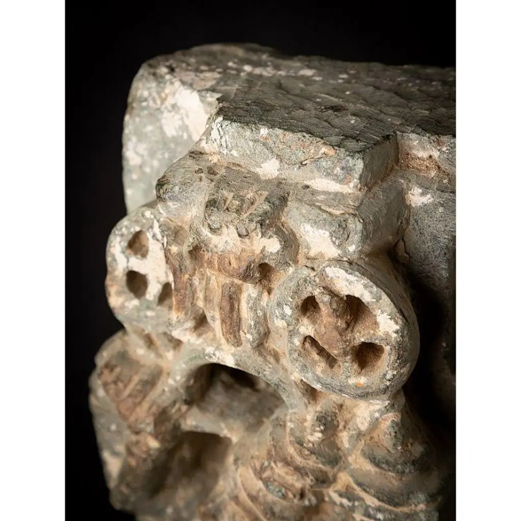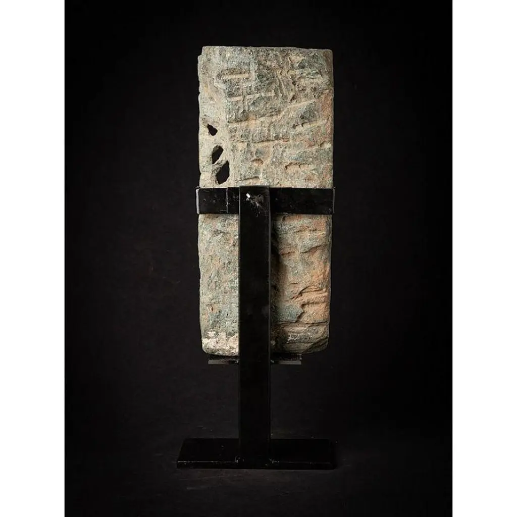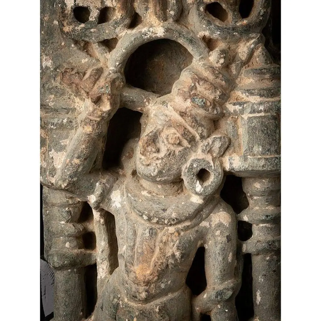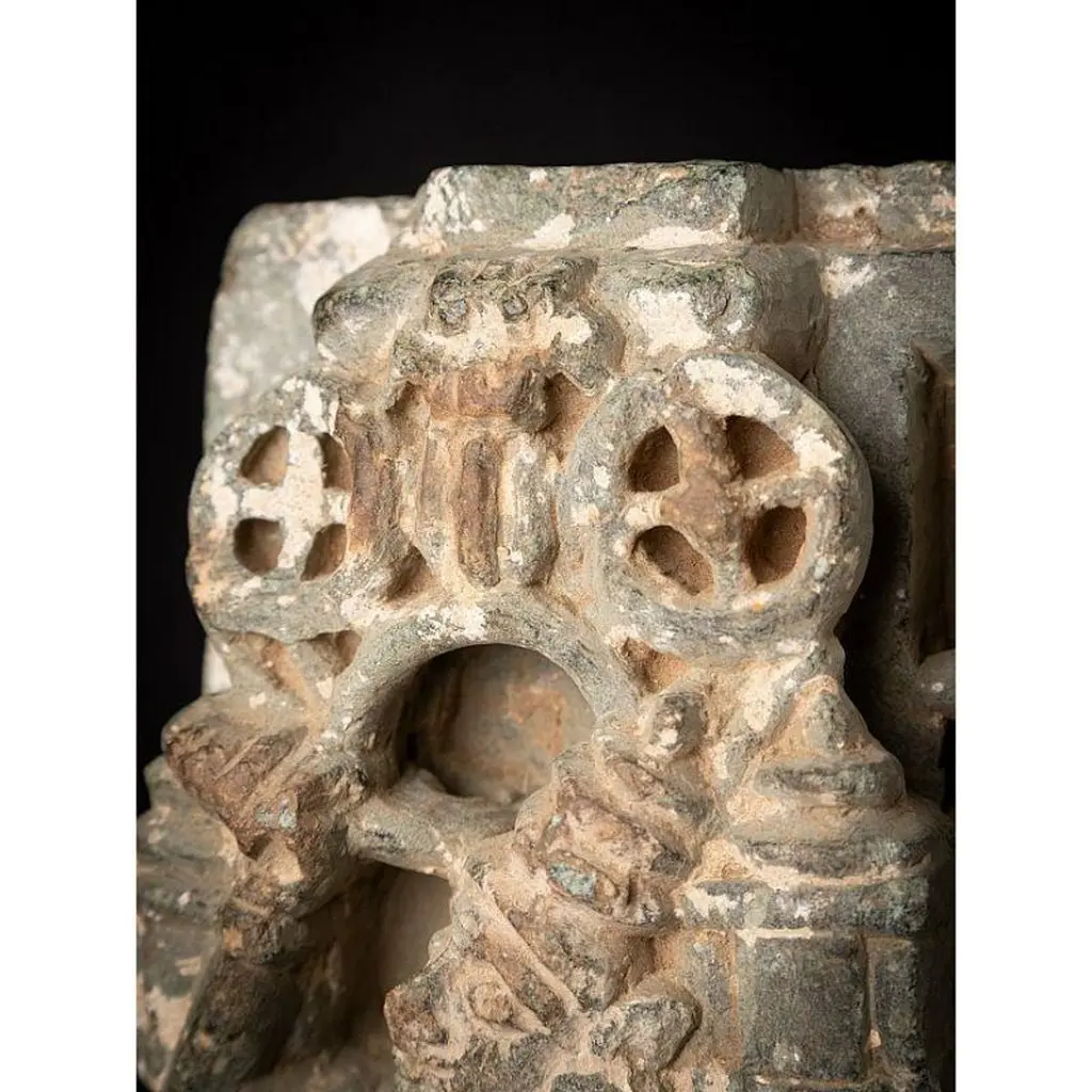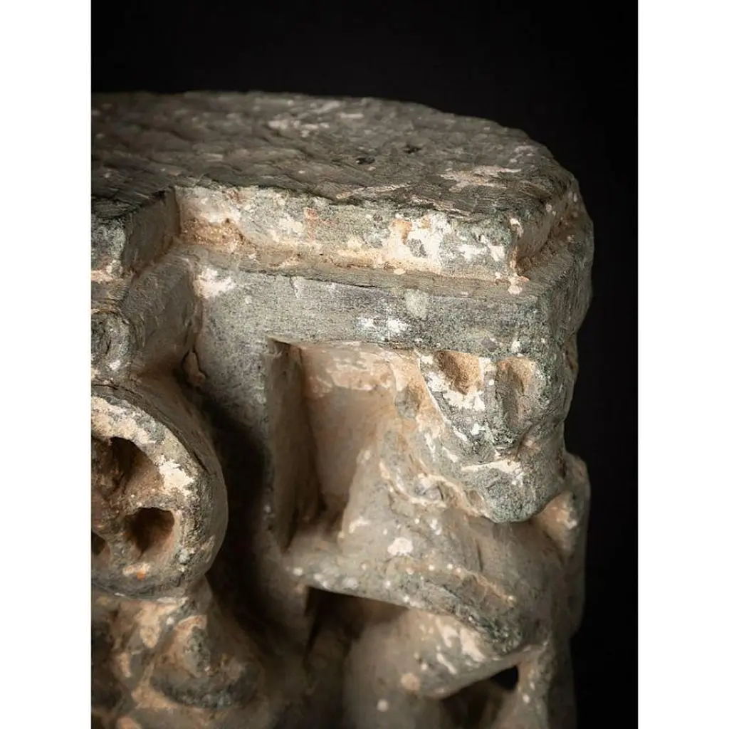 Material: GraniteMaterial: wood53,5 cm high 19,8 cm wide and 13,5 cm deepWeight: 12.9 kgsThe height is measured including the stand. Just the granite figure is 39 cm highOriginating from India14th centuryOriginating from a temple in RajasthanIndra as a carrier of a flyfan. Is a permanent companion of Jina images