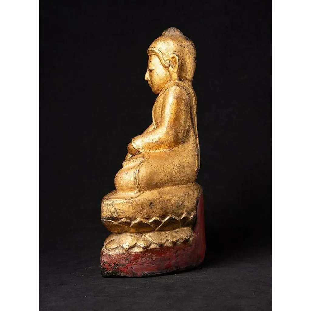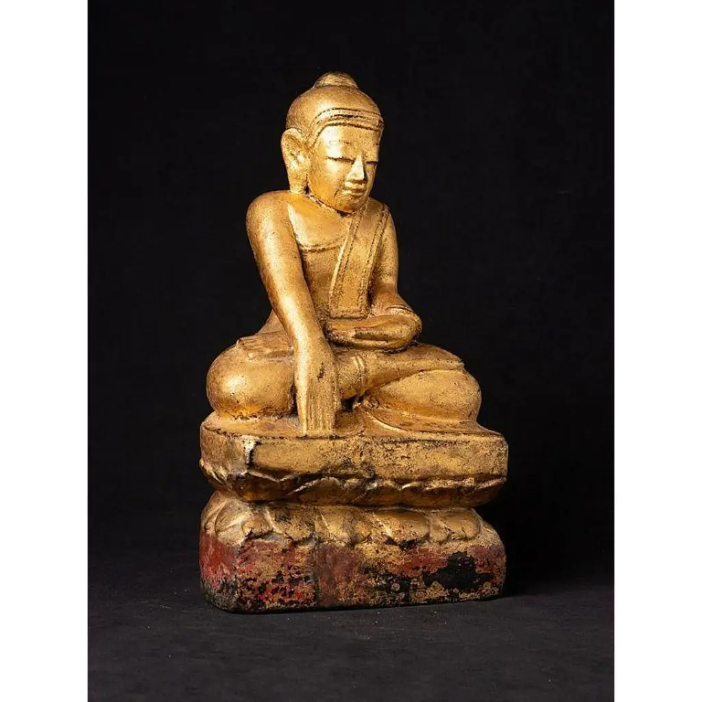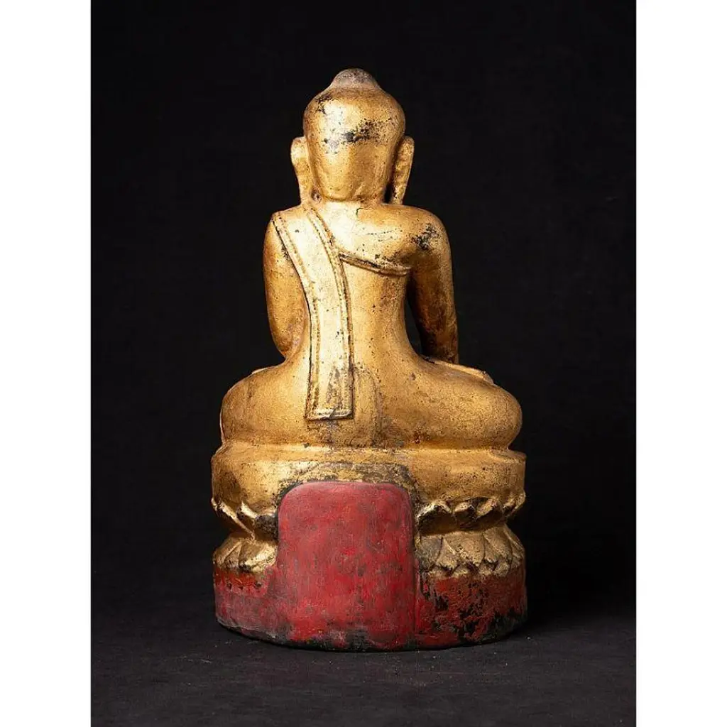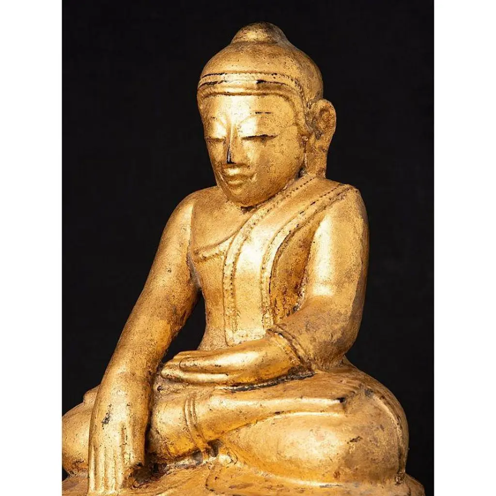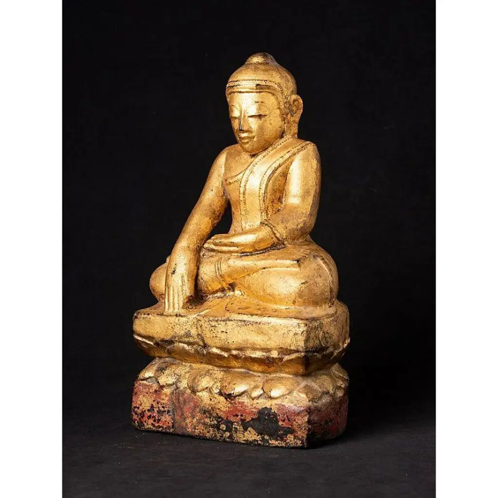 Material: woodMeasures: 33,9 cm high 19,4 cm wide and 13,4 cm deepWeight: 2.272 kgsGilded with 24 krt. goldBhumisparsha mudraOriginating from BurmaEarly 19th century