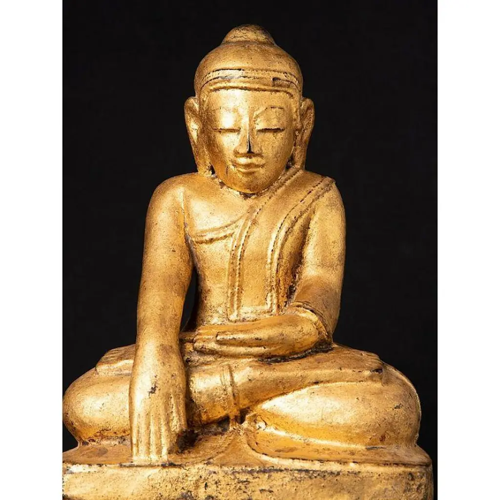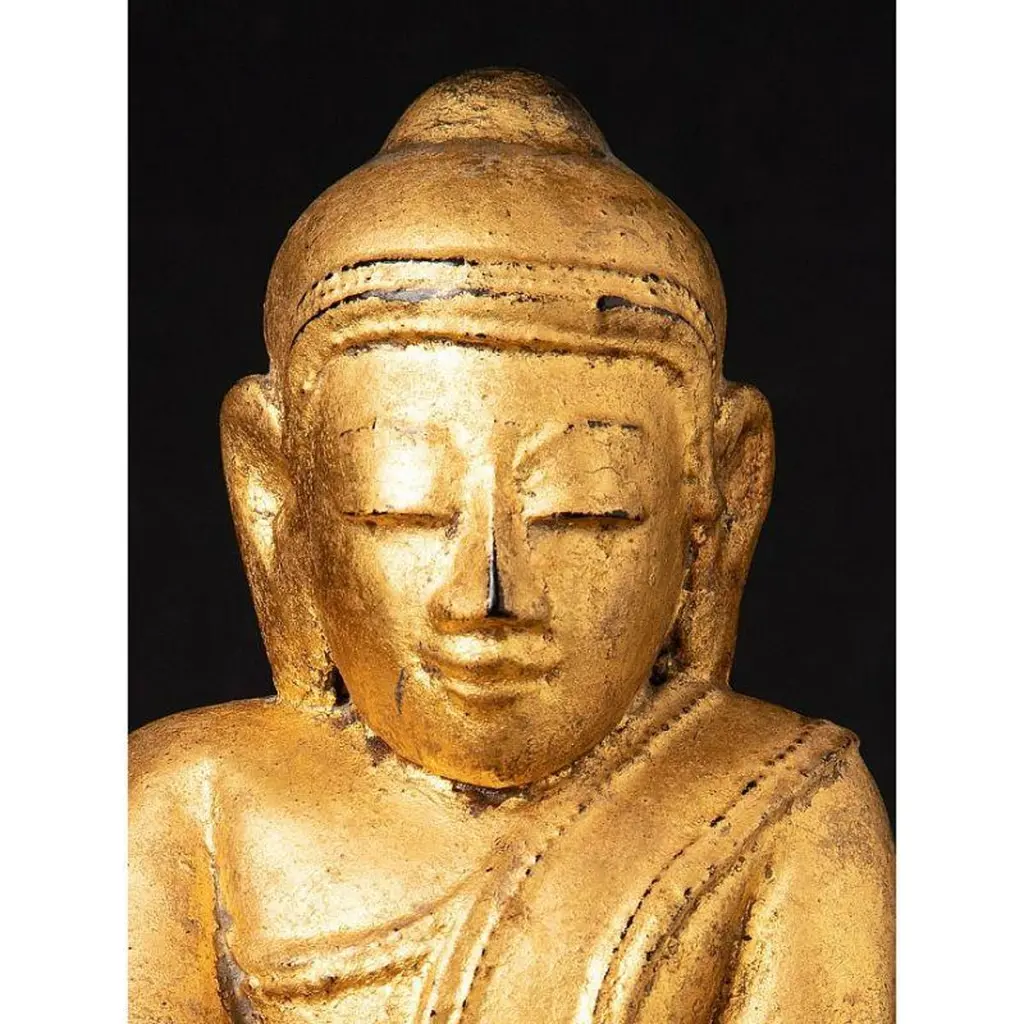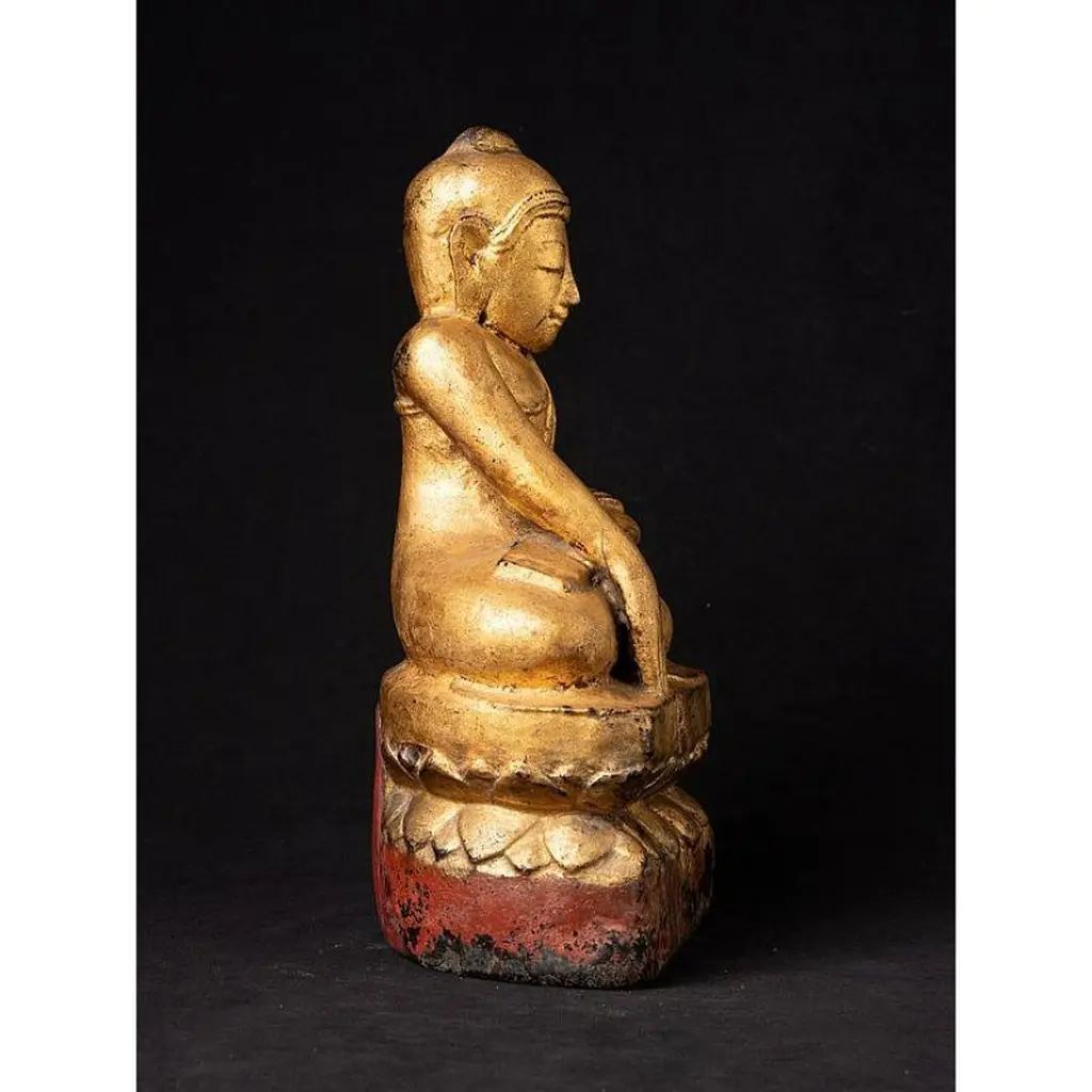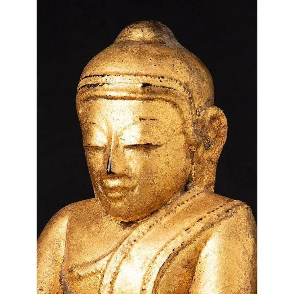 Material: woodMeasures: 33,9 cm high 19,4 cm wide and 13,4 cm deepWeight: 2.272 kgsGilded with 24 krt. goldBhumisparsha mudraOriginating from BurmaEarly 19th century