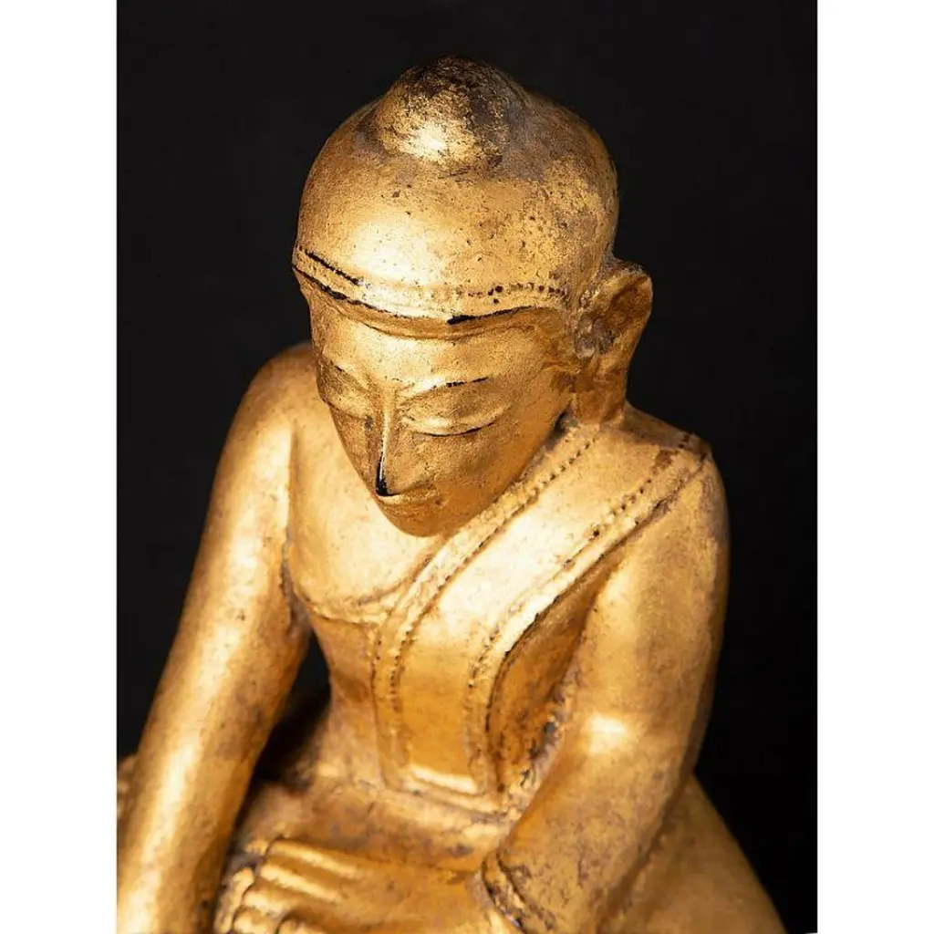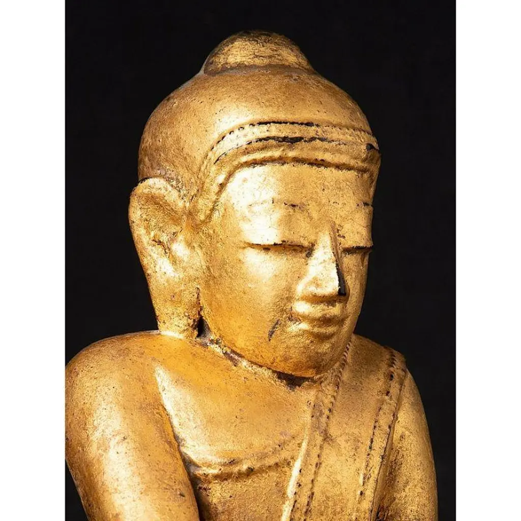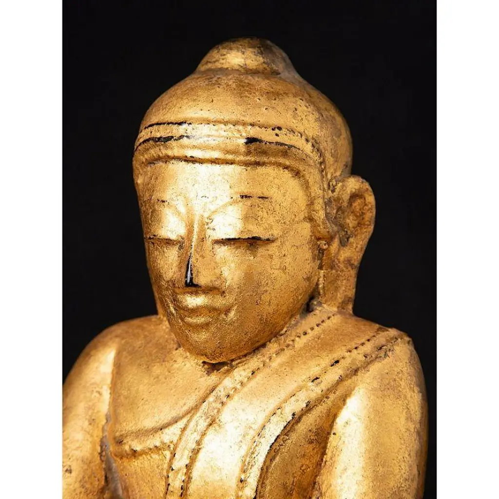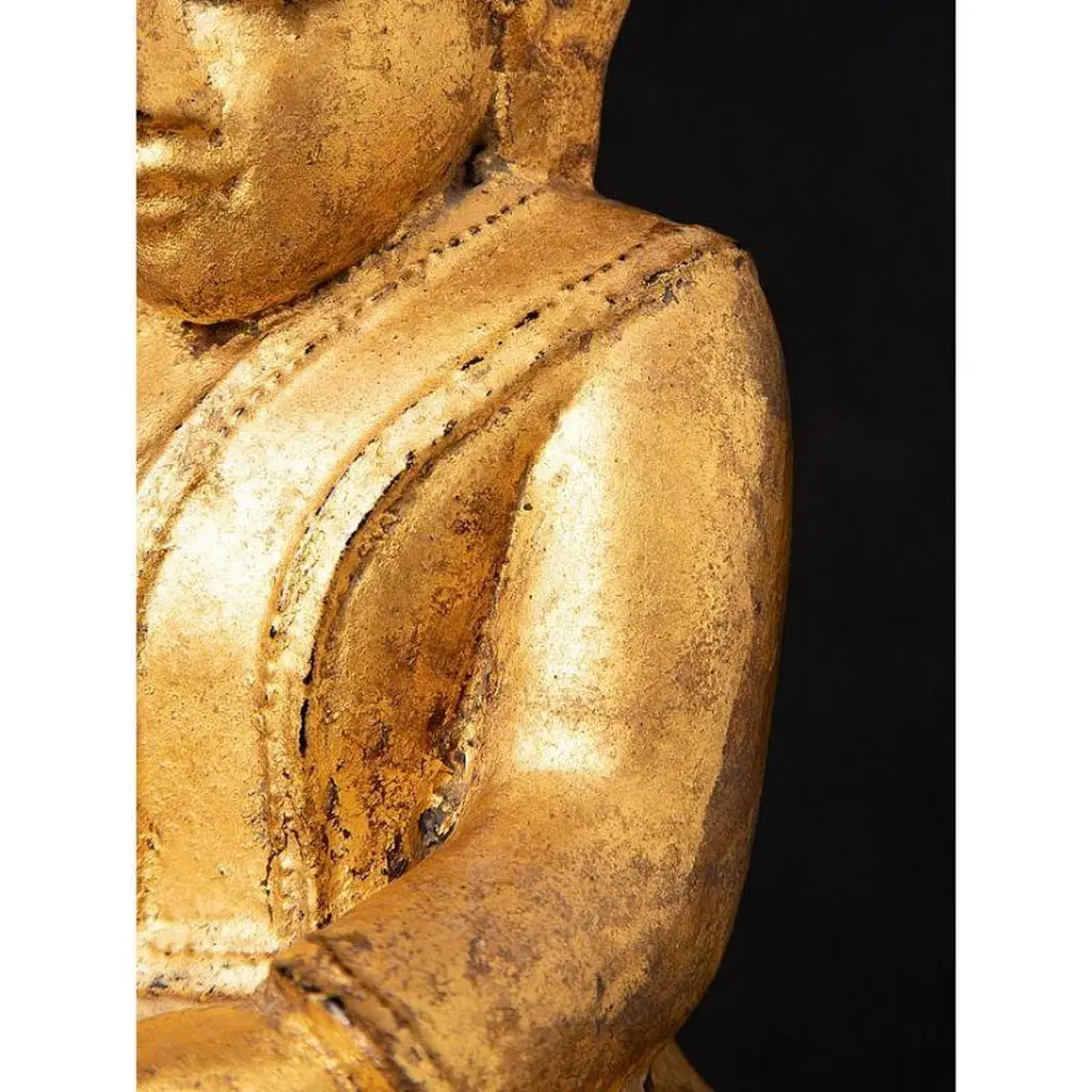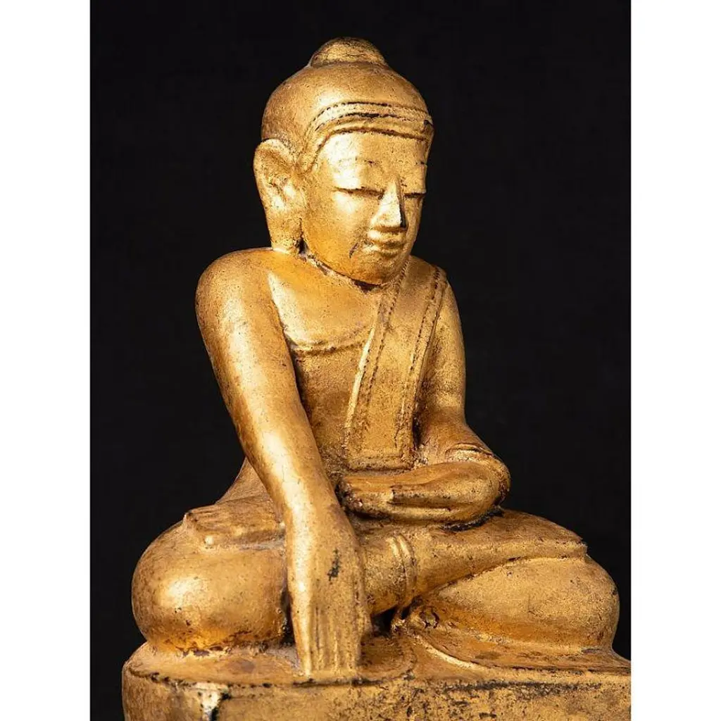 Material: woodMeasures: 33,9 cm high 19,4 cm wide and 13,4 cm deepWeight: 2.272 kgsGilded with 24 krt. goldBhumisparsha mudraOriginating from BurmaEarly 19th century