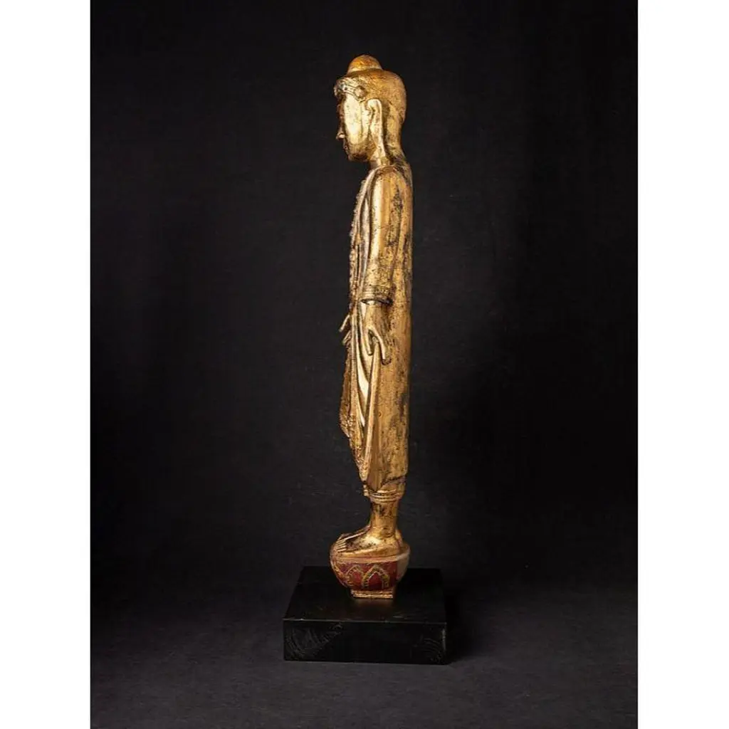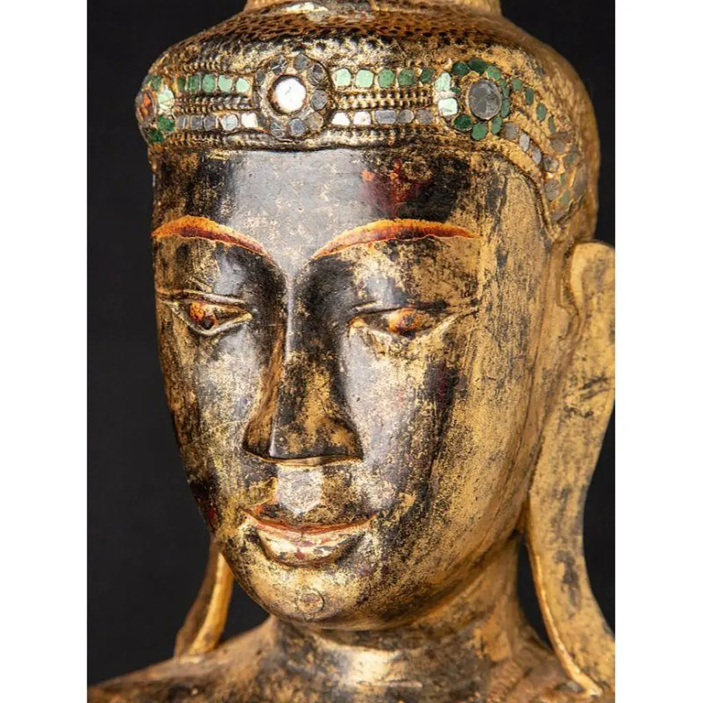 Material: wood90 cm high 39 cm wide and 24 cm deepWeight: 5.8 kgsWith traces of the original 24 krt. gildingOriginating from Burma19th centuryThe height of the black base is included and is 6.4 cmWith a beautiful and rare facial expression !