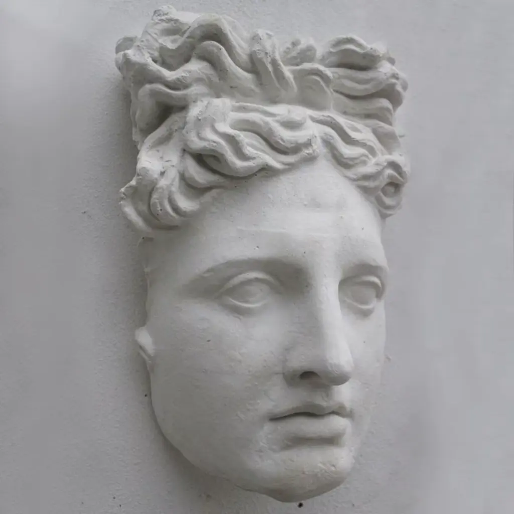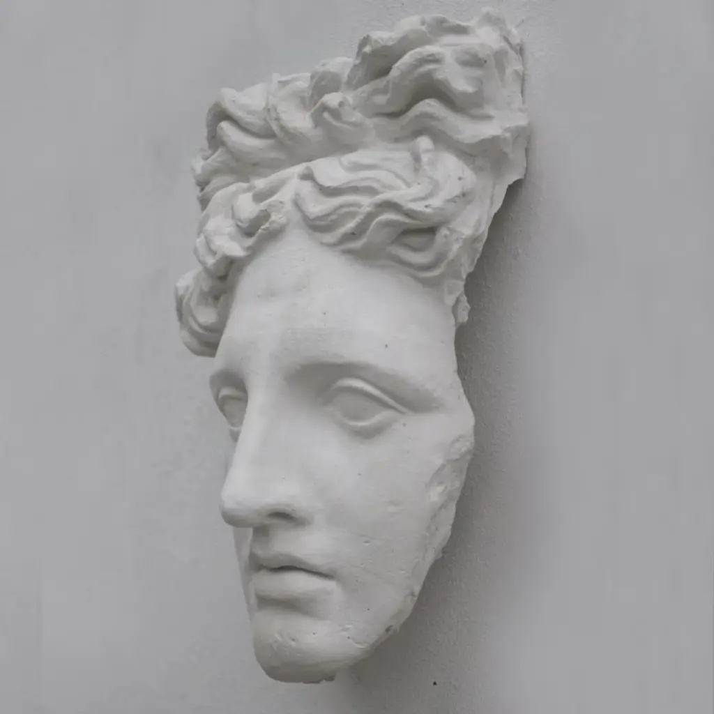 This is a fragmented plaster sculpture of the face of the Roman God Apollo, handcrafted by the artists of Galleria Romanelli in Florence. The piece is a copy of a fragment of the Apollo Belvedere, one of the most celebrated sculptures of Antiquity, which is hosted in the Vatican Museums and dates to the 2nd century AD. During the Renaissance, the sculpture was seen as the utmost expression of ideal beauty, which is replicated here in this face representation.