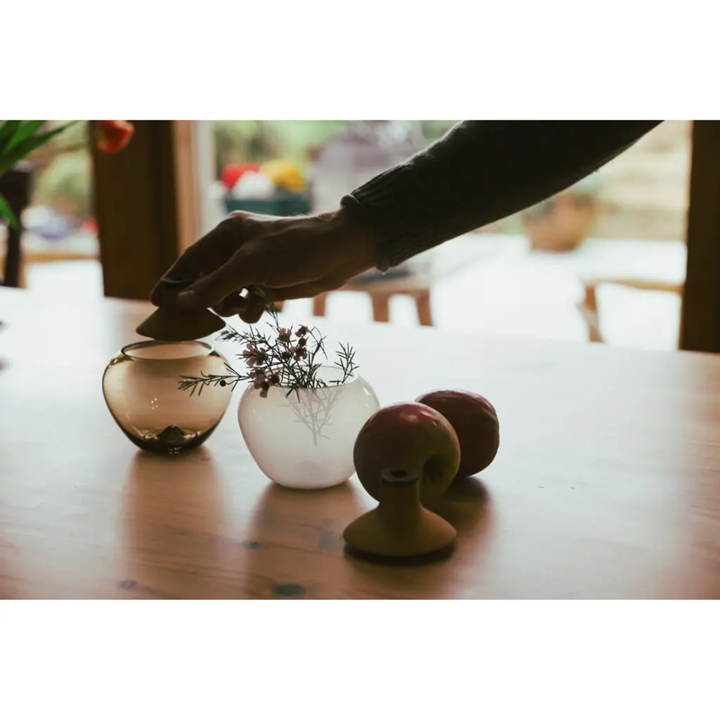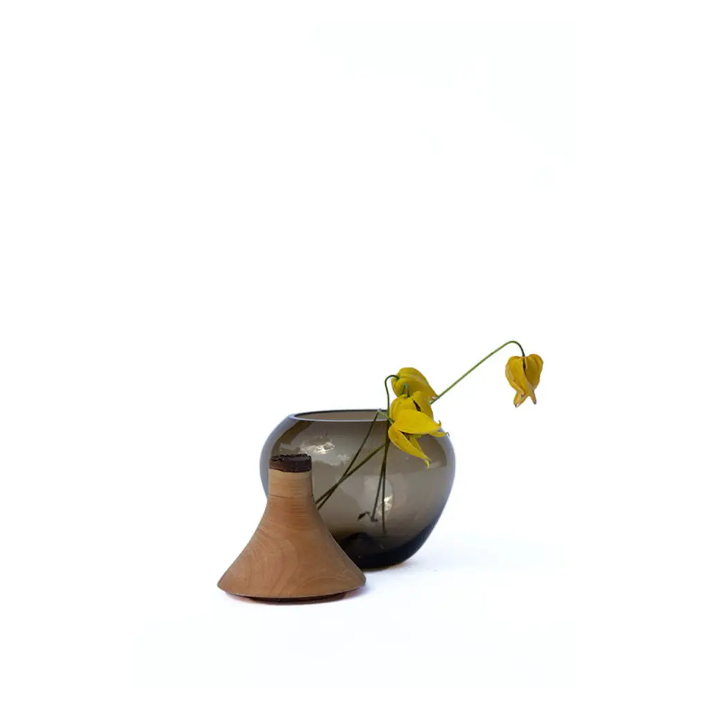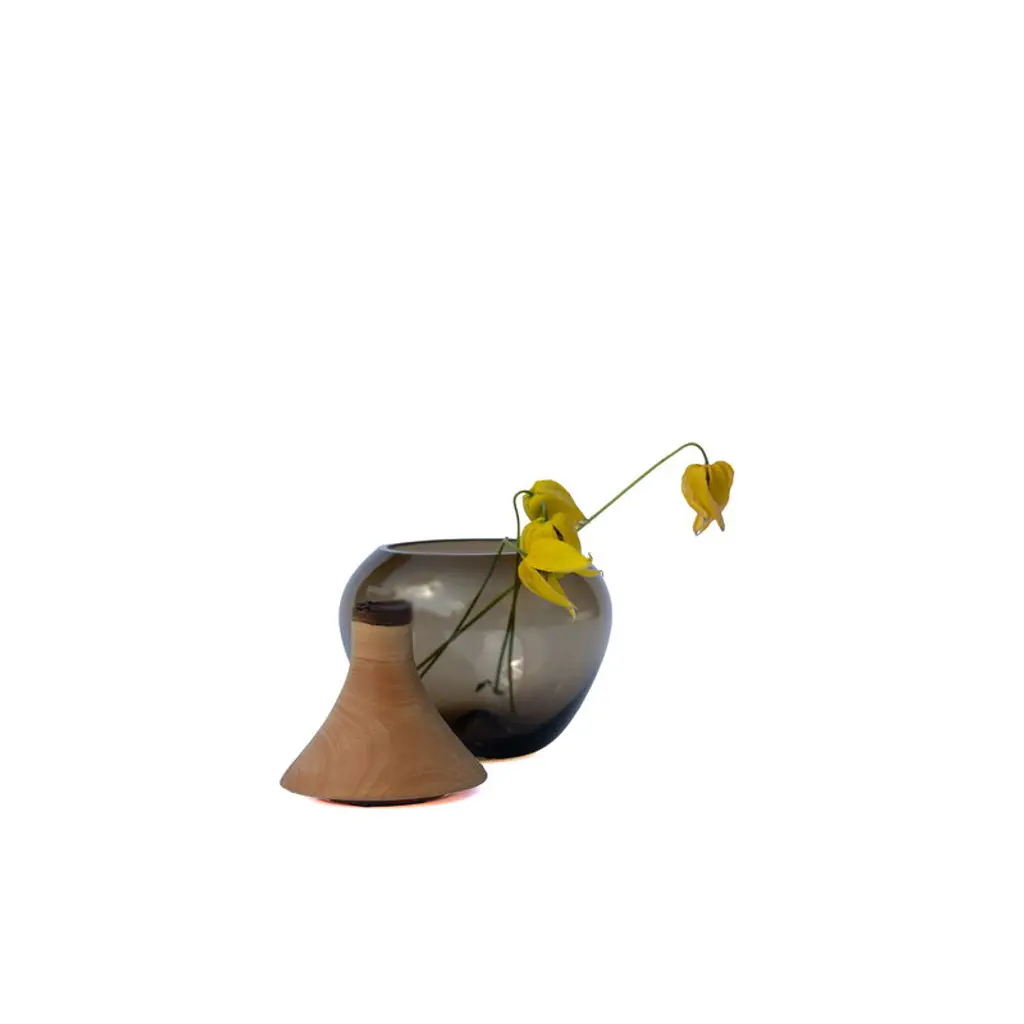 Utopia & Utility's stacking vessel Apple is a handcrafted glass sculpture designed by Finnish-German artist Pia Wüstenberg. This exquisite piece features a small glass vessel crowned by a wooden piece with beautiful, naturally unsymmetrical edges. When stacked together, the components form a striking sculpture, and while separate, the glass vessel can be used as a vase for flowers. The Stacking Vessels collection celebrates local craftsmanship, with all its pieces produced in Europe: the glass is mouth-blown in the Czech Republic, the wooden pieces hand-turned in Finland and the metal parts hand-spun in England. The final assembly takes place at Utopia & Utility's own warehouse in Northern Germany. Skillfully crafted Stacking Vessels add a captivating touch to any shelf or dining table and serve as a perfect choice for a memorable gift.