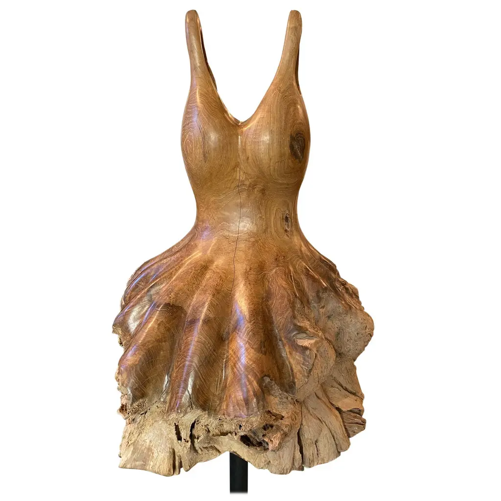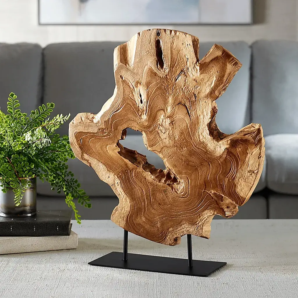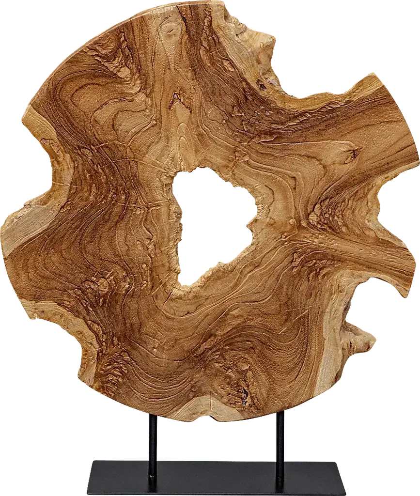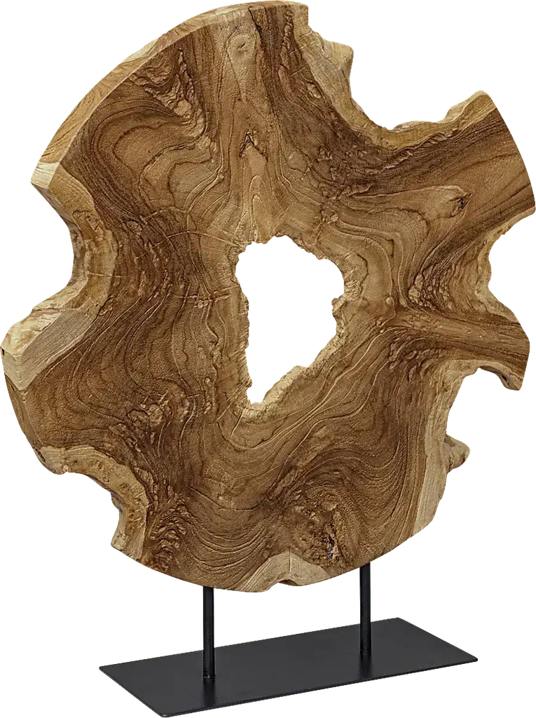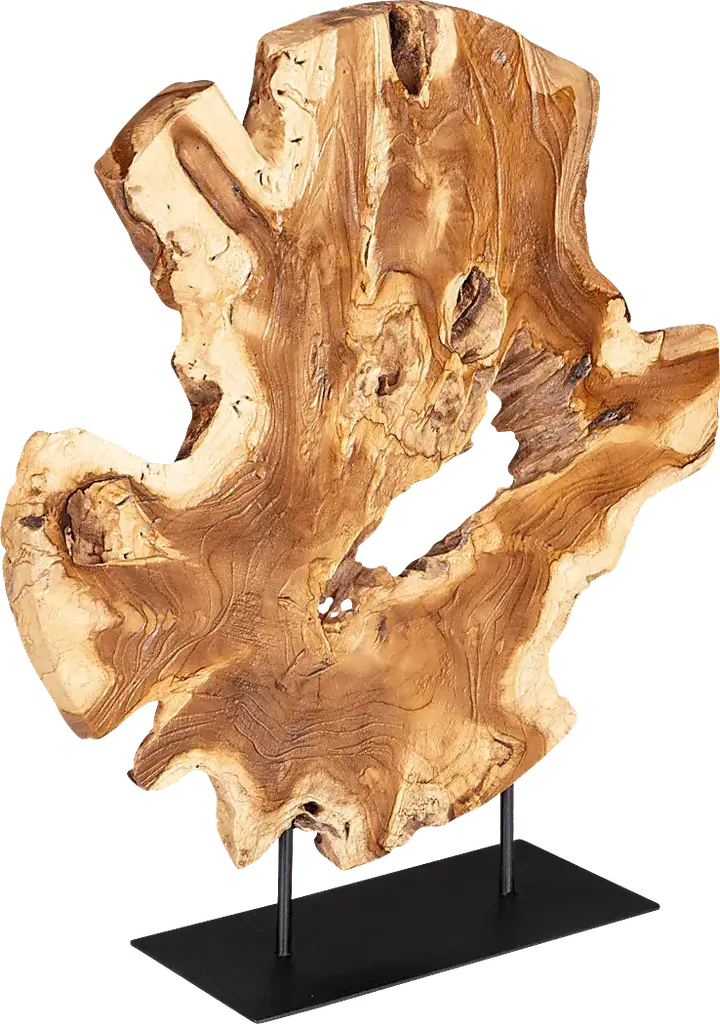 This striking Aramis sculpture, crafted from 100% natural teak wood, showcases a captivating natural finish that beautifully enhances its organic texture. Set on a sleek black base, it creates a stunning contrast that elevates any decor. Perfect as a centerpiece or accent piece, this unique artwork brings a touch of nature-inspired elegance to your space. Because each is individually handcrafted, natural variation will occur from piece to piece.
