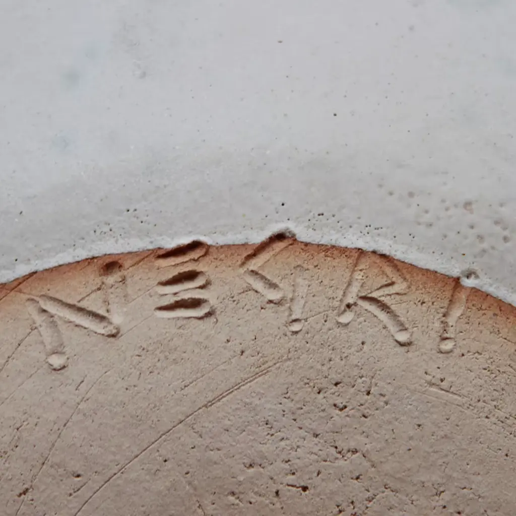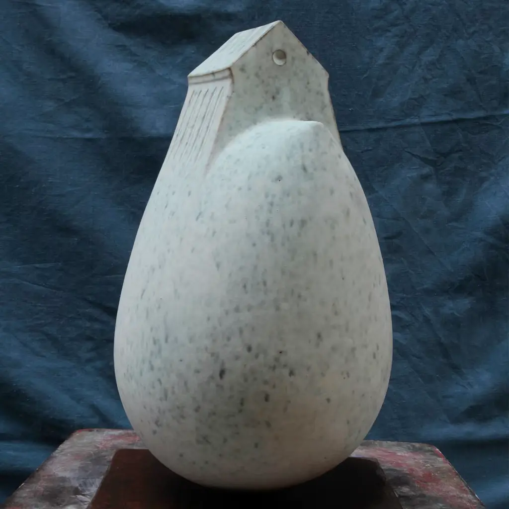 This exquisite ceramic sculpture is crafted using the coiling technique and cooked at 2190 degrees Fahrenheit, then finished with cinder-based enamels. The inside is hollow, like a vase and the base is in iron. This one-of-a-kind piece represents an ark and symbolizes the element that carries life.