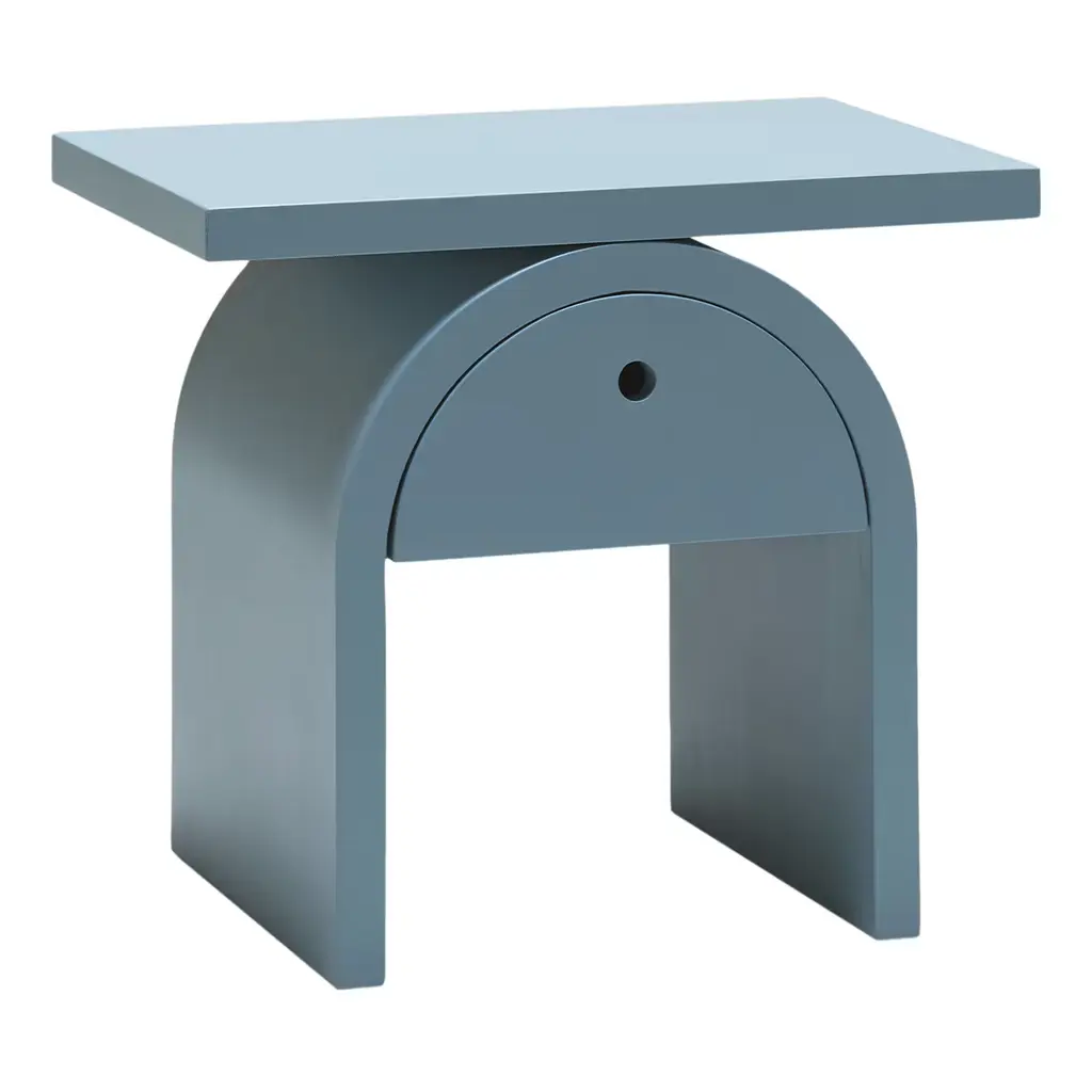 Flaunting a silhouette recalling that of a contemporary sculpture, this stylish nightstand will bring a pop of color to bedroom decors. The MDF structure is entirely lacquered in matte apple-green and consists of a rectangular top seemingly resting in unstable equilibrium on the arched element providing support and incorporating the drop-leaf, semicircular door. The piece is available in multiple color options, please inquire with the Concierge for details.