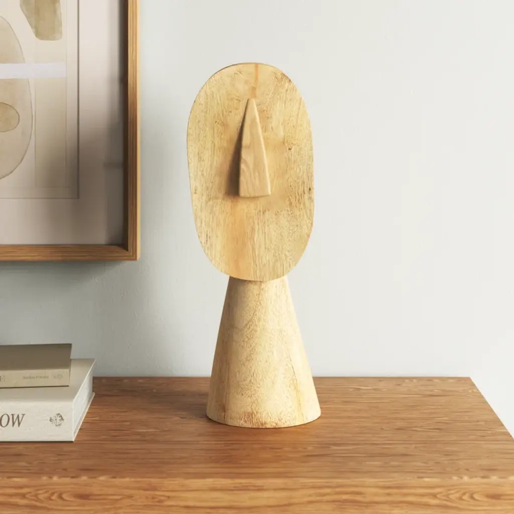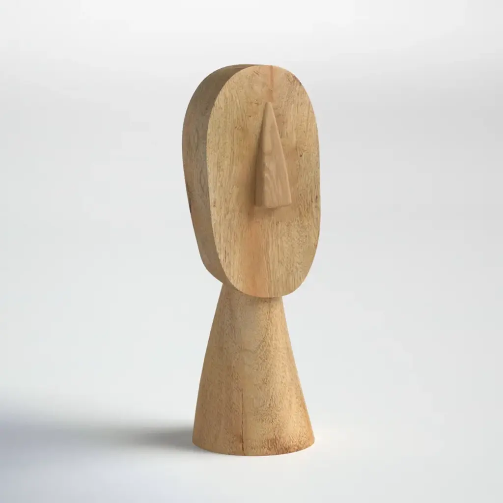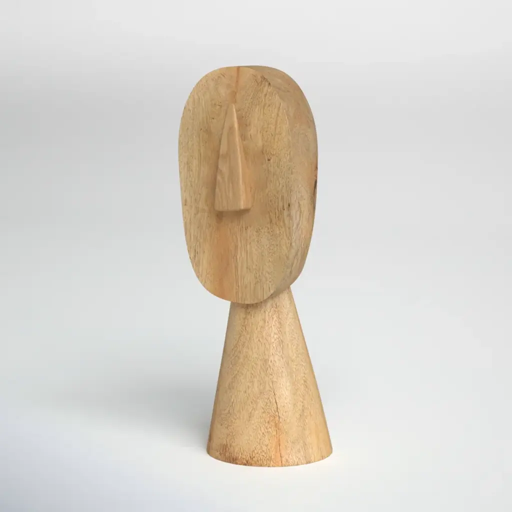 A large head sculpture that has been artfully hand-carved entirely out of mango wood in a light brown finish. Incorporate global influence into your design aesthetic and pair it with your favorite vases and objects, or complement it with the large head sculpture. These head sculptures are hand-carved, making each piece unique. Please expect variations as mango wood is a natural material with its own beautiful intricacies.