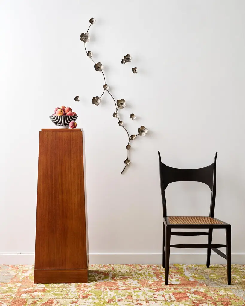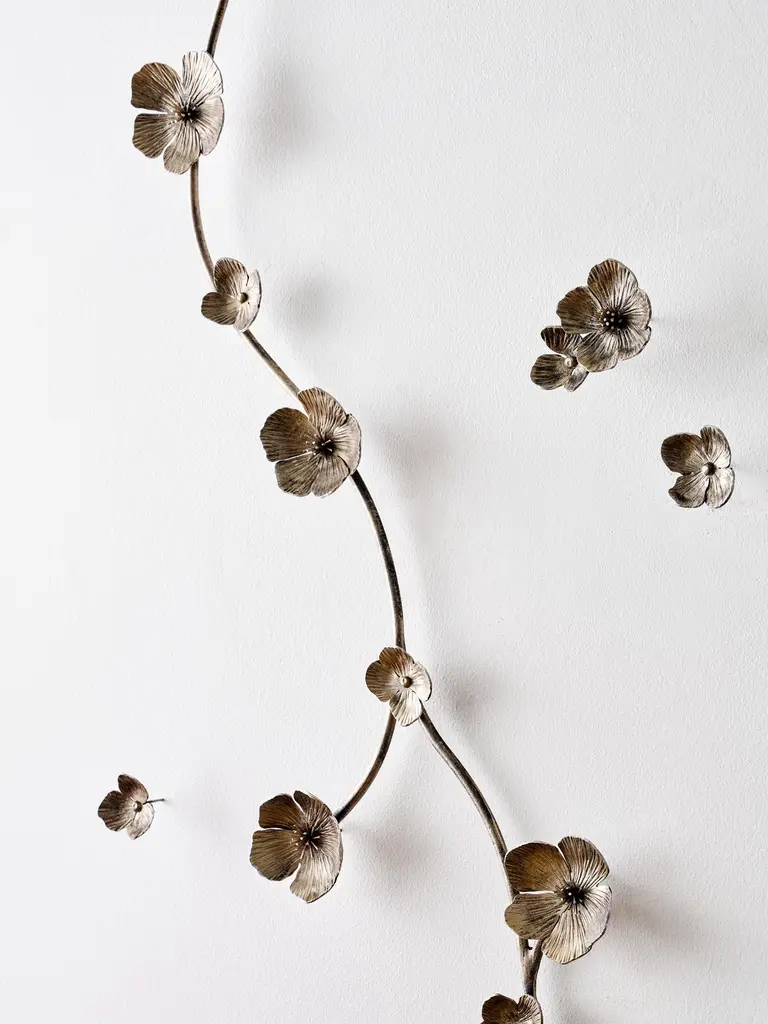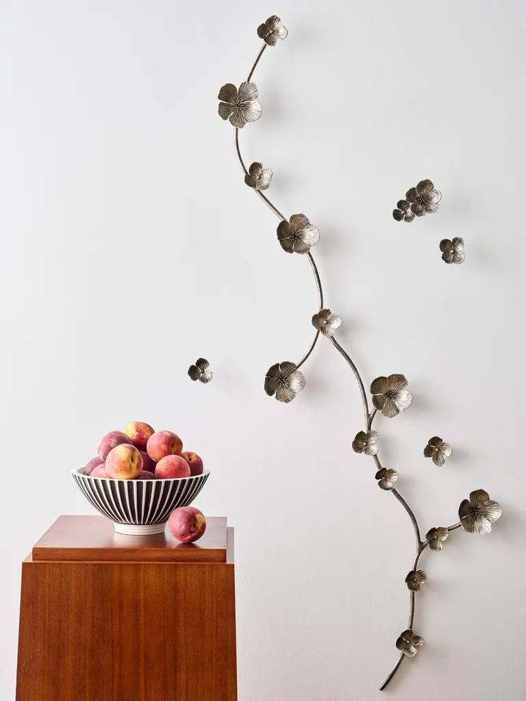 Elevate your space with the Aria Floral Wall Sculpture—a handcrafted metal art piece that captures the essence of botanical beauty. This botanical wall sculpture brings a sense of organic elegance to any room. Inspired by the graceful flow of an aria in music, the design features a harmonious blend of flowers and vines, creating a visual symphony on your wall.Perfect for high-end interiors, the Aria Floral Wall Sculpture adds character and sophistication to living rooms, entryways, or any space that needs a touch of natural art. Each piece is meticulously crafted by skilled artisans, ensuring a one-of-a-kind masterpiece that embodies heirloom quality.Each piece is unique, with slight variations, due to the artisan nature of our handcrafted finishing process. Handmade in the U.S.A., it ships in 6-8 weeks. Please inquire if interested in a custom layout or different finish.