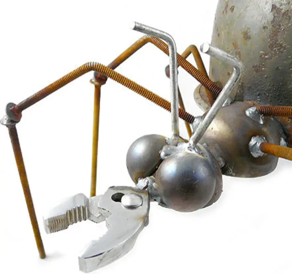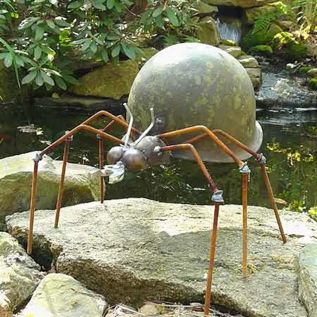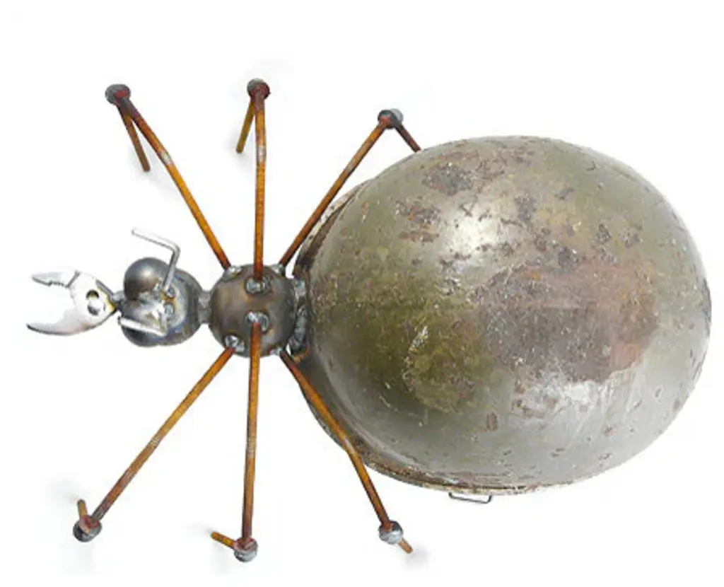 About the Army Ant Place an Army Ant on active duty in your garden - he''ll invade with ingenuity and serve to provide your yard with the perfect touch of creativity!Made with recycled metals, including a wrench for mandibles and an authentic World War II army helmet as the abdomen, the Army Ant Sculpture stands approximately 12" tall and 17" long. Used outdoors, a rust patina will develop naturally on most of the metal sections. Handcrafted in Utah.Note: Due to the vintage nature of the recycled army helmet, the helmet color will vary slightly between green and brown hues.Handmade in the USAProduct Size (approximate) : 12" tall x 13" wide x 17" long Material : mixed metals, including steel