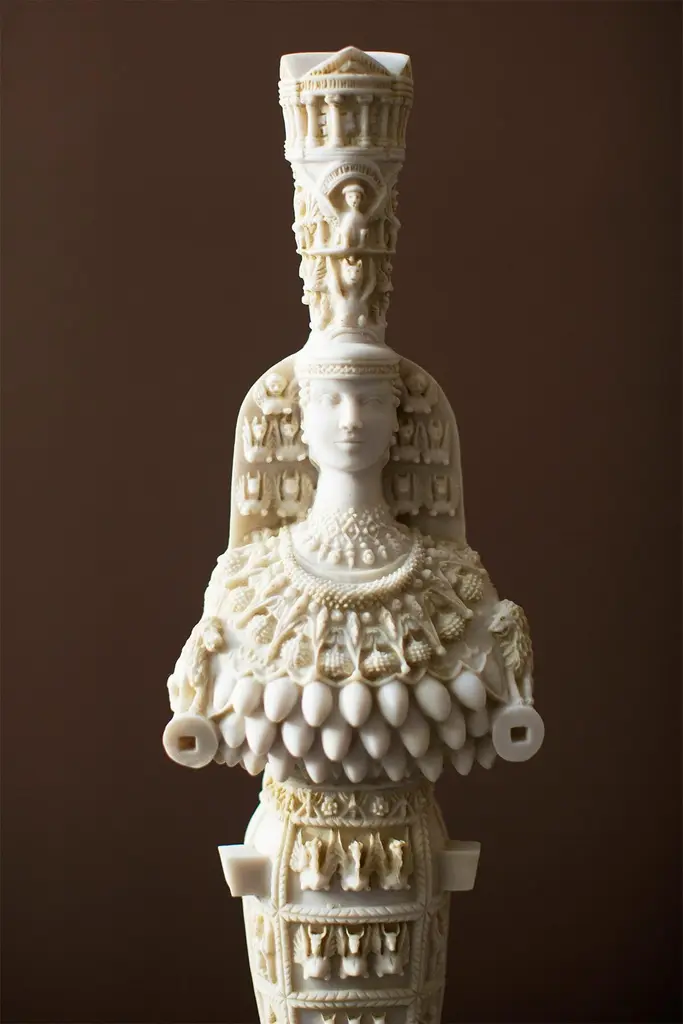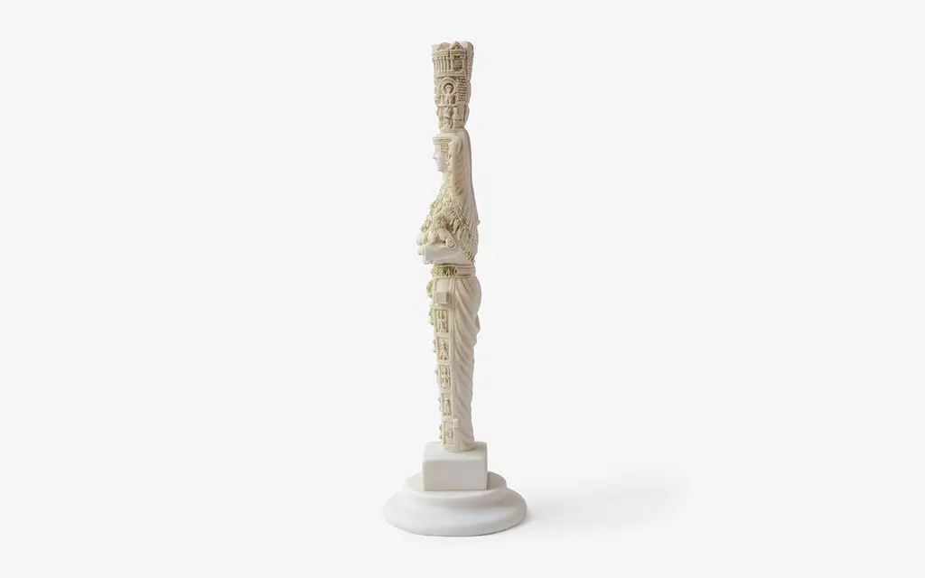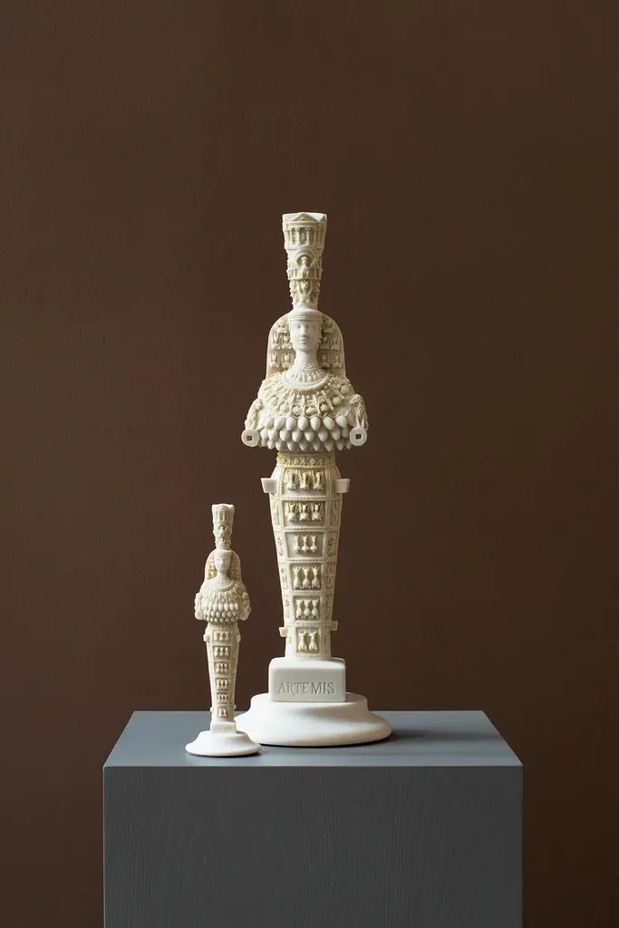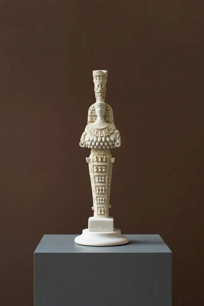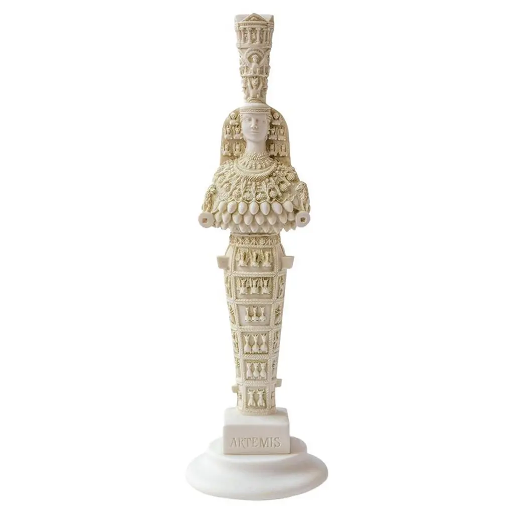 Measures: height: 56 cm / Weight: 4 kgAs a fertility god, Artemis was particularly revered in Ephesus, close to Ortygia, believed to be his birthplace. Here, her cult included eastern elements (borrowed from goddesses such as Isis, Cybele, and the "Lady of the Beasts"), and her principal symbols were the bee, date palm, and deer. Considered one of the Seven Wonders of the Ancient World, the city's famous temple of Artemis (started circa 550 BC) was almost twice the size of Athens' Parthenon when it was finally finished after a century of work. The temple had 127 columns, and the architrave blocks above them, weighing about 24 tons each, were so heavy that the Ephesians admitted that Artemis had helped in the construction. Inside the temple was a giant cult statue of the goddess made of cedar wood. All that remains of the temple today is its foundations and, sadly, a single column erected from the compound remains. -The original is displayed in the Ephesus Museum.-Produced from pressed marble powder.-Produced from the original molds of the works from the museum.-Can be used indoors and outdoors.