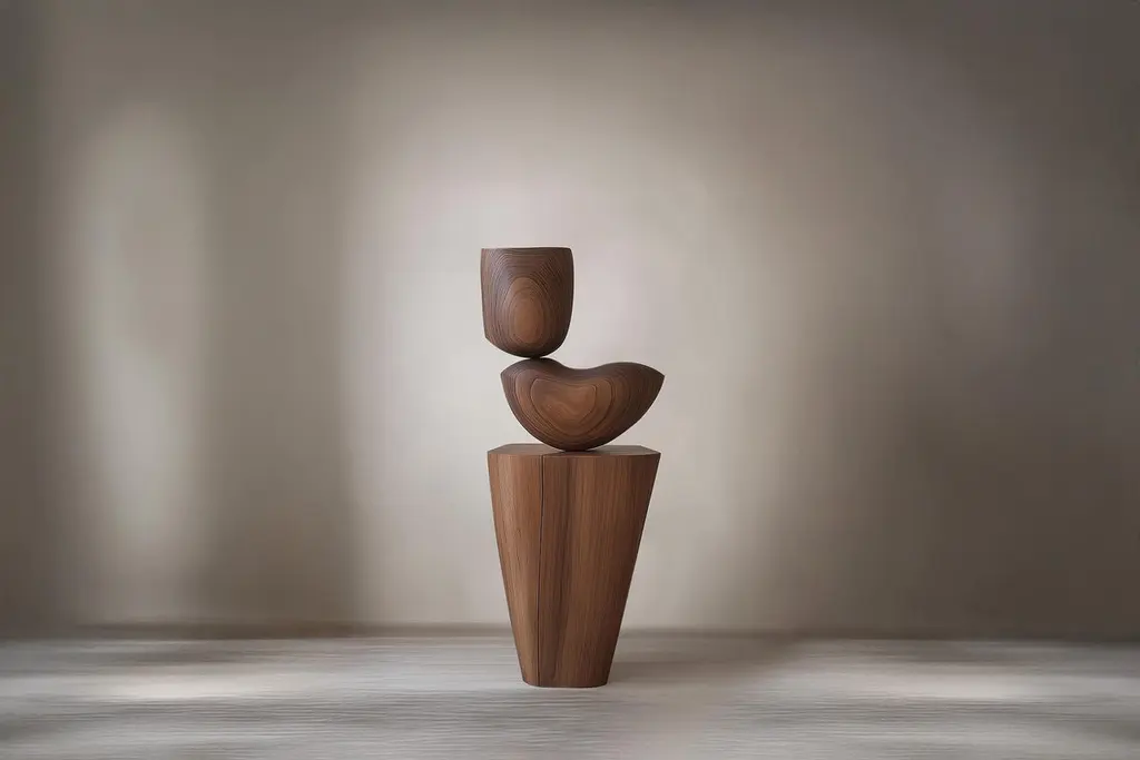 Artistic Feature Lull No83 – Wooden Sculpture by NONO for Contemporary Interiors———Balance and tension are at the core of these sculptures. The interplay between the smooth, rounded forms and solid, angular bases creates a delicate equilibrium that invites contemplation. Fragile elements seem to find strength in their very vulnerability, constantly negotiating their own stillness. The tension remains present, yet never descends into chaos, evoking a quiet pause, a moment of serenity in the motion of life.The juxtaposition of curved, pebble-like shapes against straight-edged bases mirrors the harmony between the organic and the geometric. These forms feel both natural and sculpted, as though shaped by the slow, deliberate hand of nature and the precision of craftsmanship. It’s as if these pieces rest in a moment of perfect balance—a pause between forces that seem at odds, yet together, create something deeper and more profound.This collection embodies a monumental idea—one that celebrates the subtle tension between fragility and endurance. Though the forms may appear delicate, their strength lies in resilience. Each sculpture stands tall and quietly powerful, offering a sense of solace in stillness, a reminder that stability can emerge from the most unlikely structures.These pieces explore the delicate dance between opposing forces, where solace and tension coexist in harmony. The most meaningful moments in life often come from these pauses, from embracing the quiet spaces between movement. These sculptures whisper a truth—that transformation often finds its roots in stillness, in the spaces between tension and release.Each sculpture is crafted from solid wood in our workshop in Mexico City, ensuring no two pieces are ever alike—not only in form, but also in the natural texture and tone of the wood itself. Just as no two trees are the same, each piece carries its own unique character, shaped by the grain and color variations of the wood. This natural diversity is what makes each sculpture truly one-of-a-kind. These works are made to order, allowing the time and care needed to ensure that every piece reflects its own individuality and beauty, celebrating the organic and the serene pause within the material.——NONO is a Mexican design brand with more than 10 years of experience dedicated to the production of interior furnishings, editions, and custom-made projects. At NONO, we create pieces of extraordinary beauty, accommodating the particular needs and tastes of each client with exclusive high-quality designs.————Some details to consider when placing an order with us:• Catalog images are digitally generated. Actual products may slightly vary in texture, grain, and final finish due to natural material differences. Despite these variations, our expertise ensures each piece maintains high quality and matches the intended design.• All of our products are made to order, and the lead time for standard products is estimated to be 9 to 12 weeks, plus shipping time. However, special pieces or sculptures may require a longer lead time.• We offer customization in dimensions and finish for all of our furniture pieces, which may result in additional charges.• We only facilitate freight services by a third party. The client is solely responsible for any associated import/export taxes, as well as any necessary customs paperwork.• We are not responsible for any damages that may occur during shipping or for any customs-related delays.